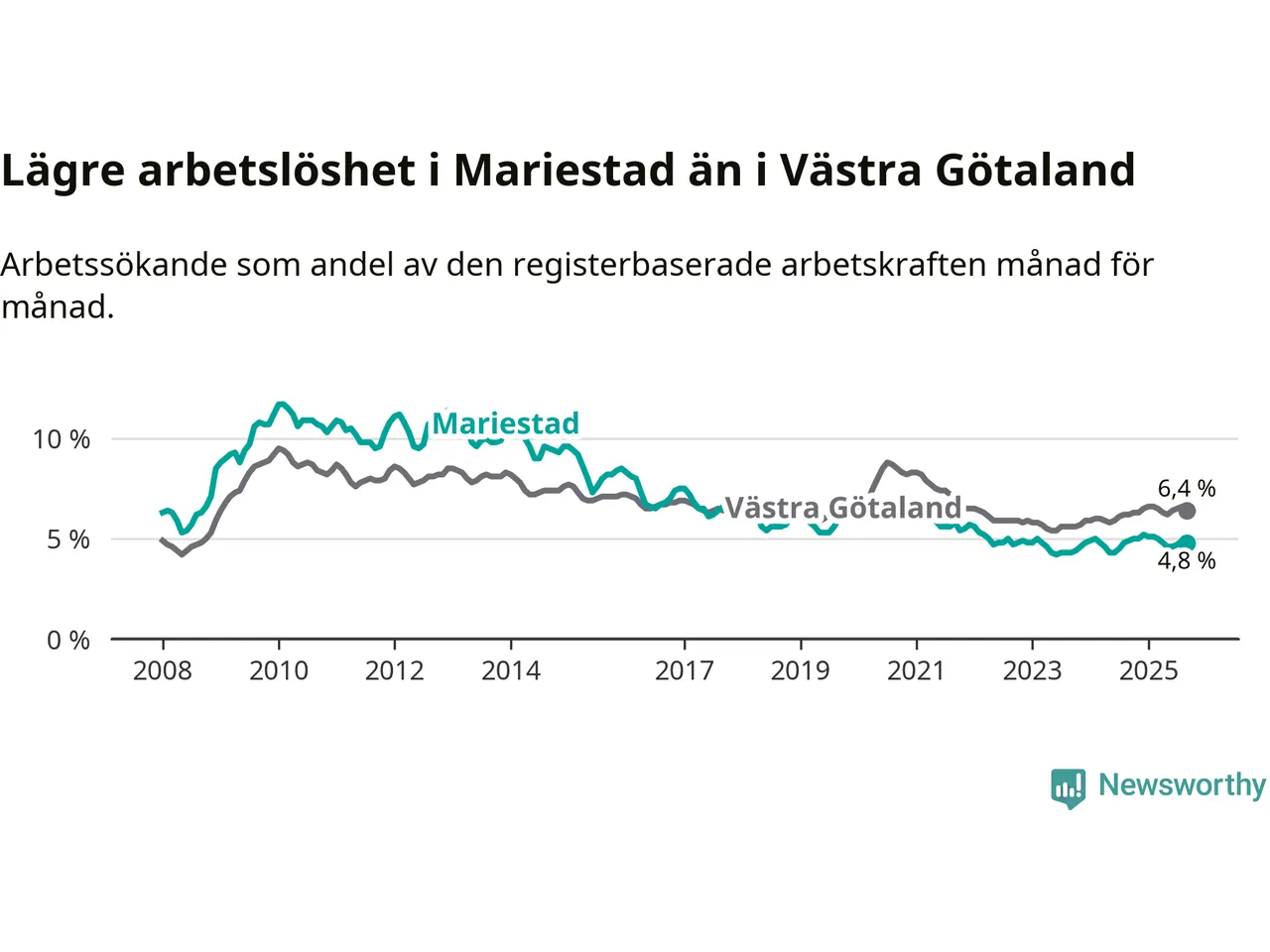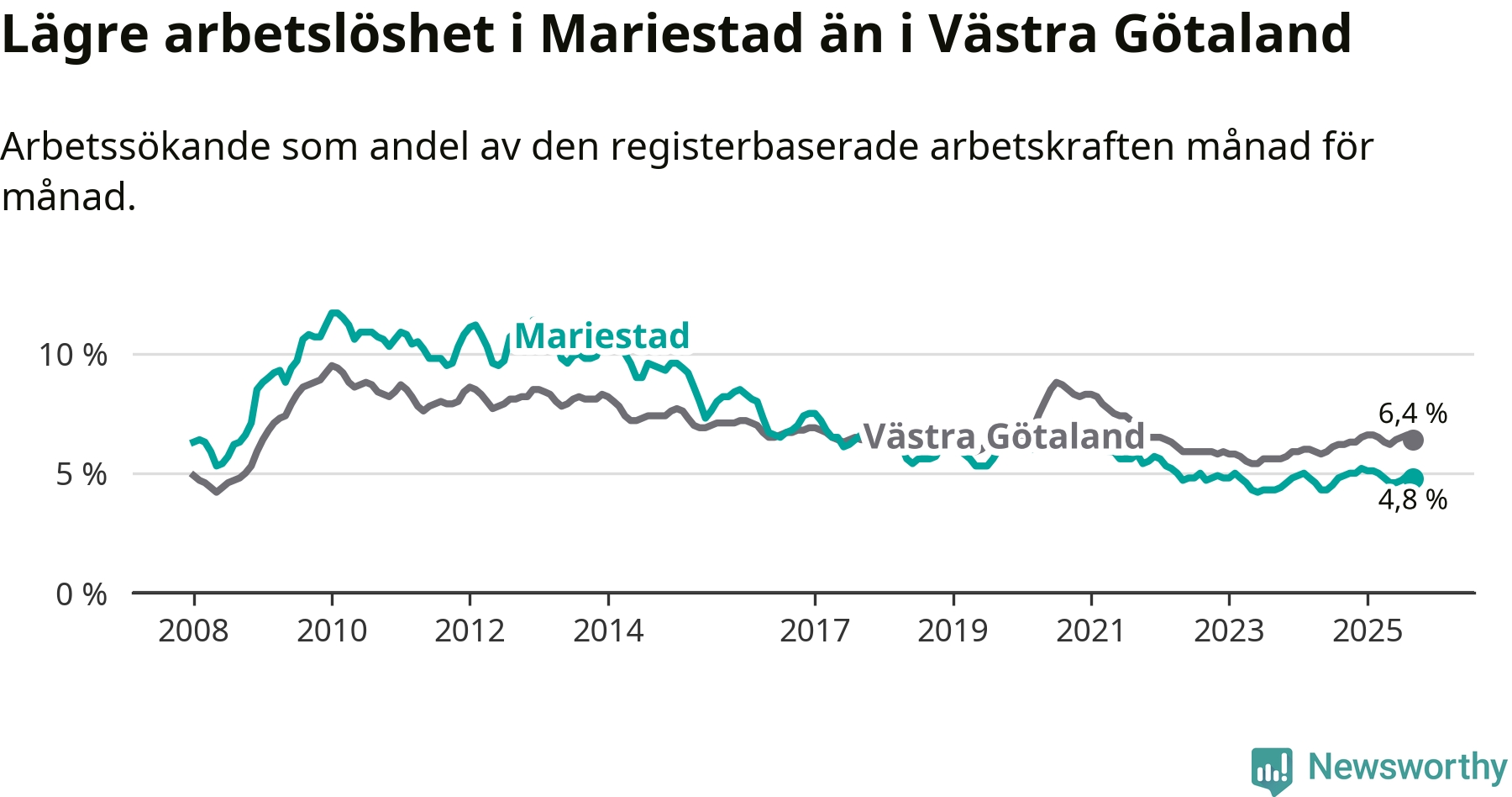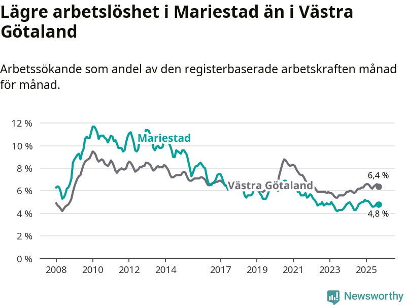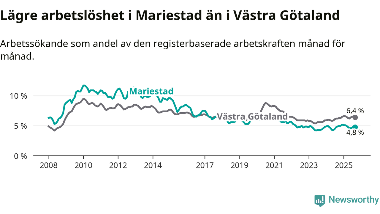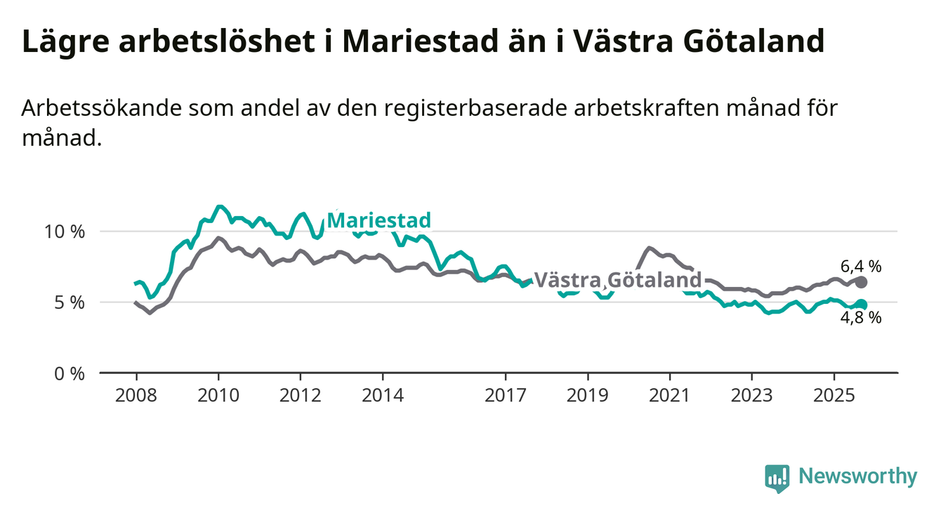 Graf: Arbetslöshet i Mariestads kommun och Västra Götalands län