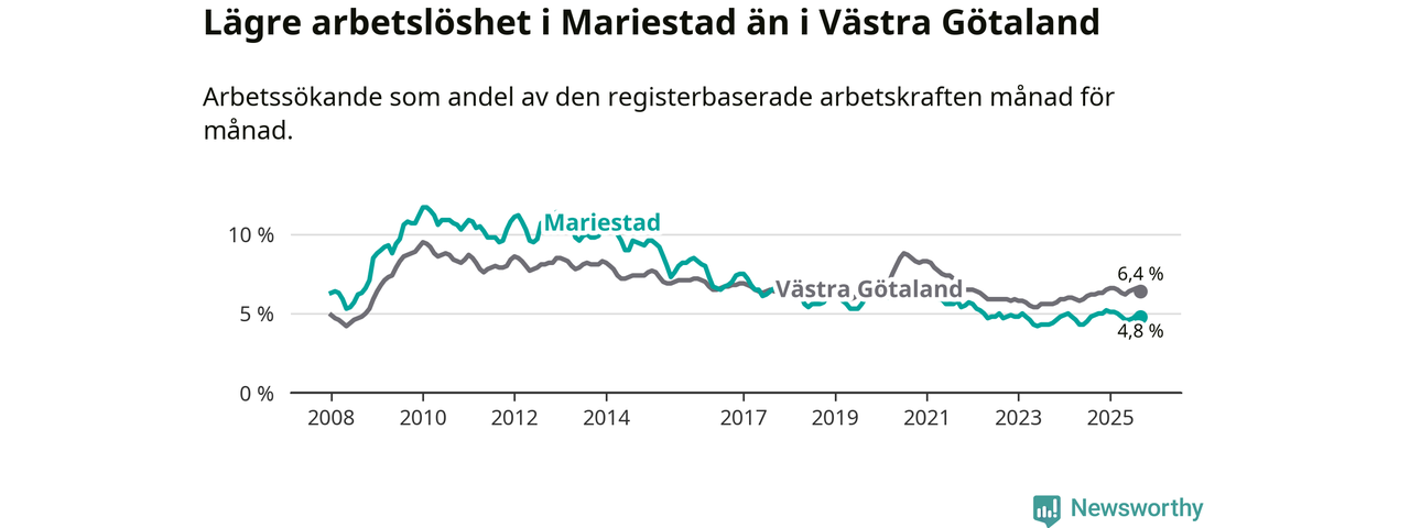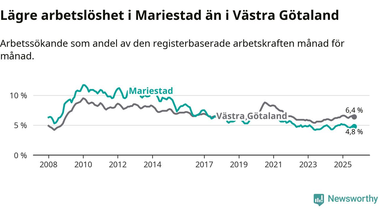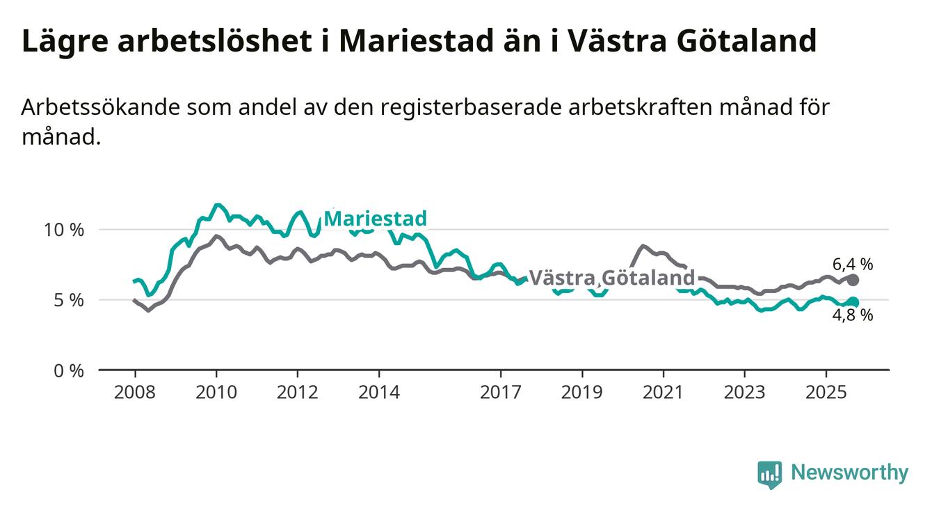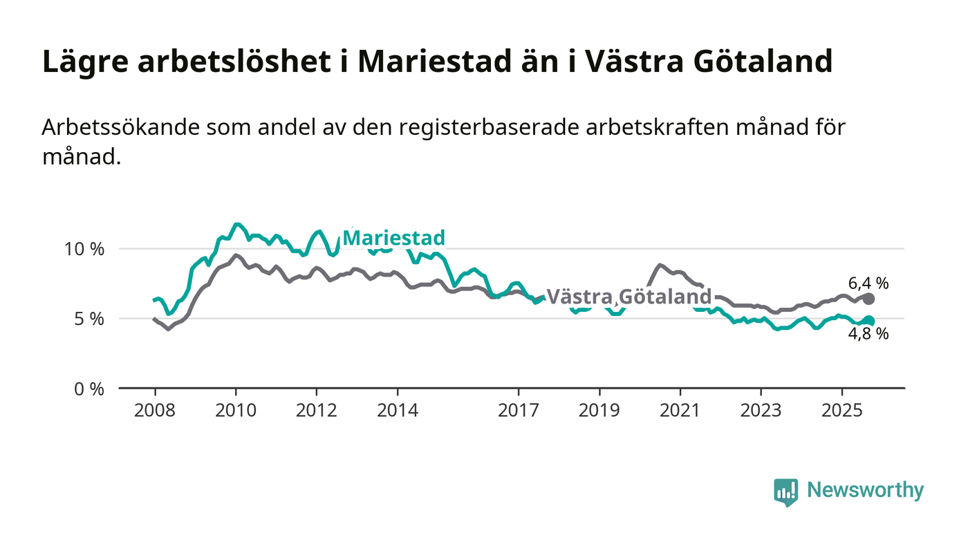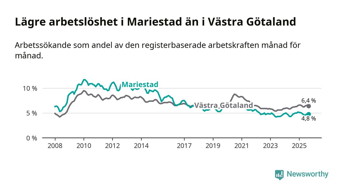 Under september månad rapporterade Mariestads kommun en total arbetslöshet på 4,8 procent. Det är en minskning jämfört med samma tidpunkt i fjol (−0,1 procentenheter). I Västra Götalands län däremot stiger arbetslösheten .