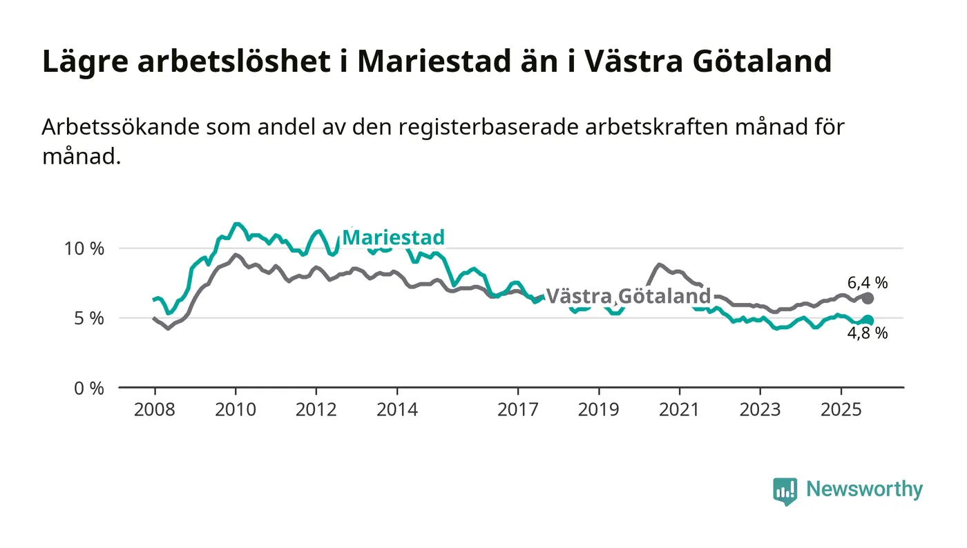 Mariestad hade redan tidigare lägre arbetslöshet än snittet i hela Västra Götalands län och nu växer klyftan (4,8 procent i kommunen, jämfört med 6,4 procent i hela länet). Öckerö har den lägsta arbetslösheten i länet (2,7 procent), medan Gullspång har den högsta (8,5 procent). För att Mariestad skulle komma ner i samma arbetslöshetsnivå som Öckerö skulle 249 personer behöva sysselsättas.