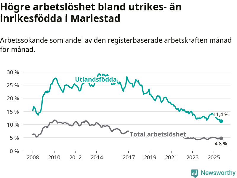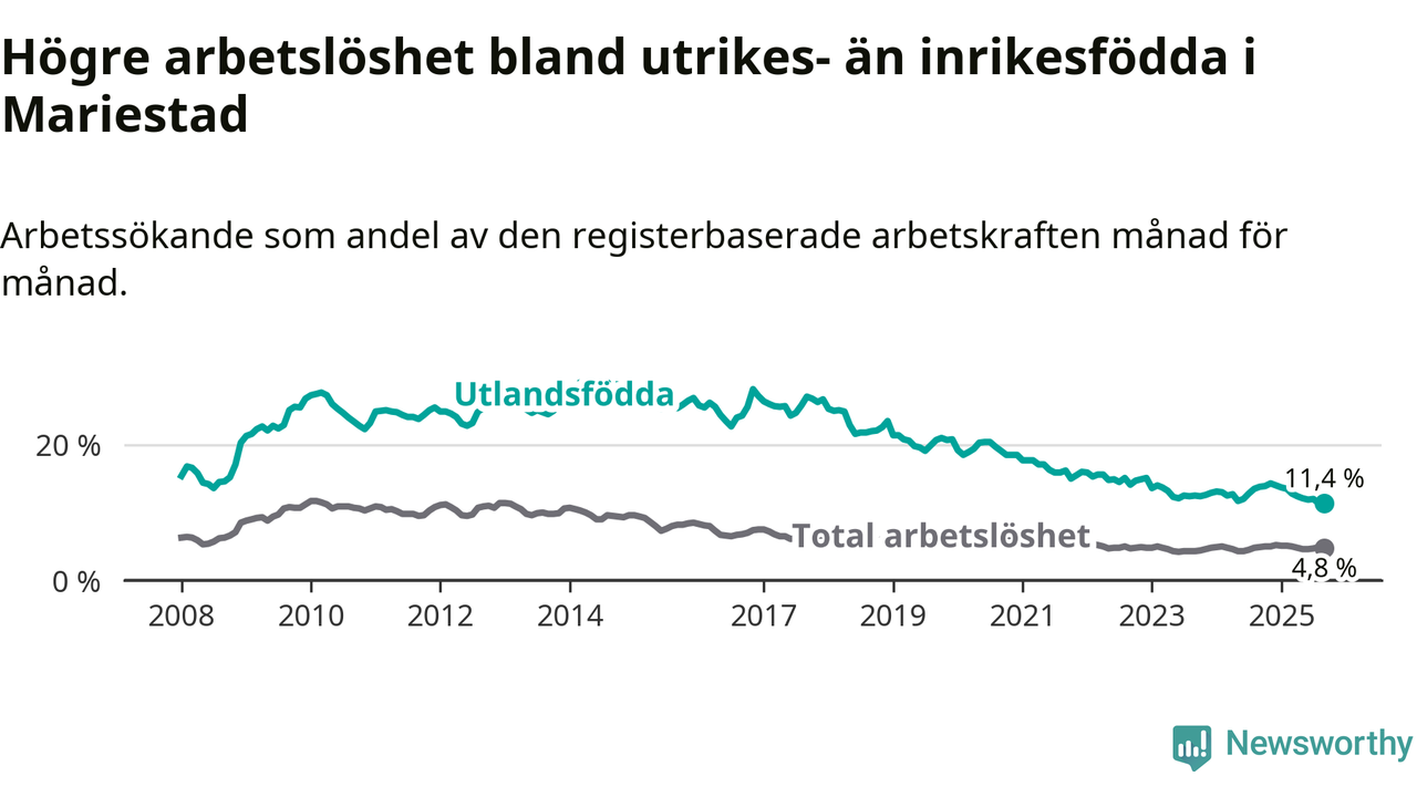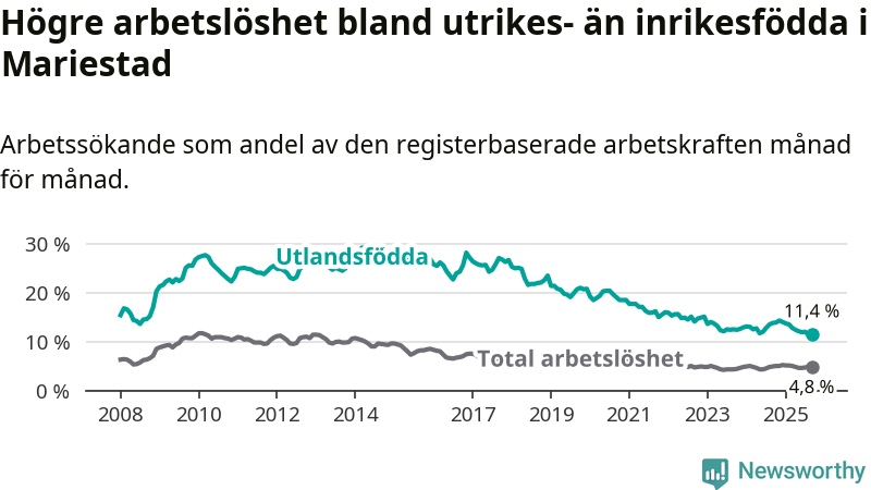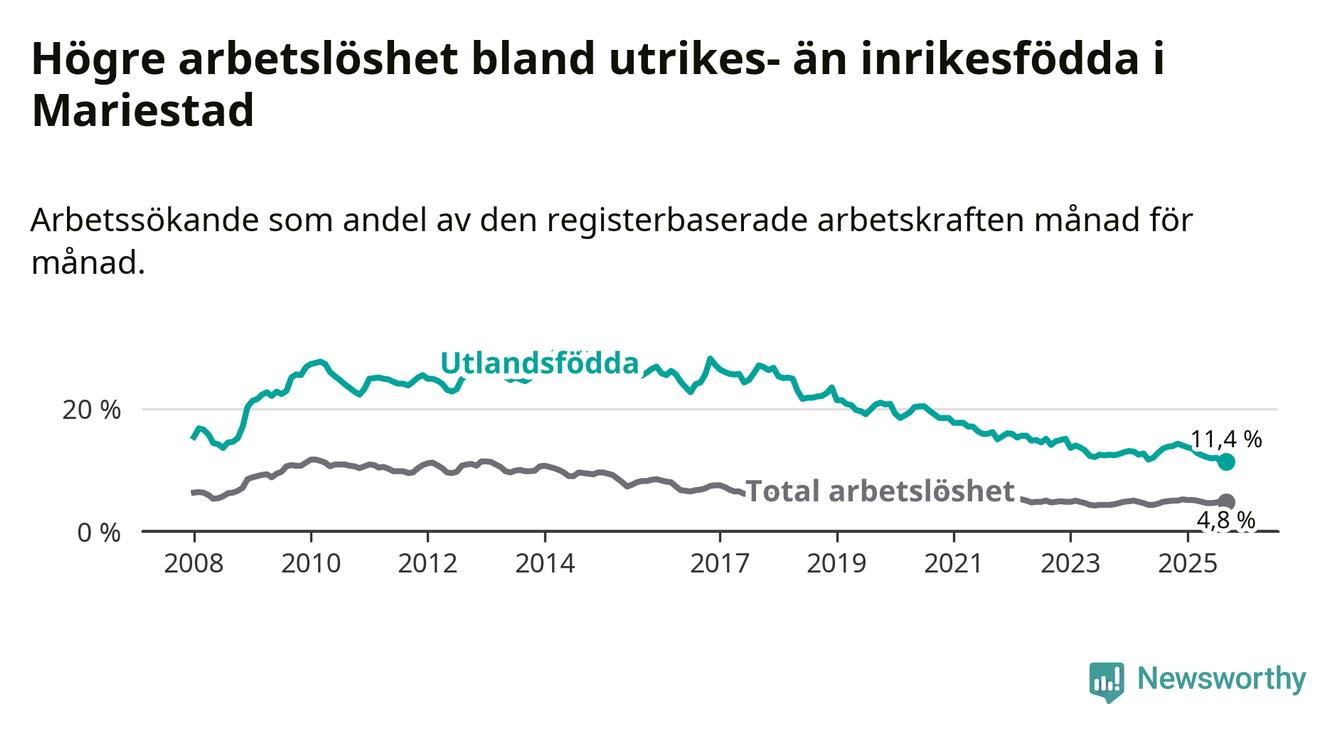 Arbetslösheten bland utlandsfödda var 11,4 procent i Mariestad under september månad, motsvarande 185 av 1 623 personer. Det är 2,4 procentenheter färre än vid samma tidpunkt i fjol (−38 om man räknar personer).