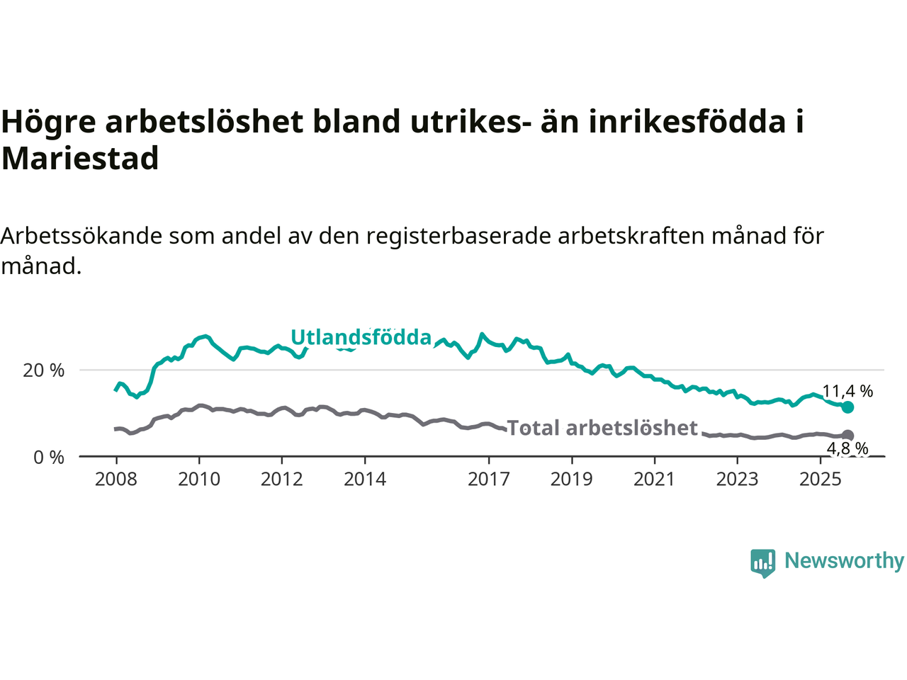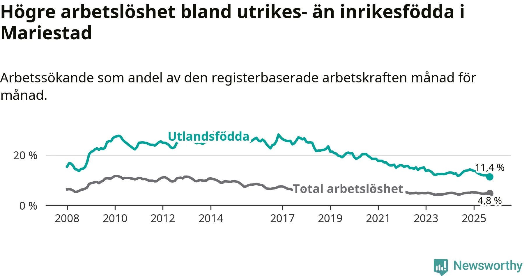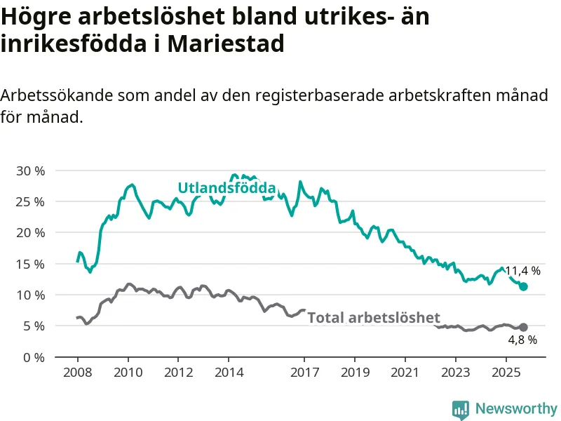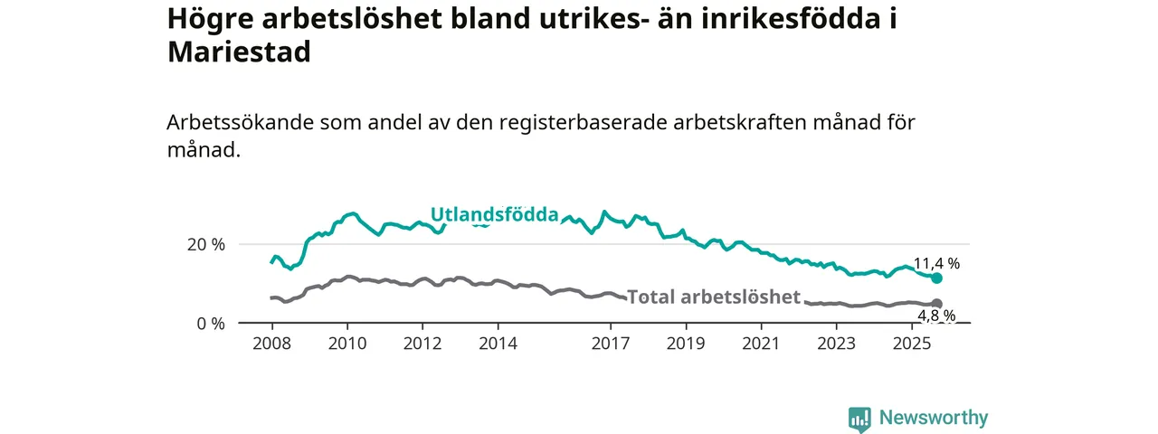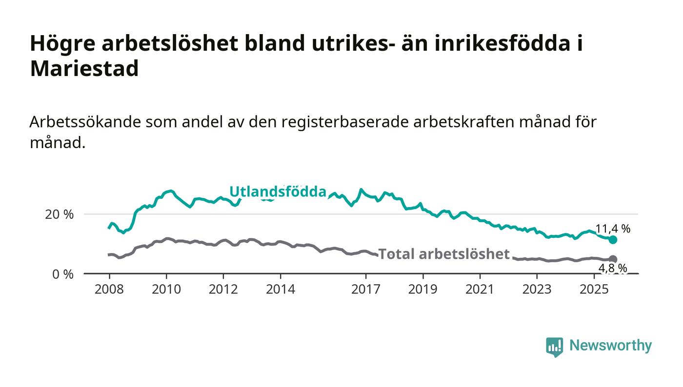 Skillnaden i arbetslöshet mellan utrikesfödda och hela befolkningen är 6,6 procentenheter i Mariestad. Det är en betydligt mindre skillnad än för ett år sedan (−2,3 procentenheter).