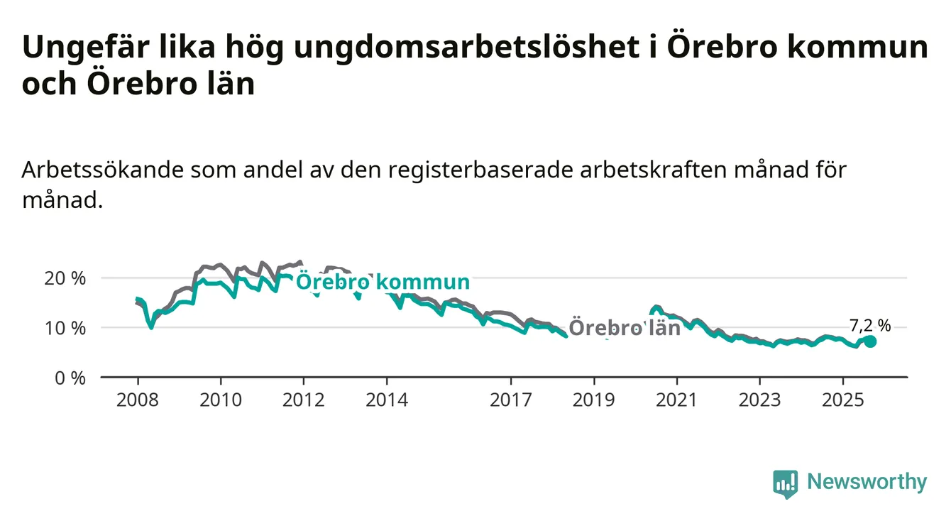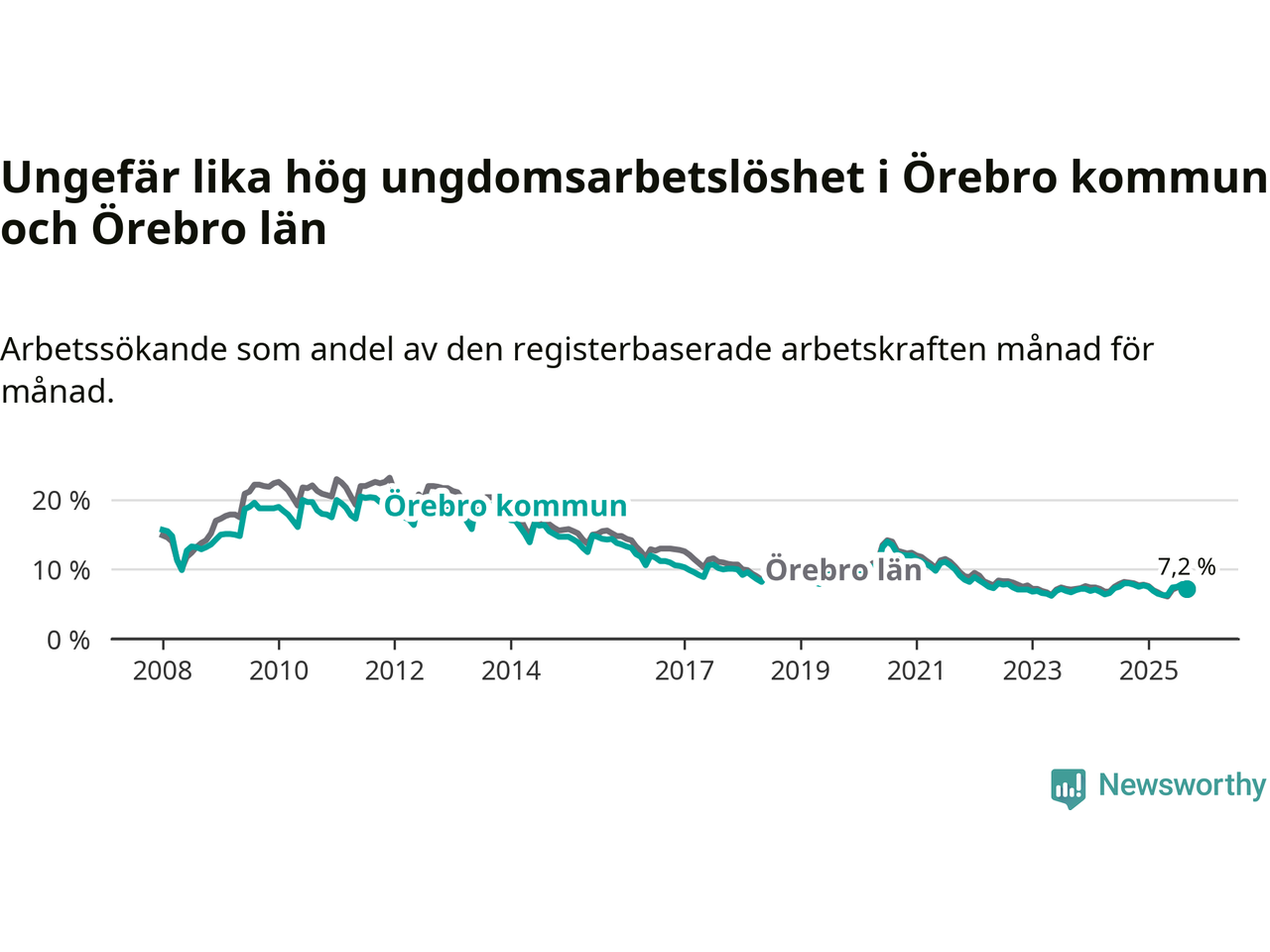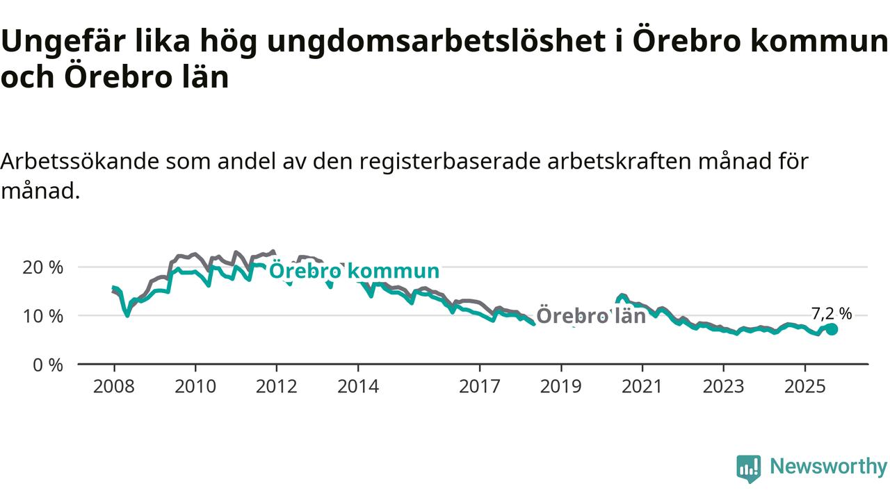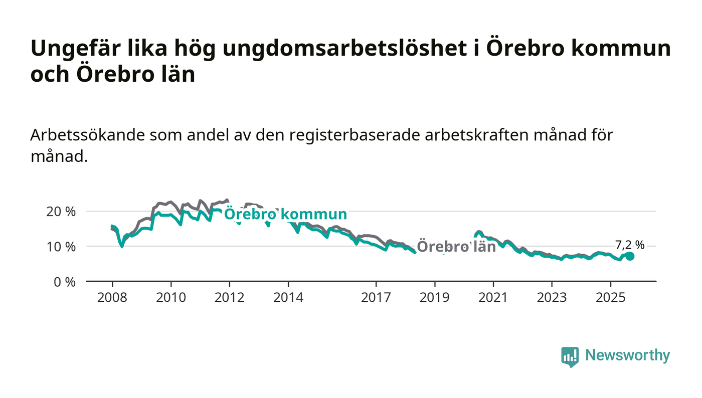 Medan Örebro har högre total arbetslöshet än Örebro, ligger ungdomsarbetslösheten på i stort sett samma nivå.