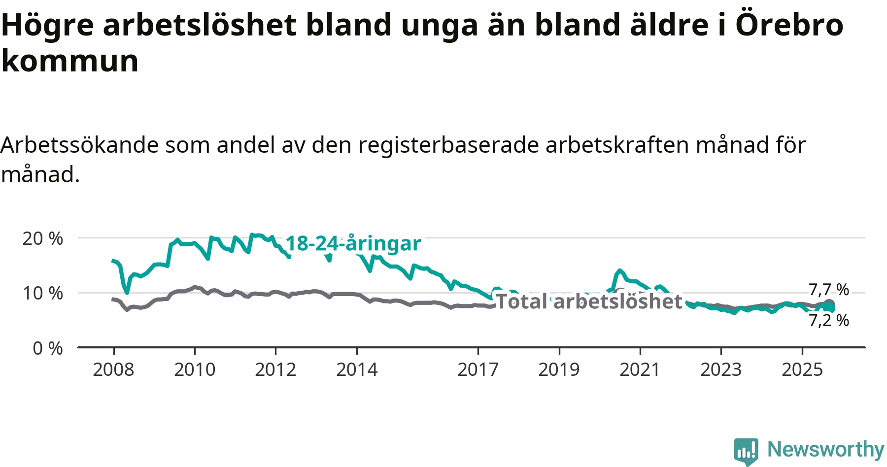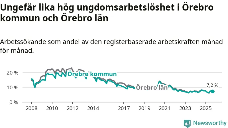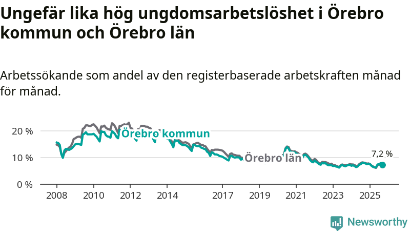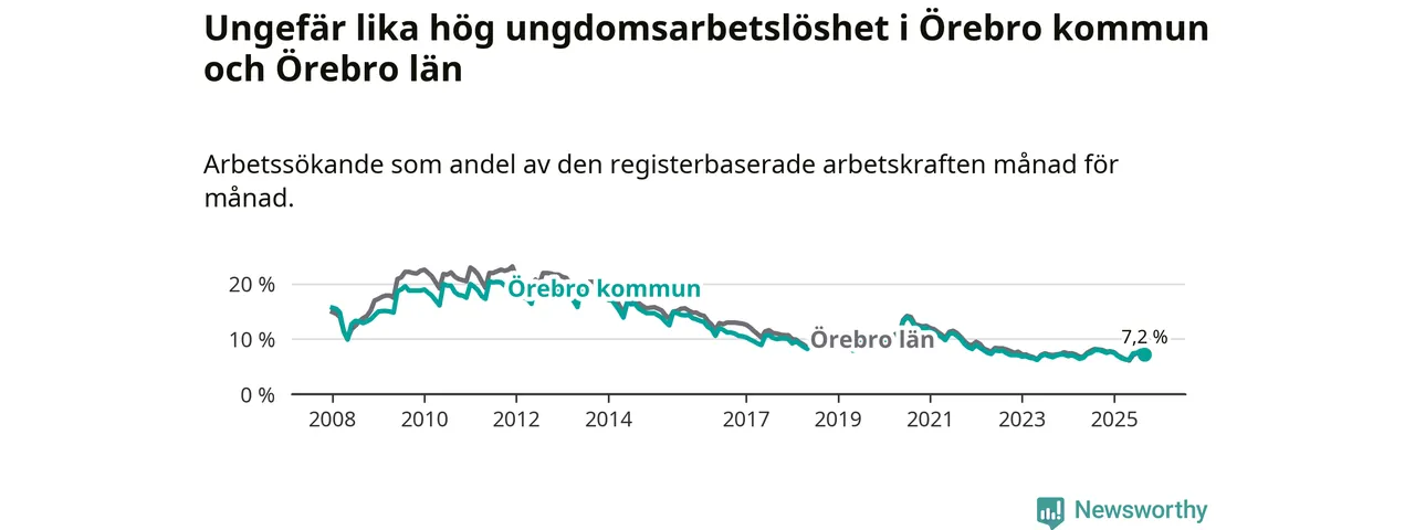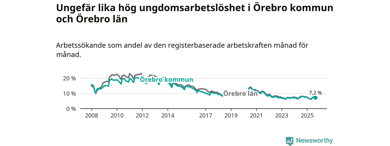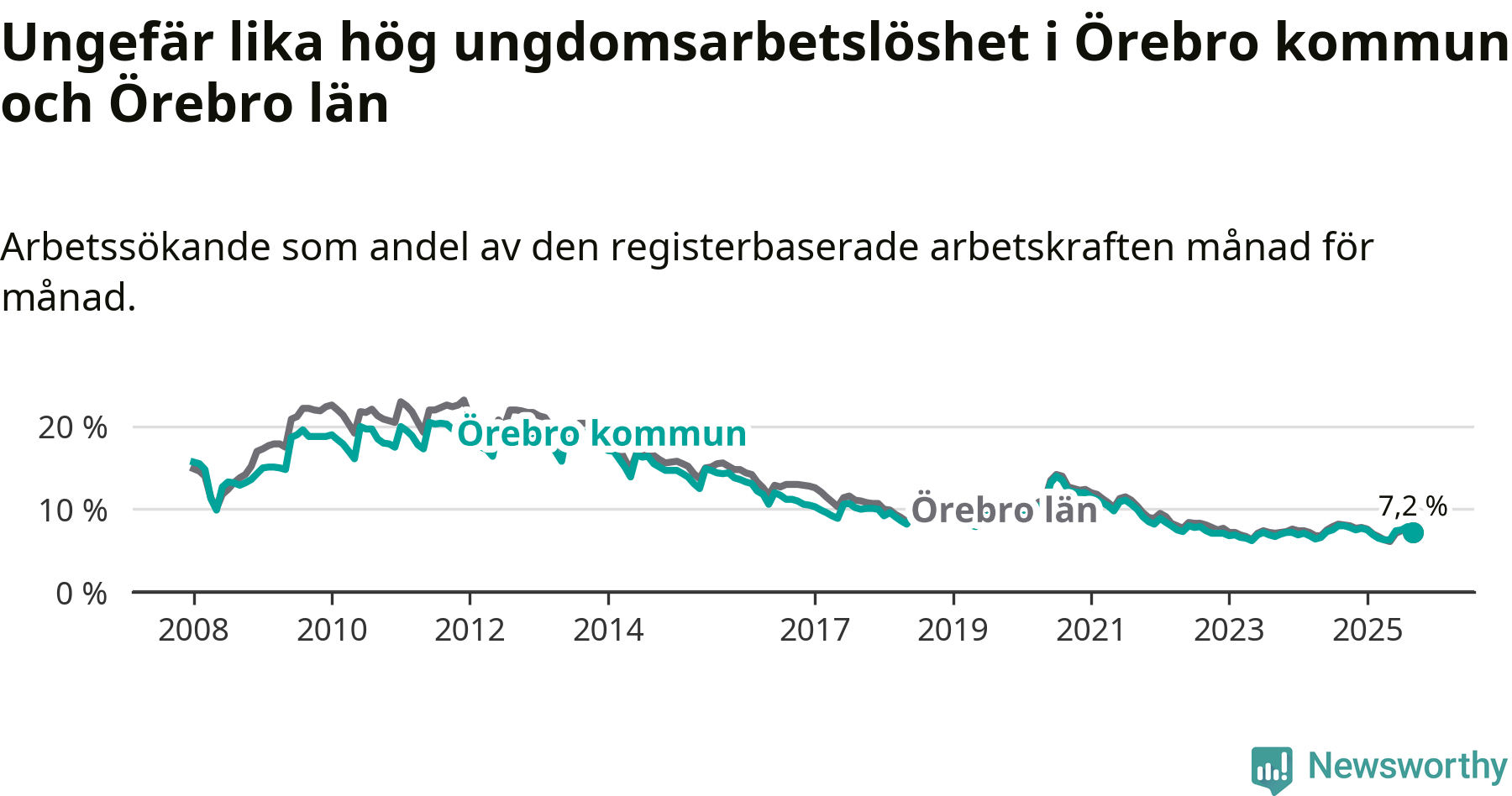 Medan Örebro har högre total arbetslöshet än Örebro, ligger ungdomsarbetslösheten på i stort sett samma nivå.