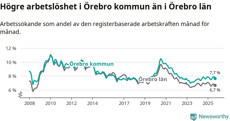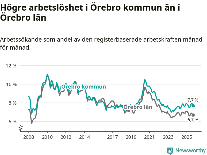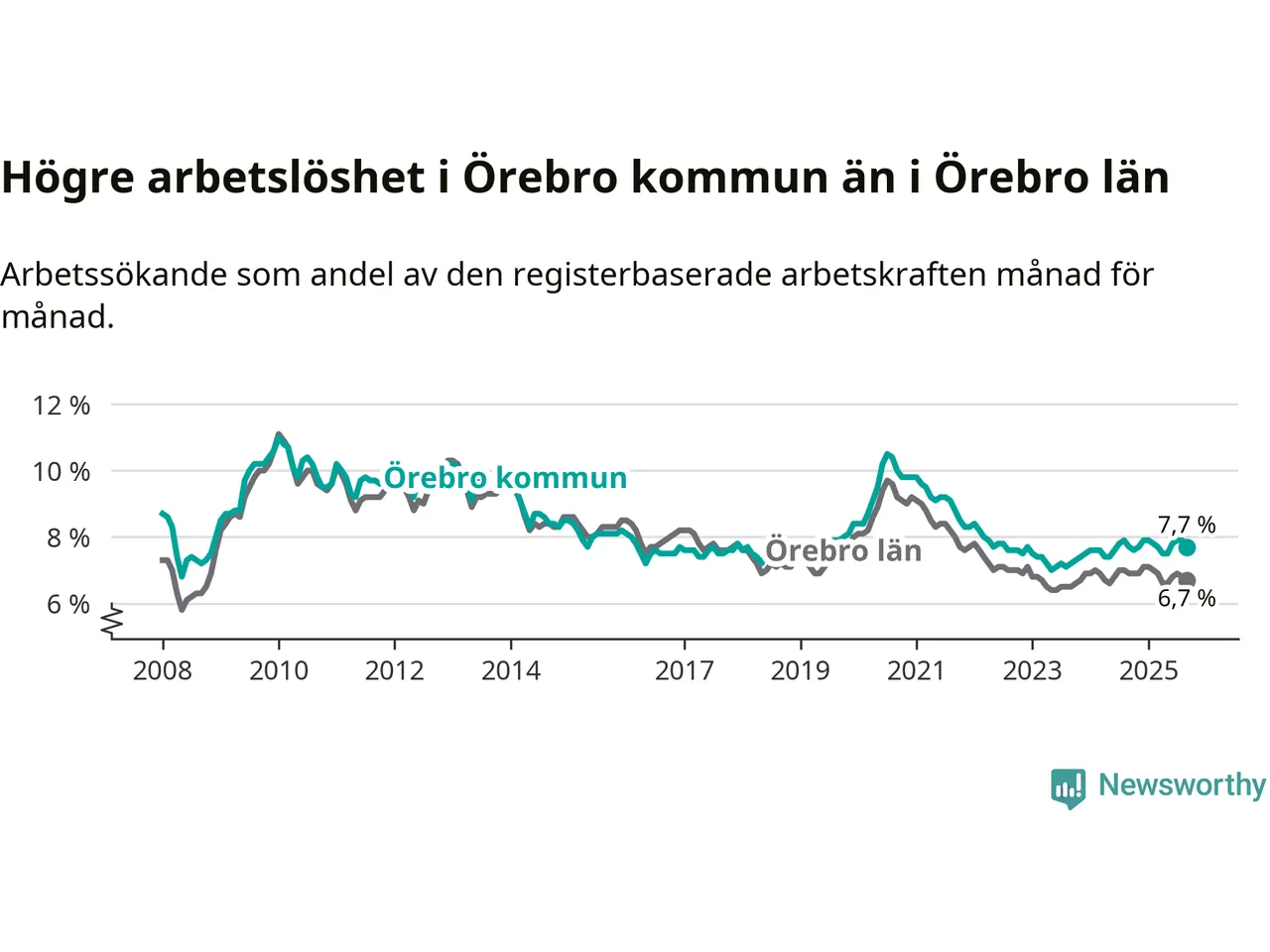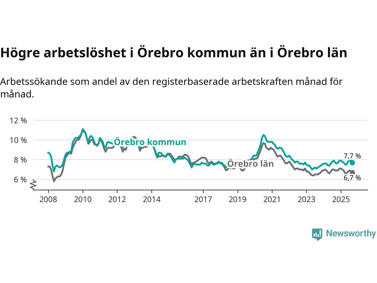 Arbetslösheten i Örebro ligger över nivån i hela Örebro län (7,7 procent i kommunen, jämfört med 6,7 procent i hela länet). Örebro har därmed även den högsta arbetslöshetsnivån i länet. Askersund har den lägsta (4,0 procent). För att Örebro skulle komma ner i samma arbetslöshetsnivå som Askersund skulle 3 026 personer behöva sysselsättas.