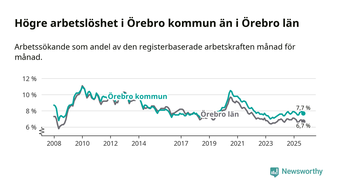 Örebro går därmed mot strömmen i förhållande till andra kommuner i Örebro län. I de flesta andra kommuner i länet går arbetslösheten nedåt. Störst är minskningen i Laxå, där arbetslösheten sjunker med 1,2 procentenheter. I tabellen längre ner ser du utvecklingen i samtliga kommuner i länet.