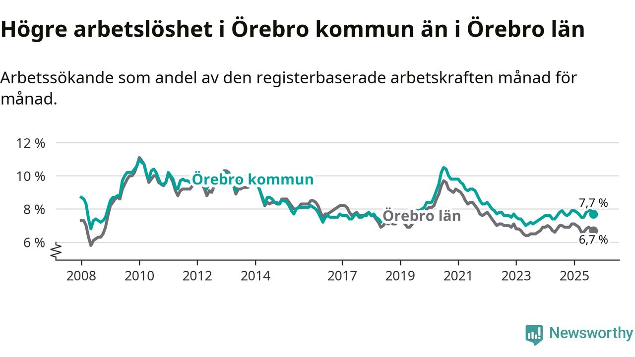 Under september månad rapporterade Örebro kommun en total arbetslöshet på 7,7 procent. Det är i samma nivå som i september i fjol. I Örebro län däremot sjunker arbetslösheten
