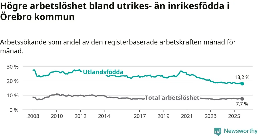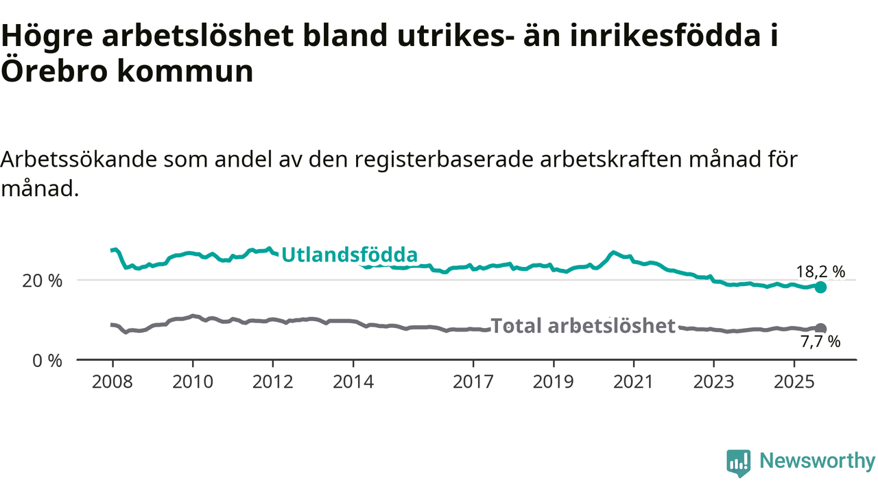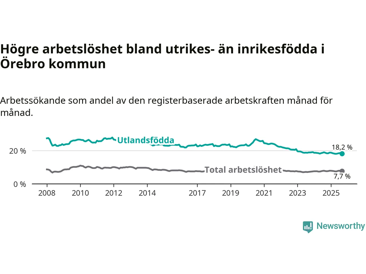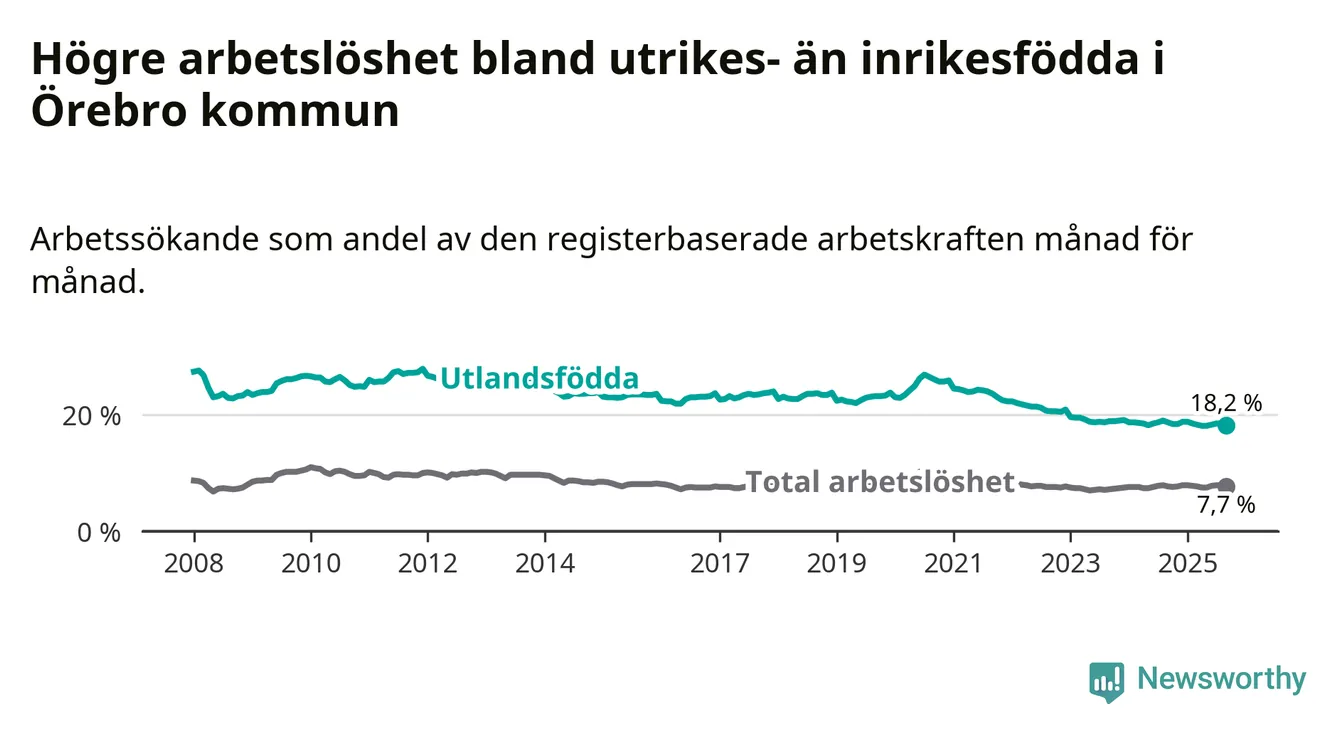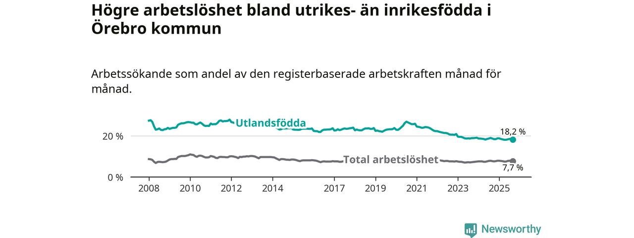 Skillnaden i arbetslöshet mellan utrikesfödda och hela befolkningen är 10,5 procentenheter i Örebro. Det är en mindre skillnad än för ett år sedan (−0,5 procentenheter).