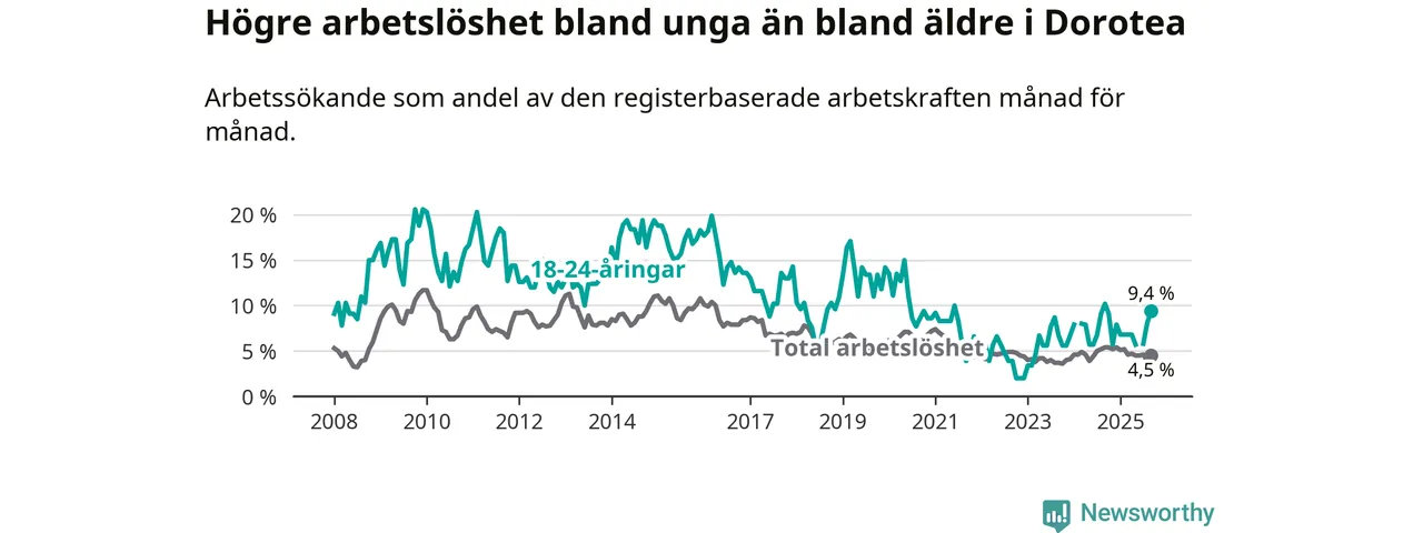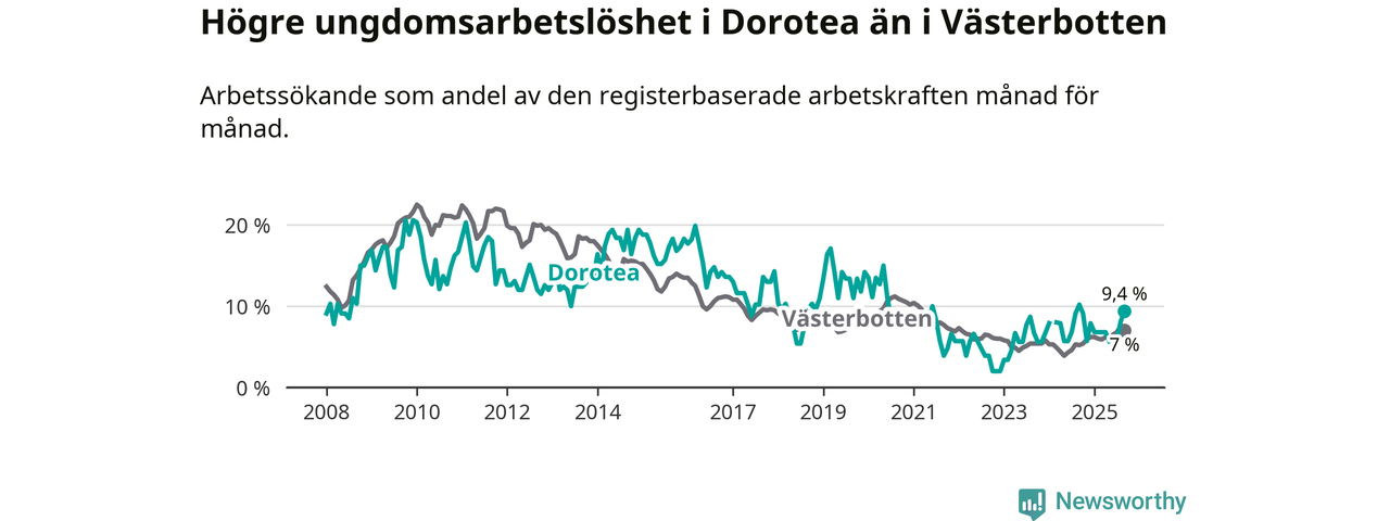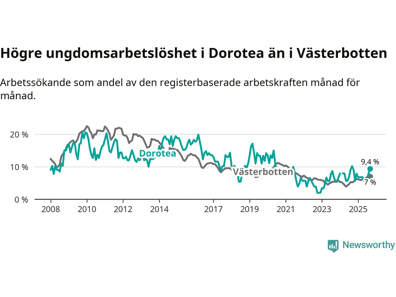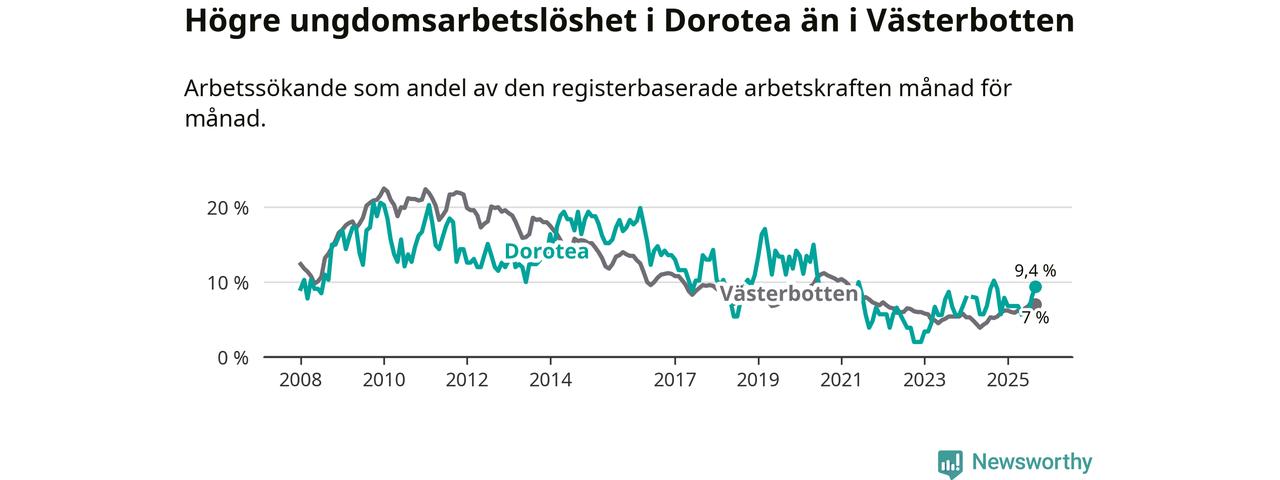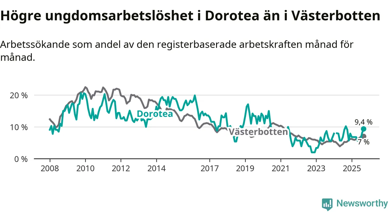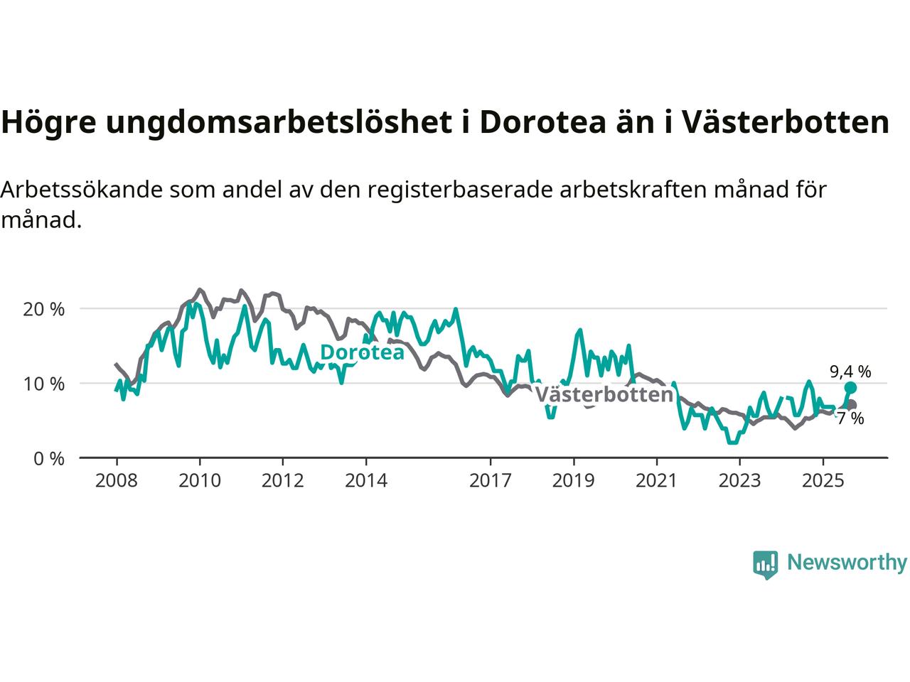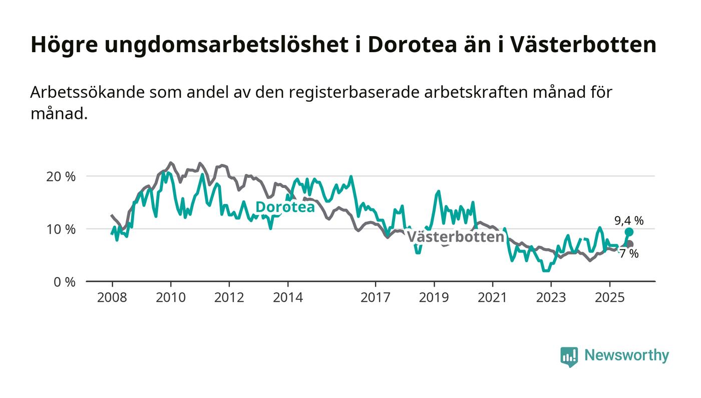 Medan Dorotea har lägre total arbetslöshet än Västerbotten, ligger ungdomsarbetslösheten 2,4 procentenheter högre i Dorotea.