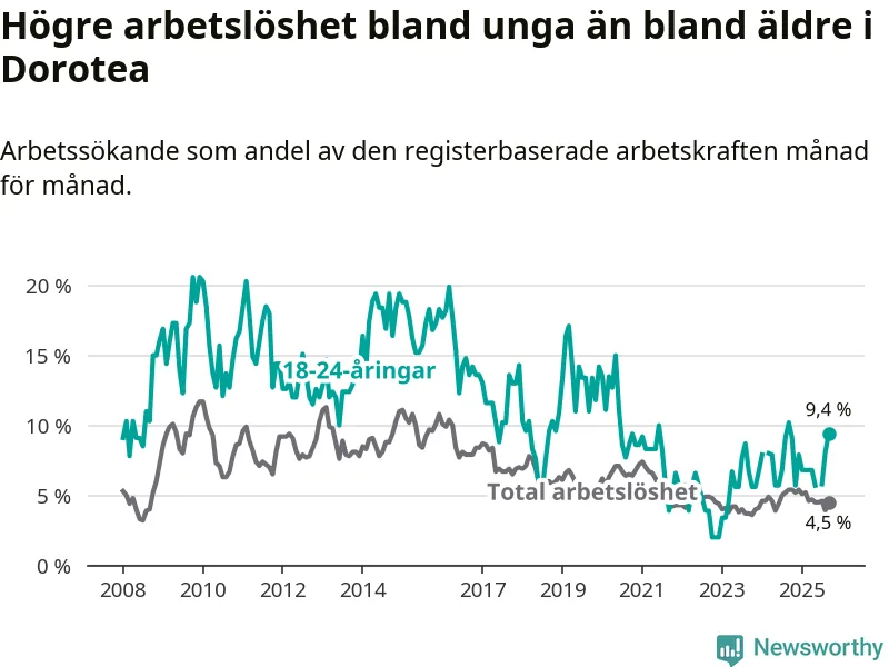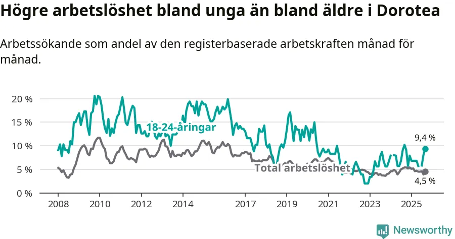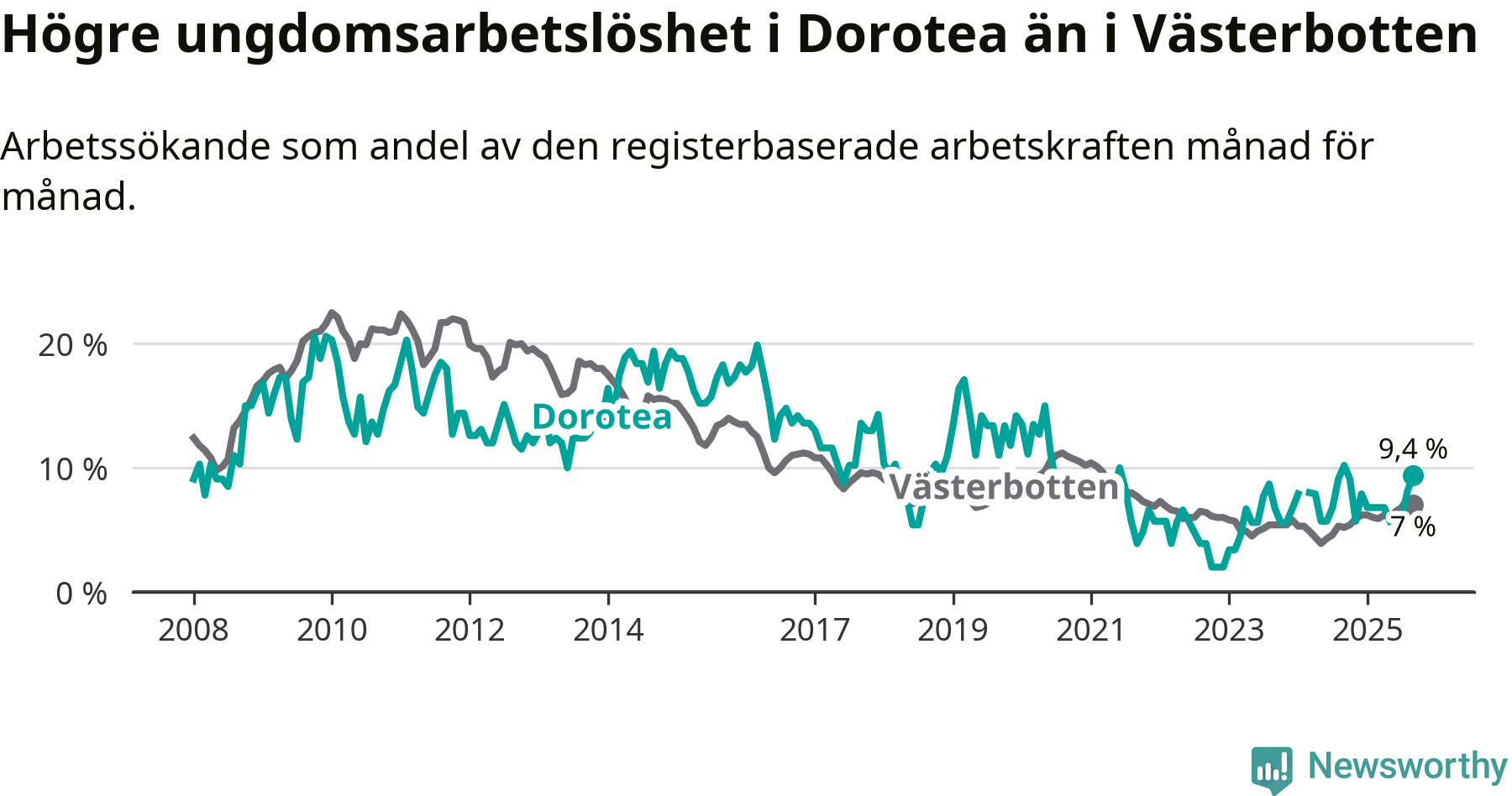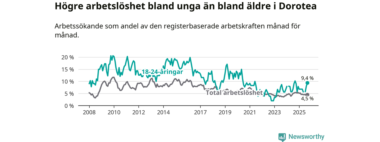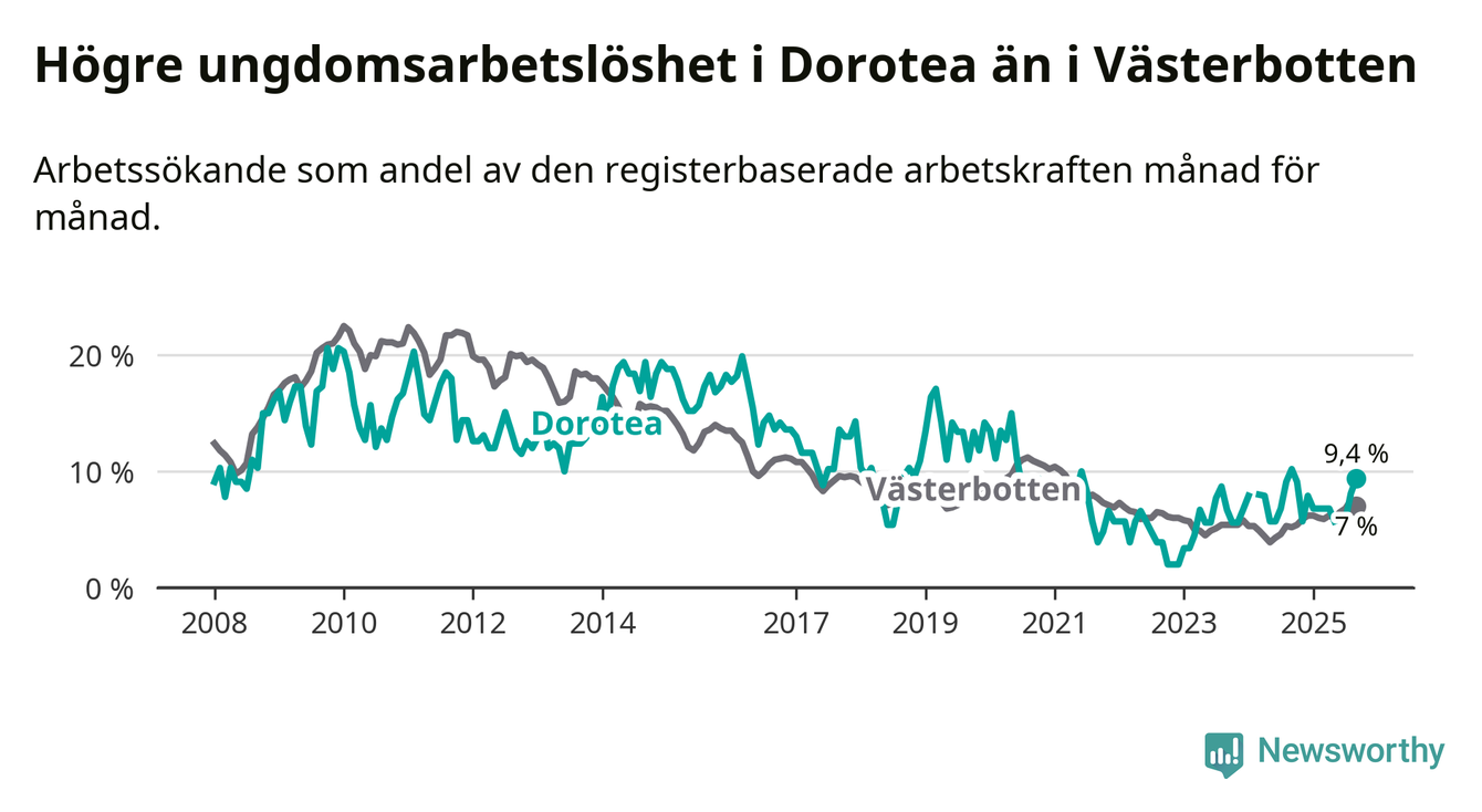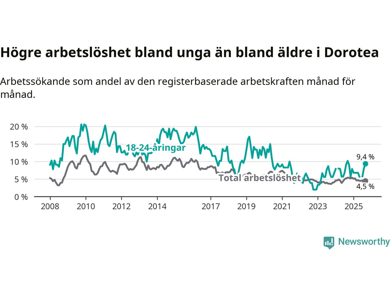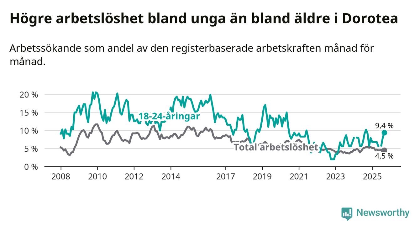 Medan Dorotea har lägre total arbetslöshet än Västerbotten, ligger ungdomsarbetslösheten 2,4 procentenheter högre i Dorotea.