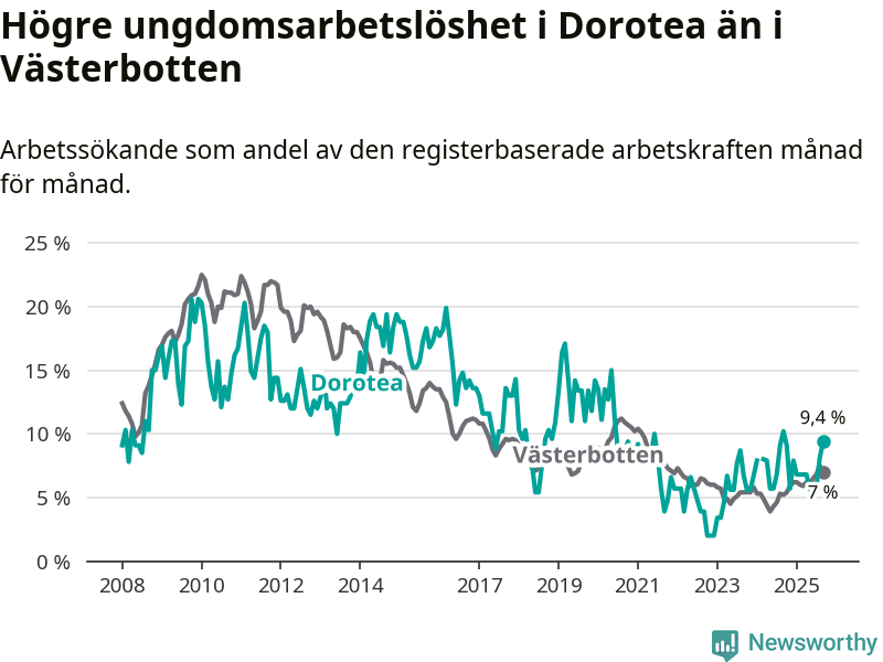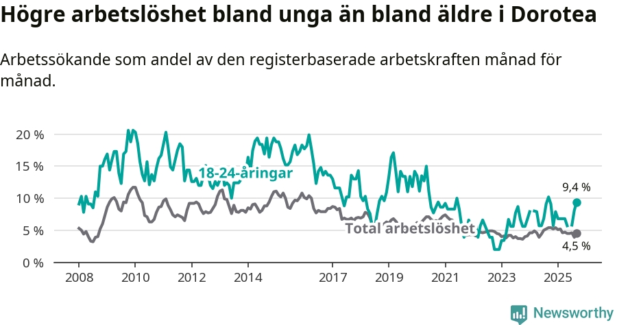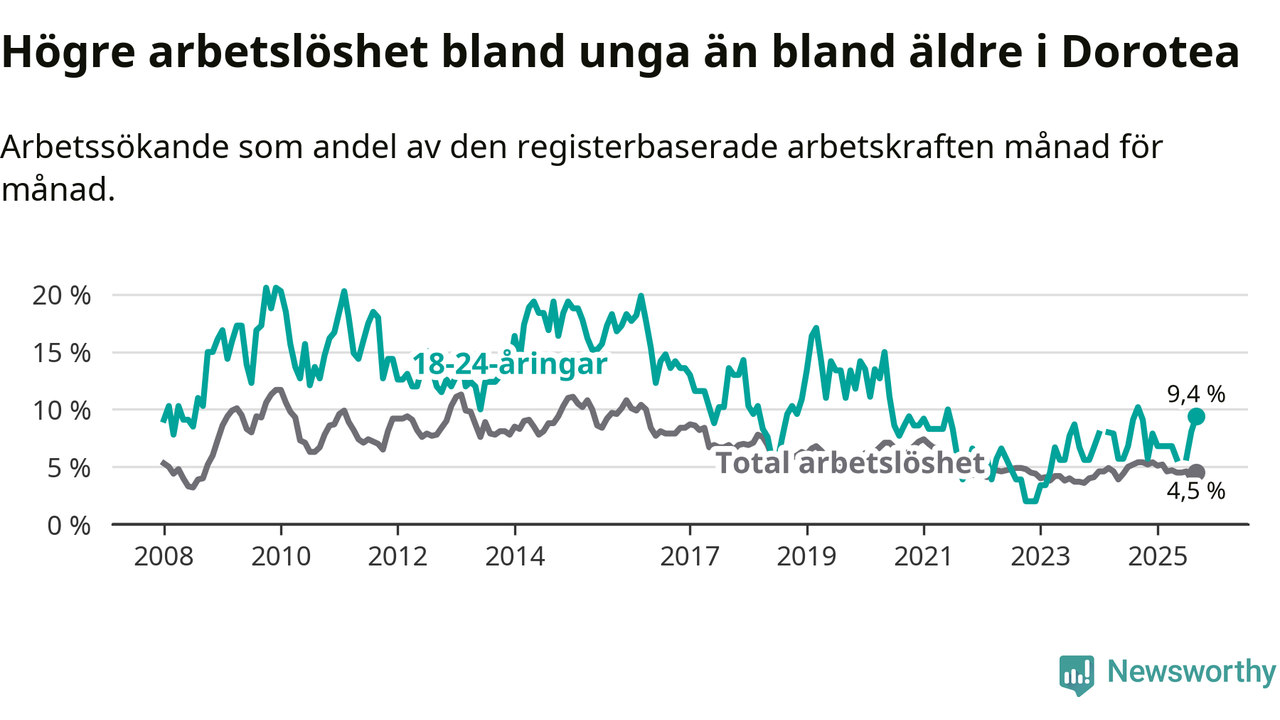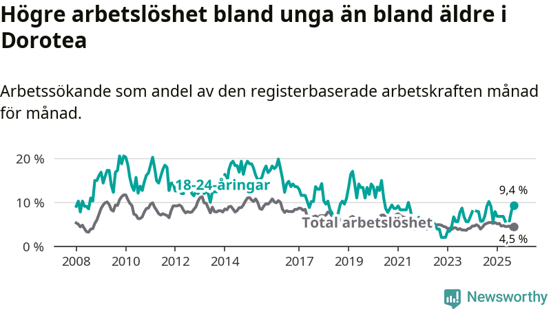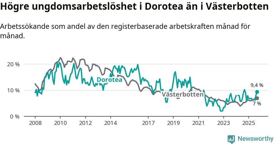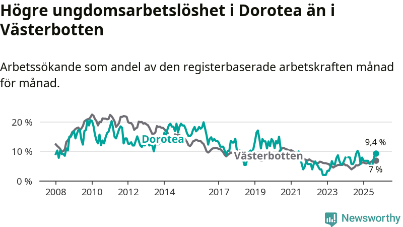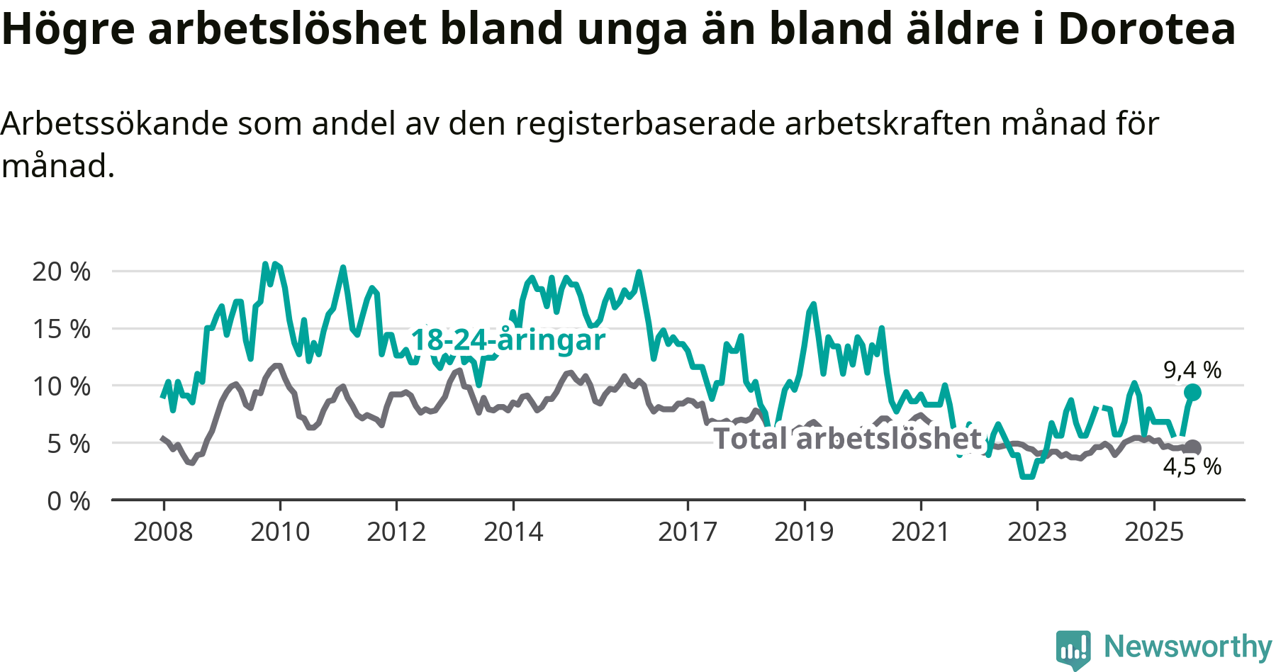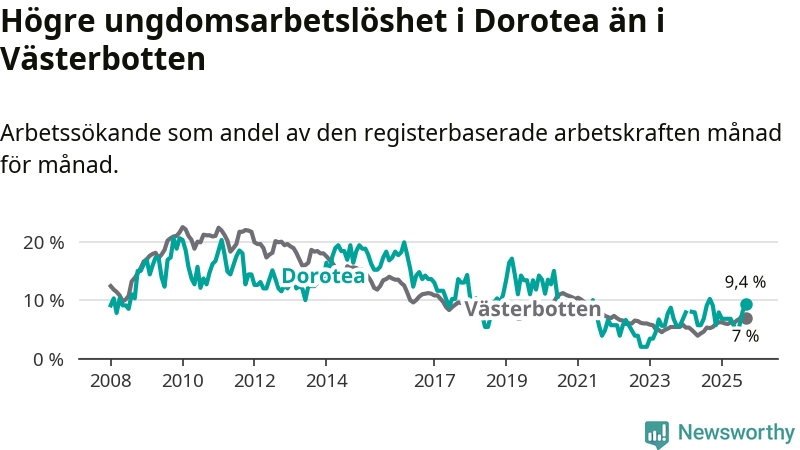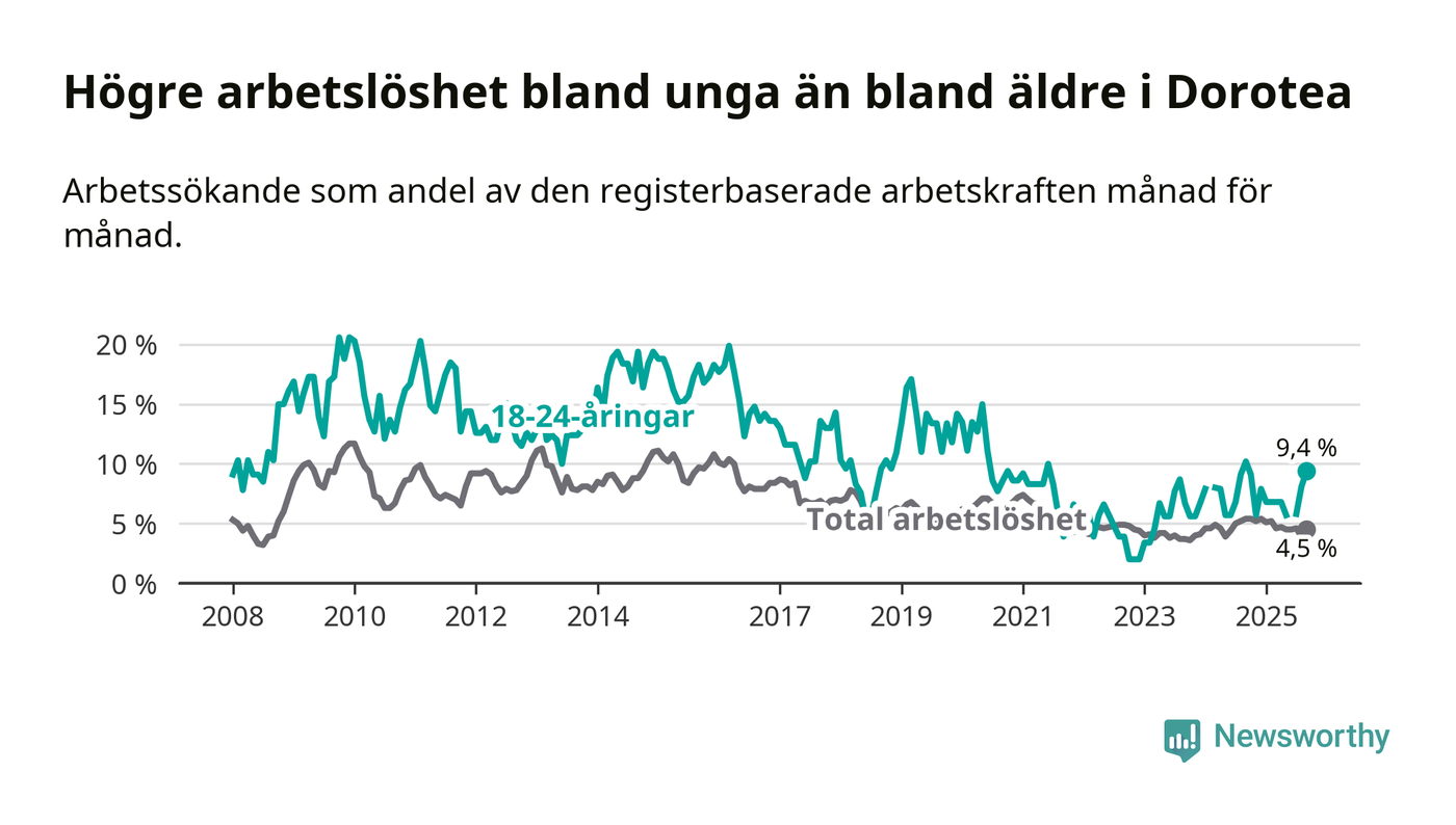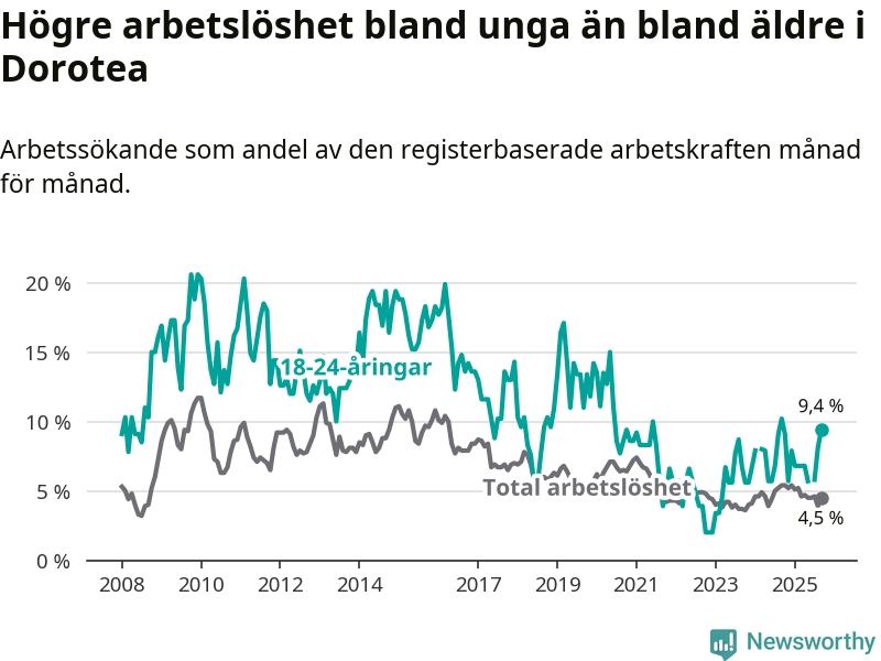 Medan Dorotea har lägre total arbetslöshet än Västerbotten, ligger ungdomsarbetslösheten 2,4 procentenheter högre i Dorotea.