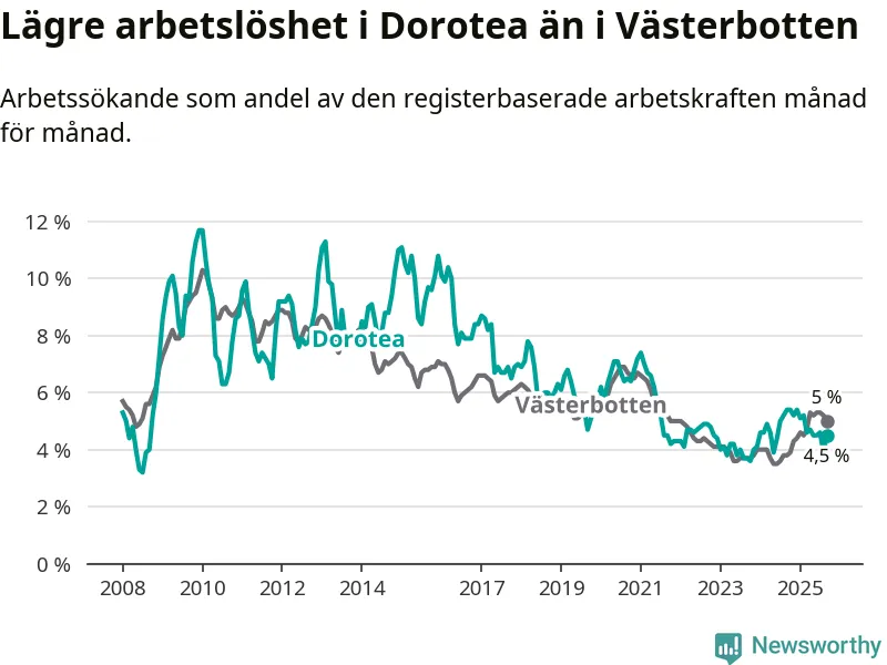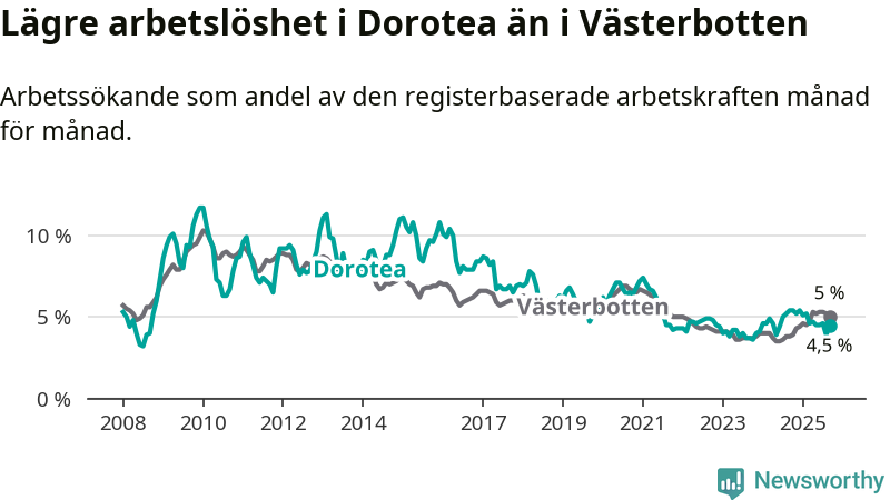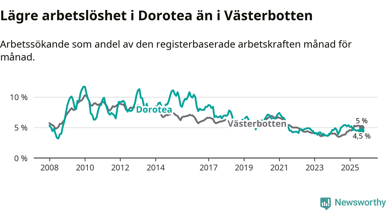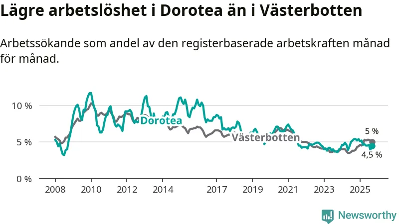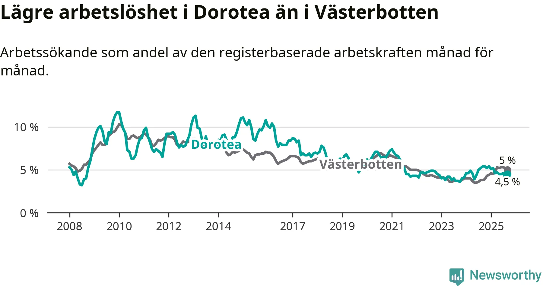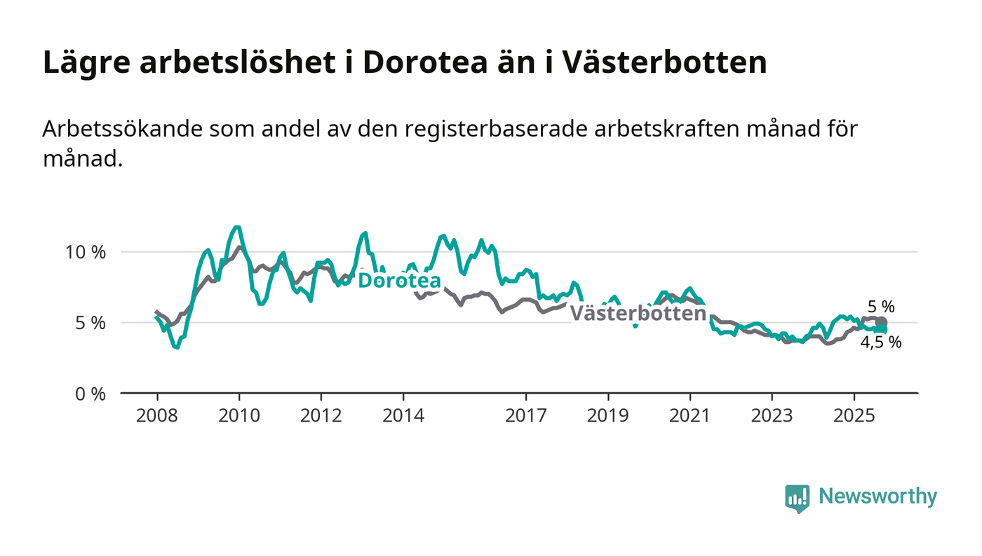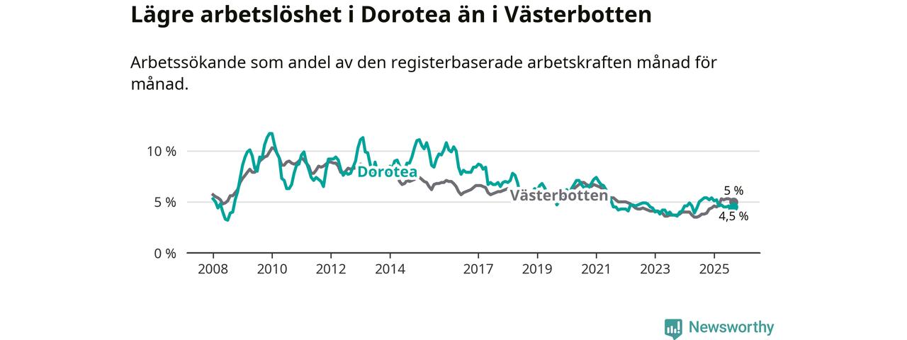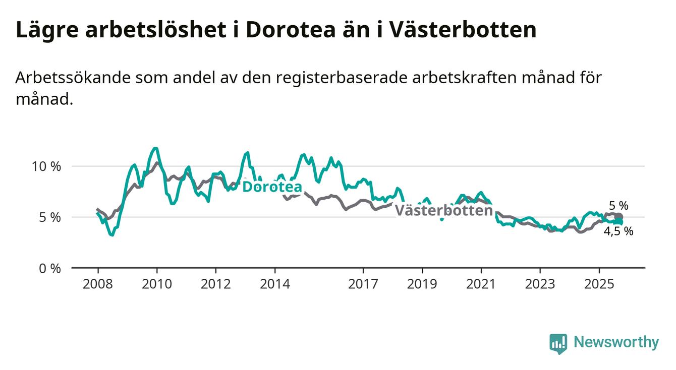 Dorotea kommun såg under september en starkare utveckling på arbetsmarknaden än länet. Kommunen har passerat Västerbottens län och har nu lägre arbetslöshet.