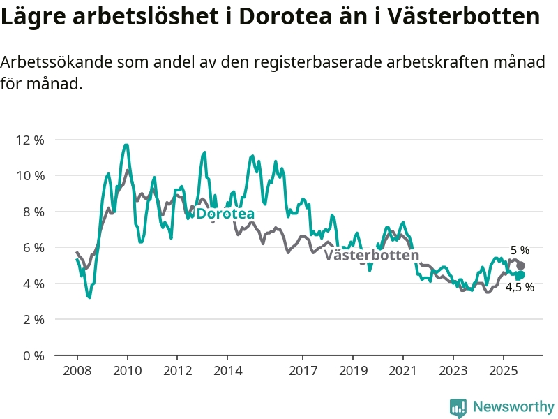 Dorotea hade redan tidigare lägre arbetslöshet än snittet i hela Västerbottens län och nu växer klyftan (4,5 procent i kommunen, jämfört med 5,0 procent i hela länet). Vindeln har den lägsta arbetslösheten i länet (3,2 procent), medan Skellefteå har den högsta (7,0 procent). För att Dorotea skulle komma ner i samma arbetslöshetsnivå som Vindeln skulle 13 personer behöva sysselsättas.