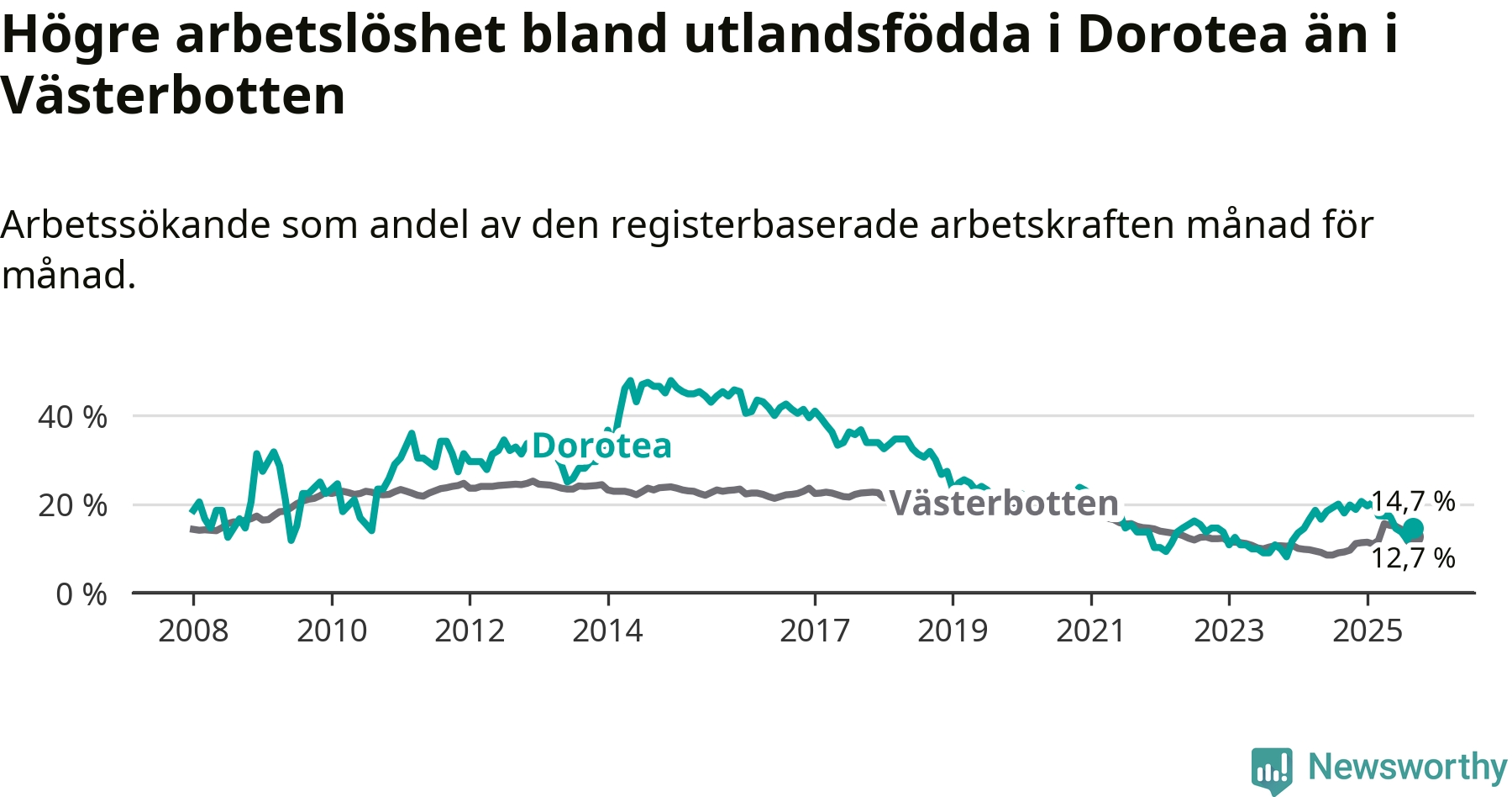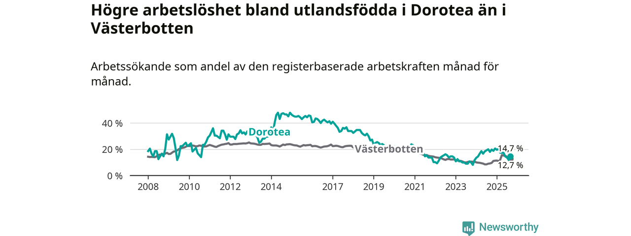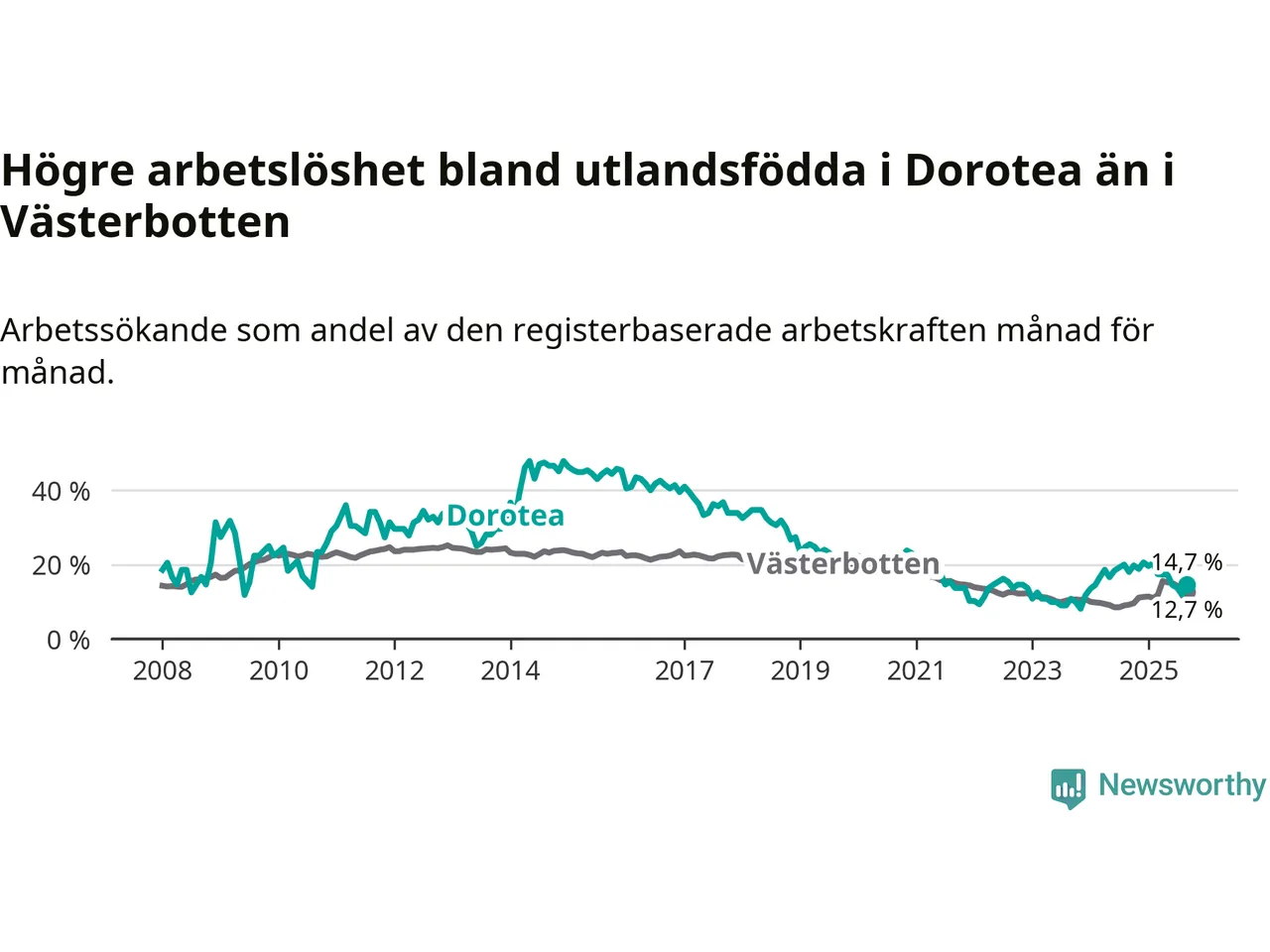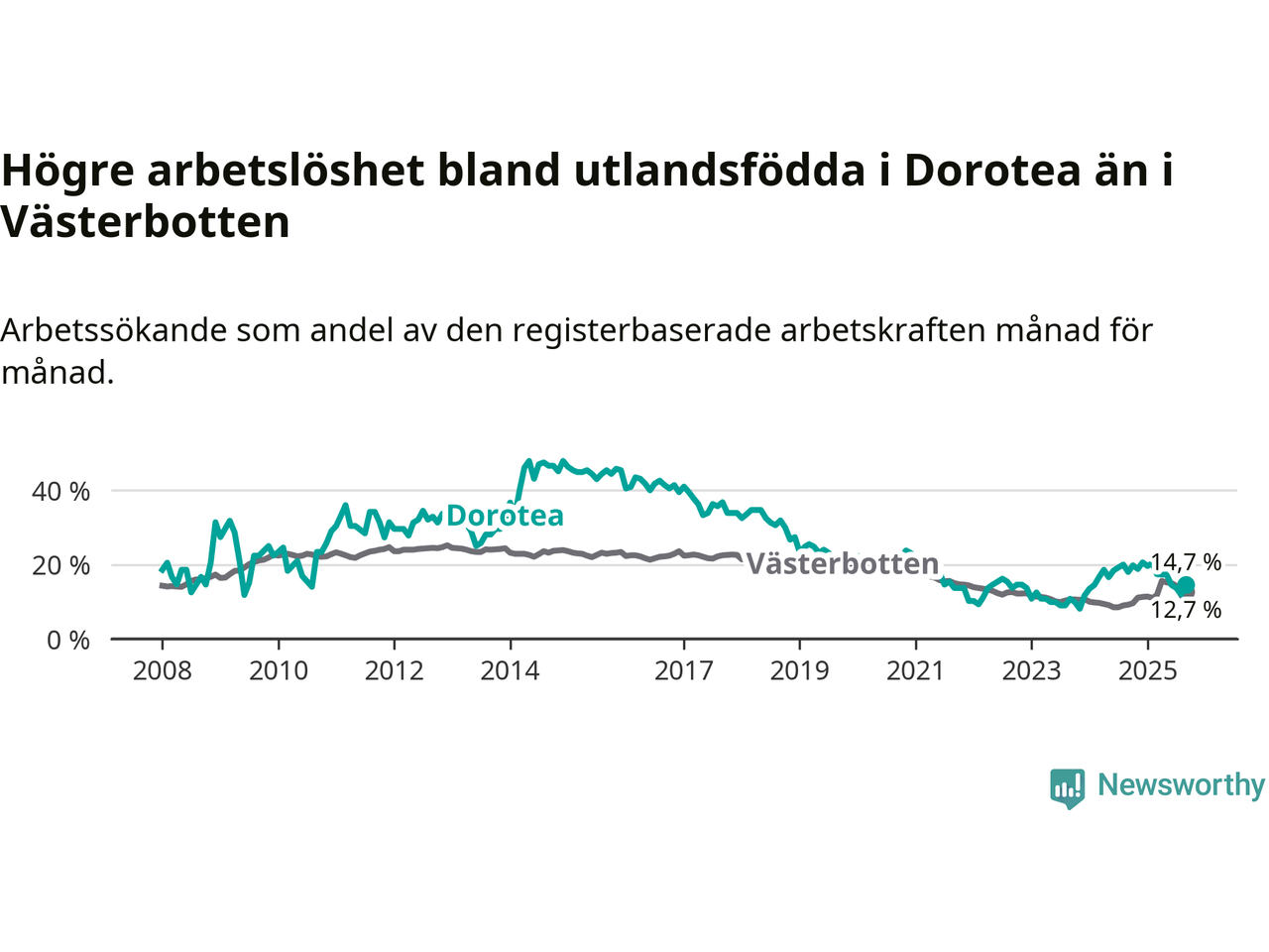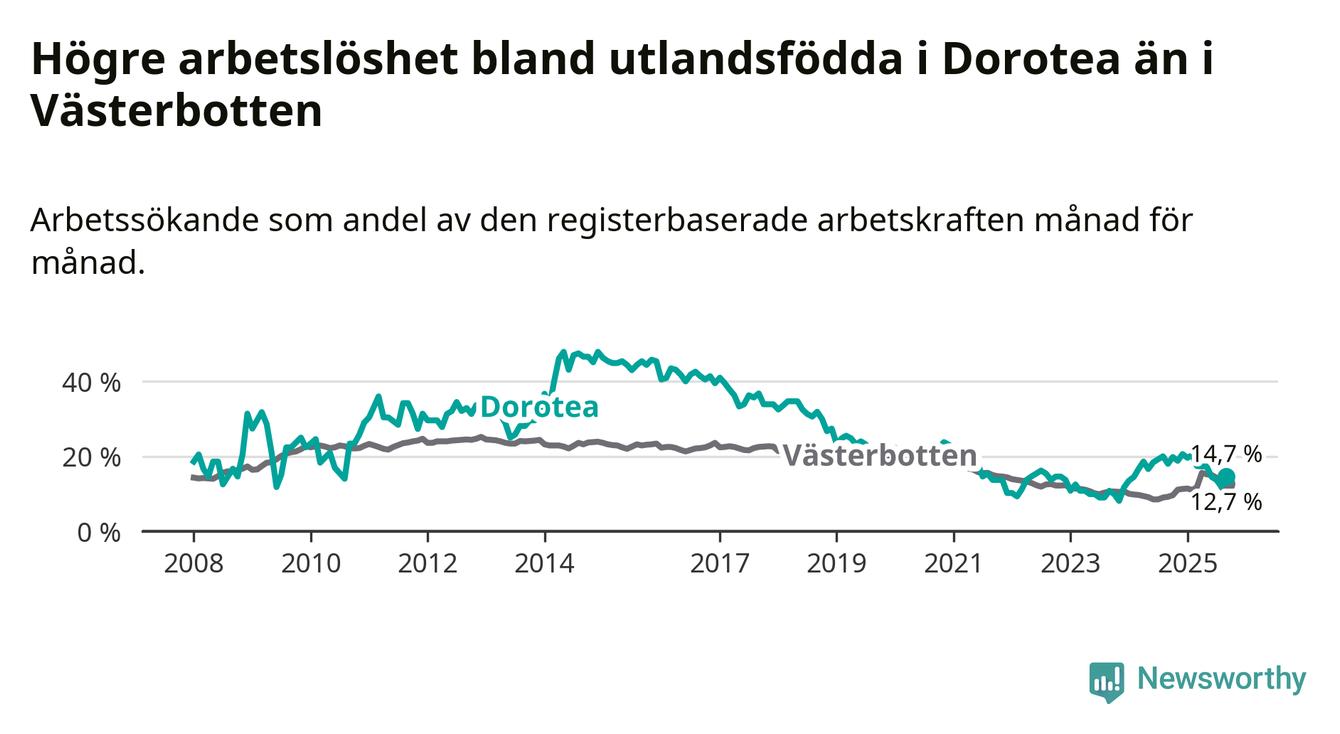 Medan arbetslösheten bland utlandsfödda alltså minskar i Dorotea så ökar den i Västerbotten. Jämfört med september förra året har andelen arbetslösa utlandsfödda i länet ökat med 3,5 procentenheter (till 12,7 procent). Trots den senaste nedgången har Dorotea med andra ord fortfarande högre arbetslöshet bland utlandsfödda än Västerbotten.