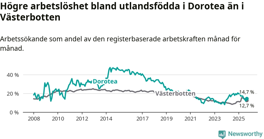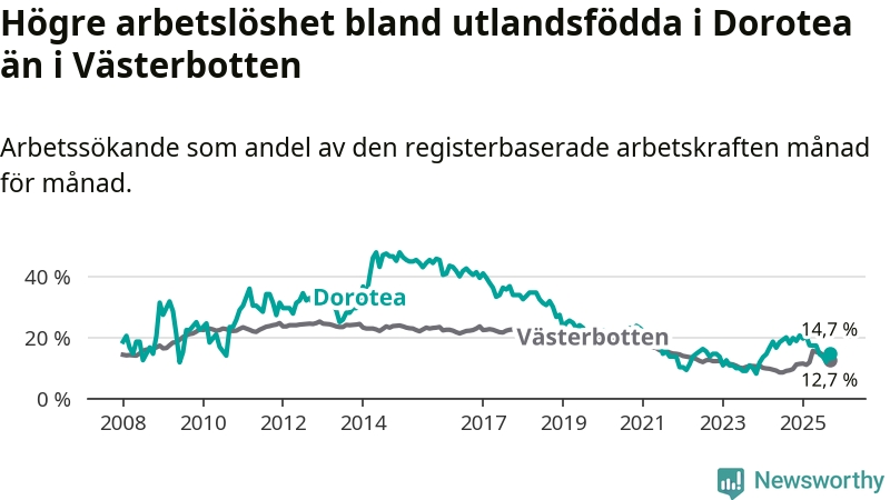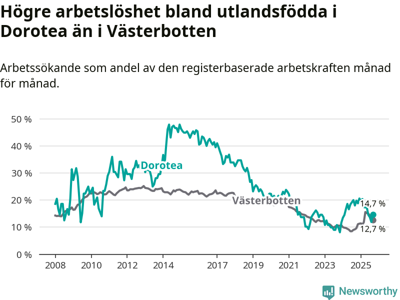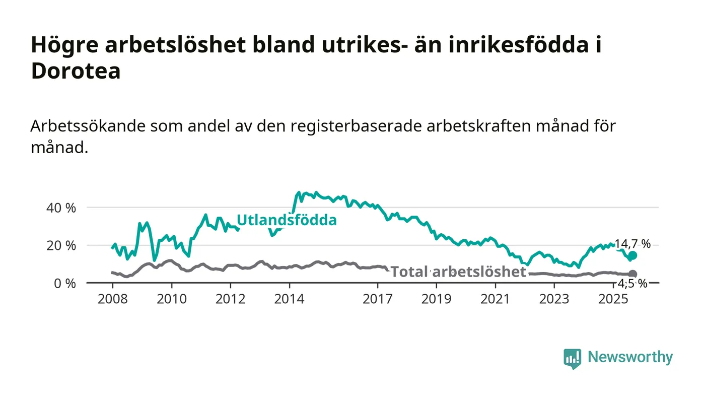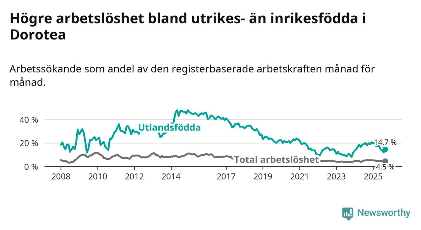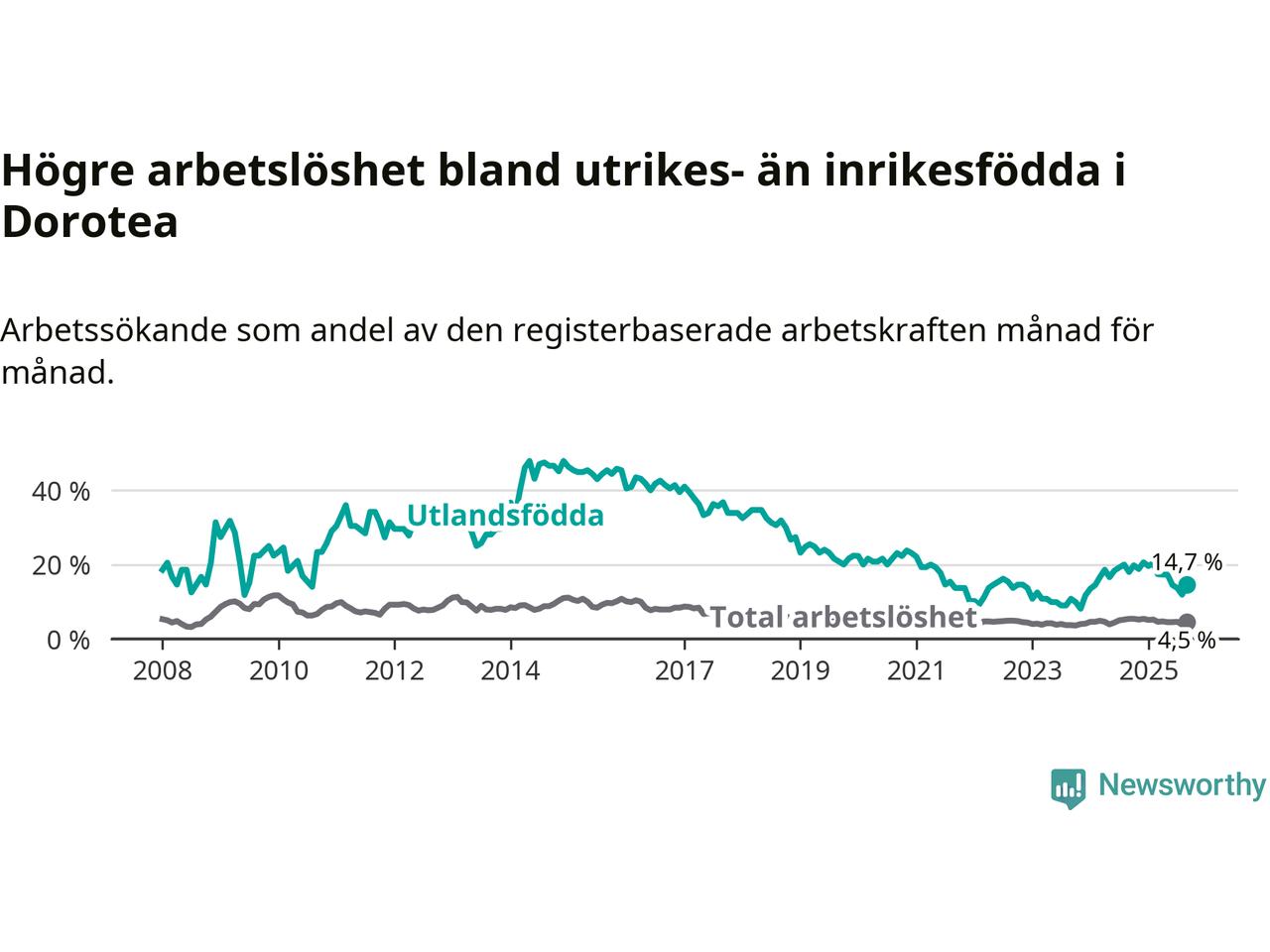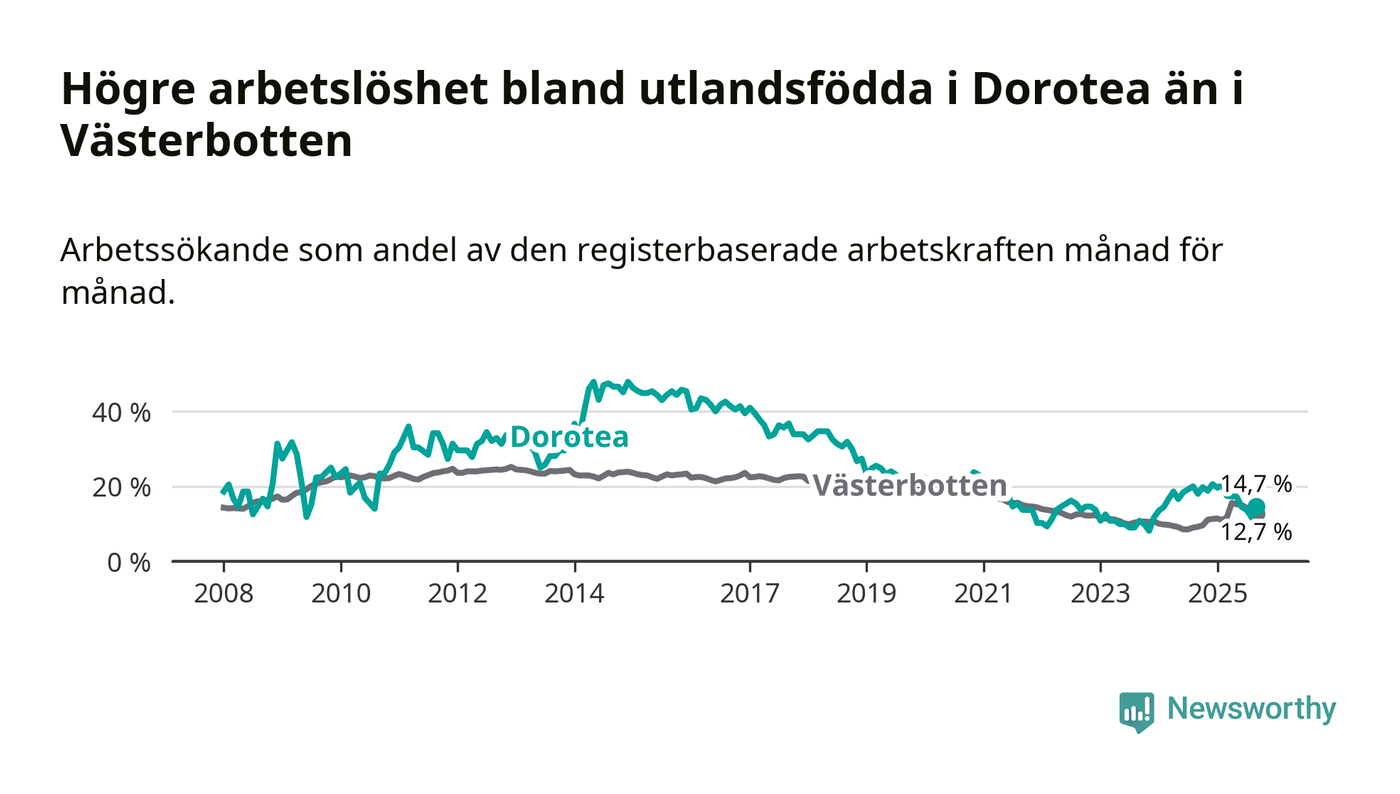 Medan arbetslösheten bland utlandsfödda alltså minskar i Dorotea så ökar den i Västerbotten. Jämfört med september förra året har andelen arbetslösa utlandsfödda i länet ökat med 3,5 procentenheter (till 12,7 procent). Trots den senaste nedgången har Dorotea med andra ord fortfarande högre arbetslöshet bland utlandsfödda än Västerbotten.