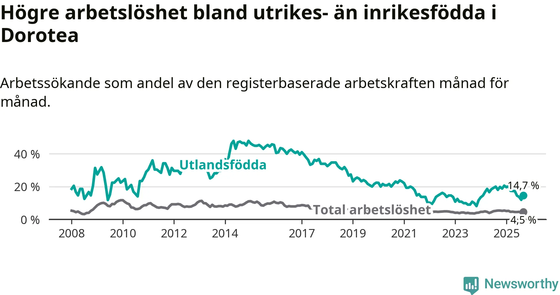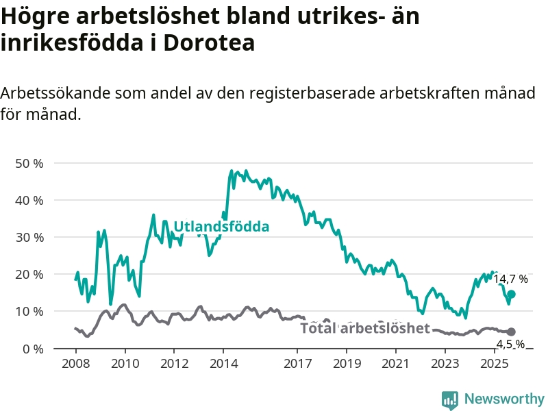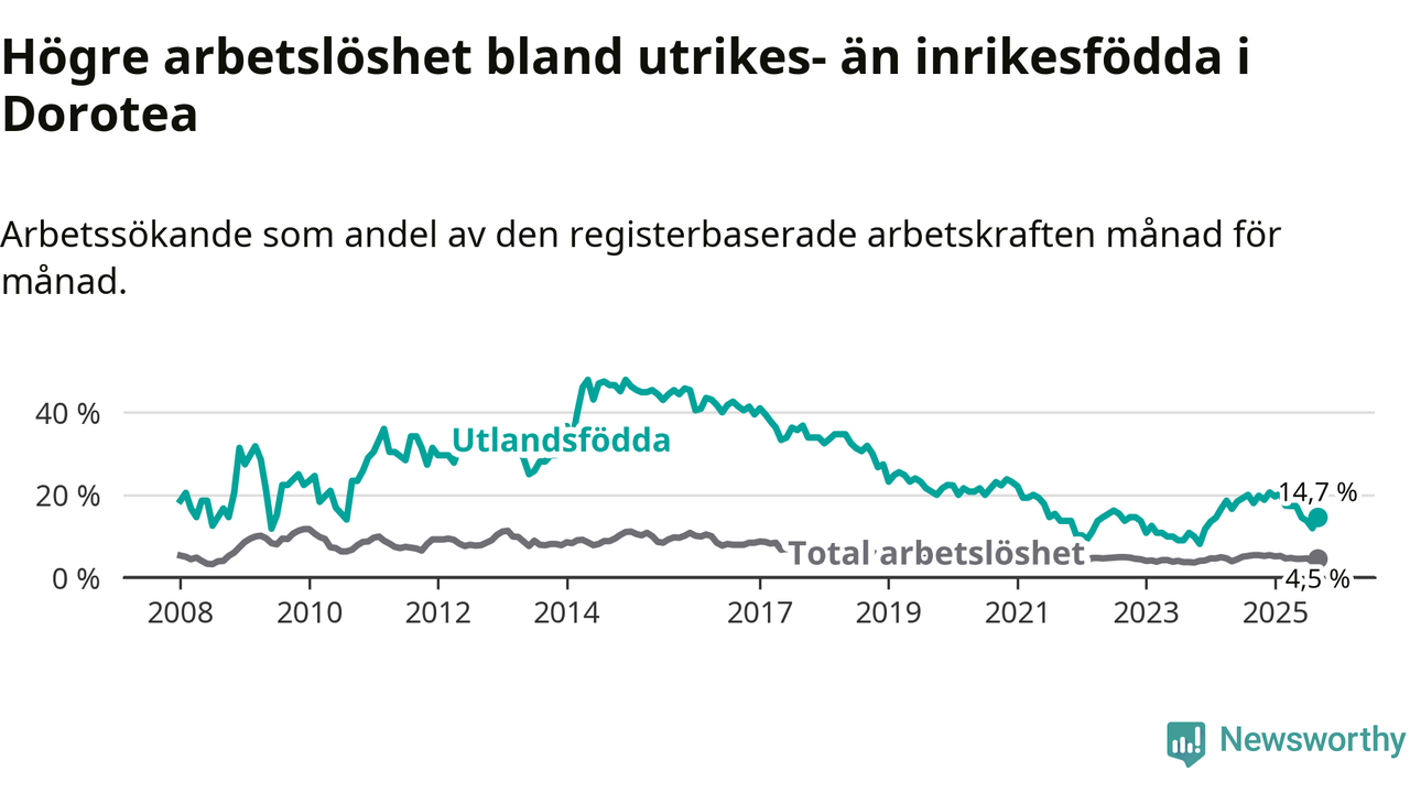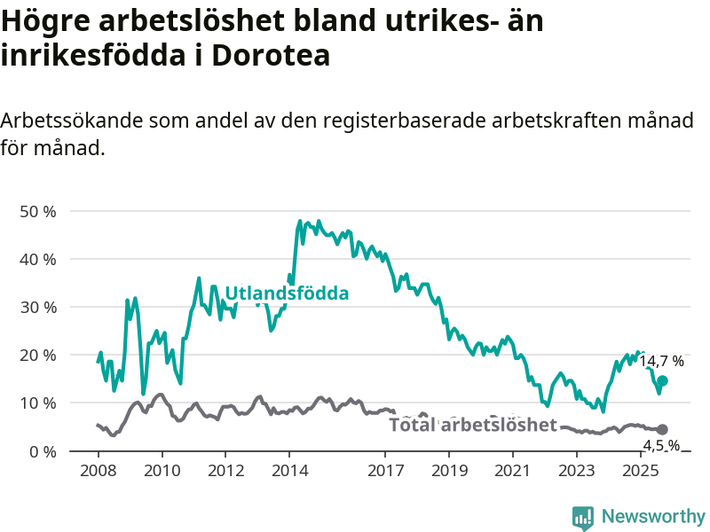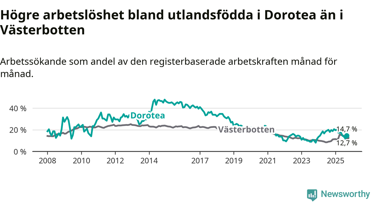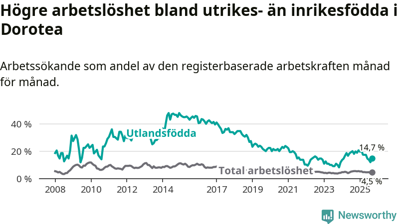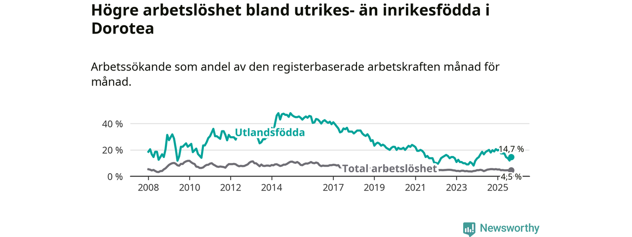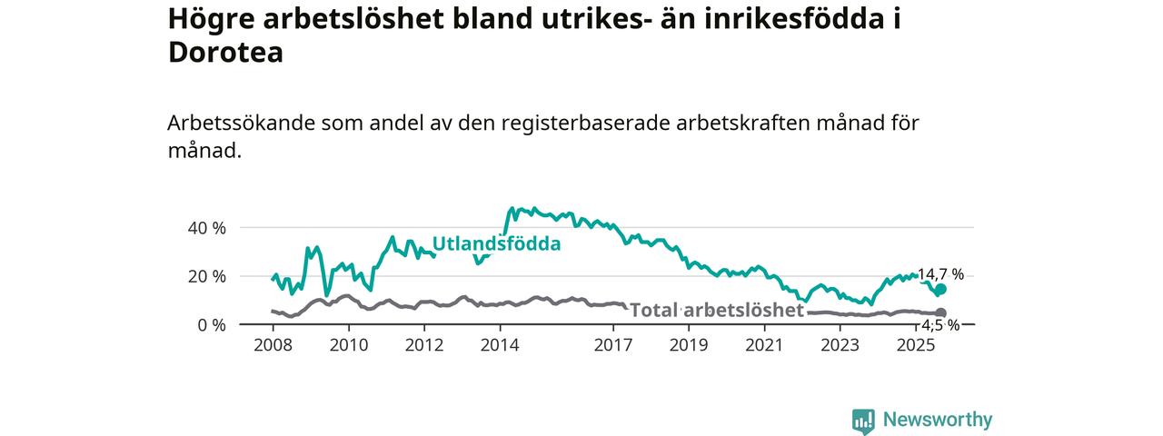 Medan arbetslösheten bland utlandsfödda alltså minskar i Dorotea så ökar den i Västerbotten. Jämfört med september förra året har andelen arbetslösa utlandsfödda i länet ökat med 3,5 procentenheter (till 12,7 procent). Trots den senaste nedgången har Dorotea med andra ord fortfarande högre arbetslöshet bland utlandsfödda än Västerbotten.