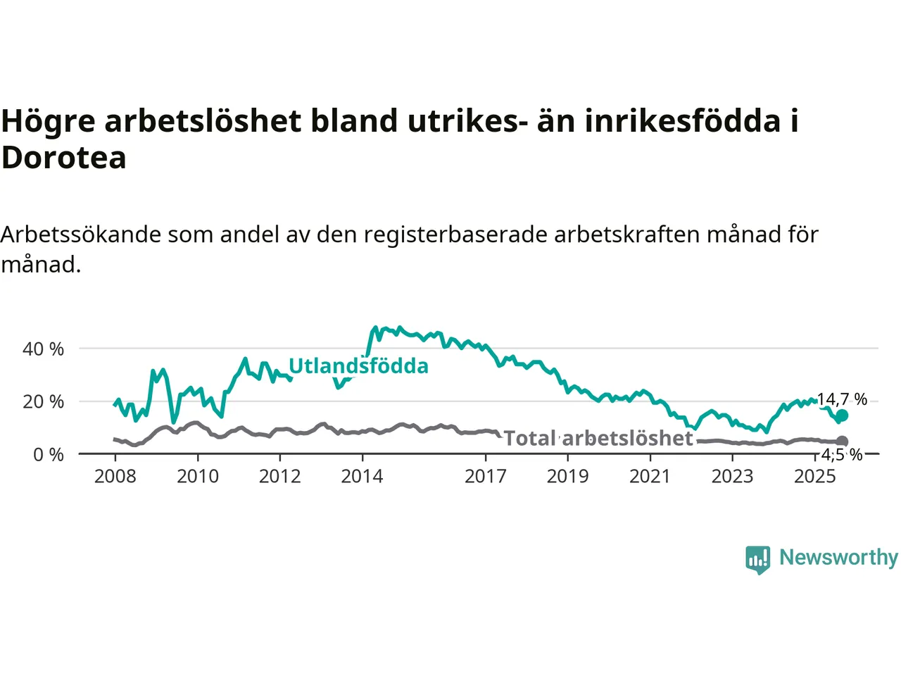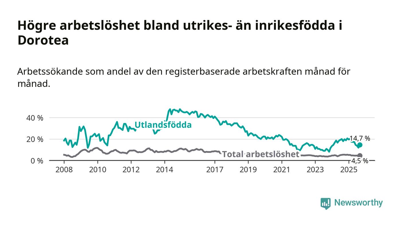 Skillnaden i arbetslöshet mellan utrikesfödda och hela befolkningen är 10,2 procentenheter i Dorotea. Det är en betydligt mindre skillnad än för ett år sedan (−2,4 procentenheter).