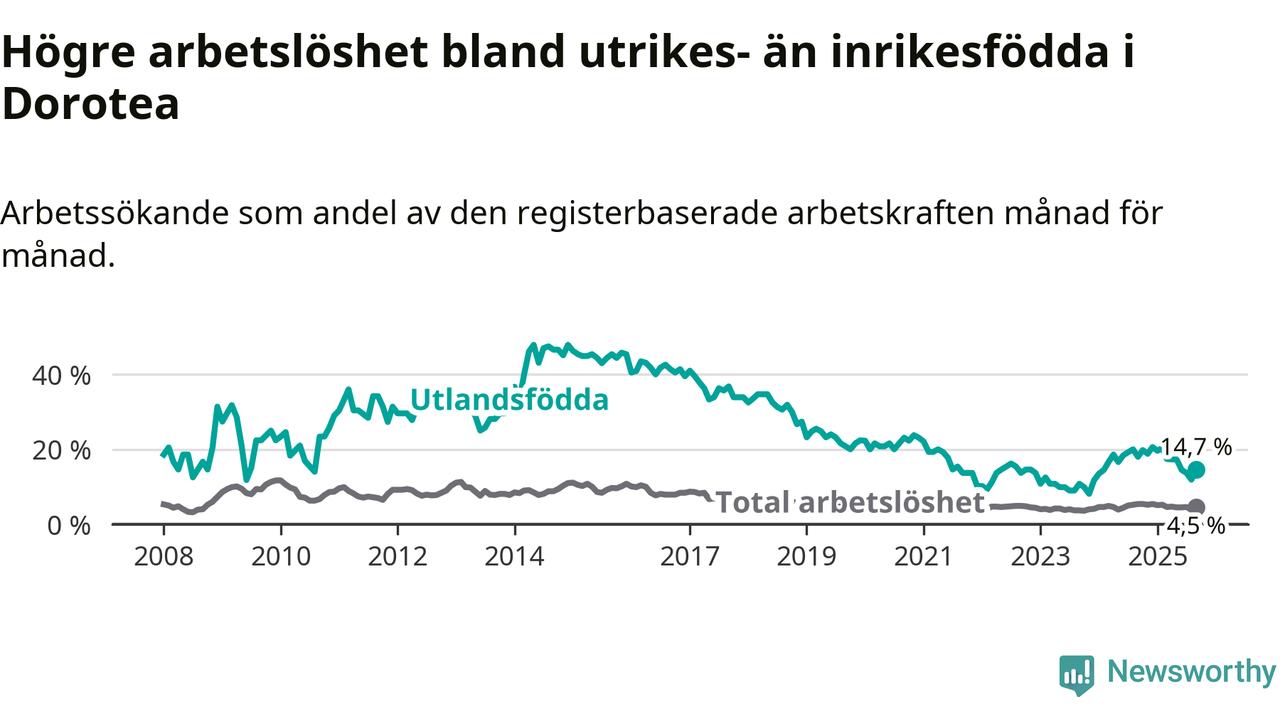 Arbetslösheten bland utlandsfödda var 14,7 procent i Dorotea under september månad, motsvarande 16 av 109 personer. Det är 3,3 procentenheter färre än vid samma tidpunkt i fjol (−3 om man räknar personer).
