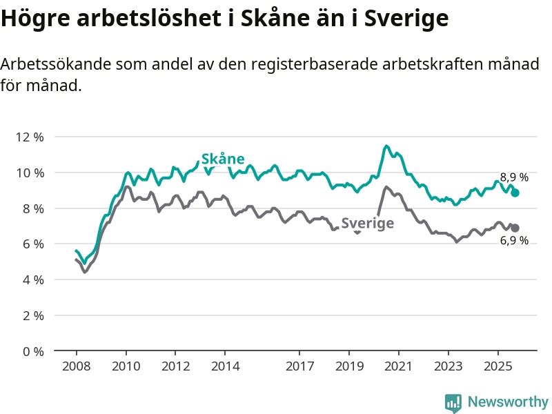 Under september månad rapporterade Skåne län en total arbetslöshet på 8,9 procent. Det är en minskning jämfört med samma tidpunkt i fjol (−0,2 procentenheter). I Sverige däremot stiger arbetslösheten något.