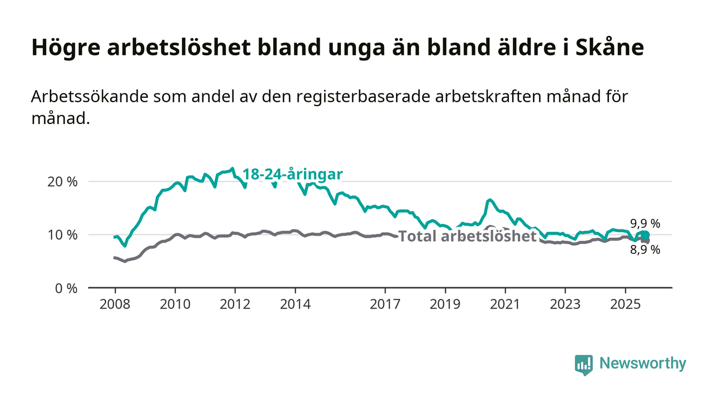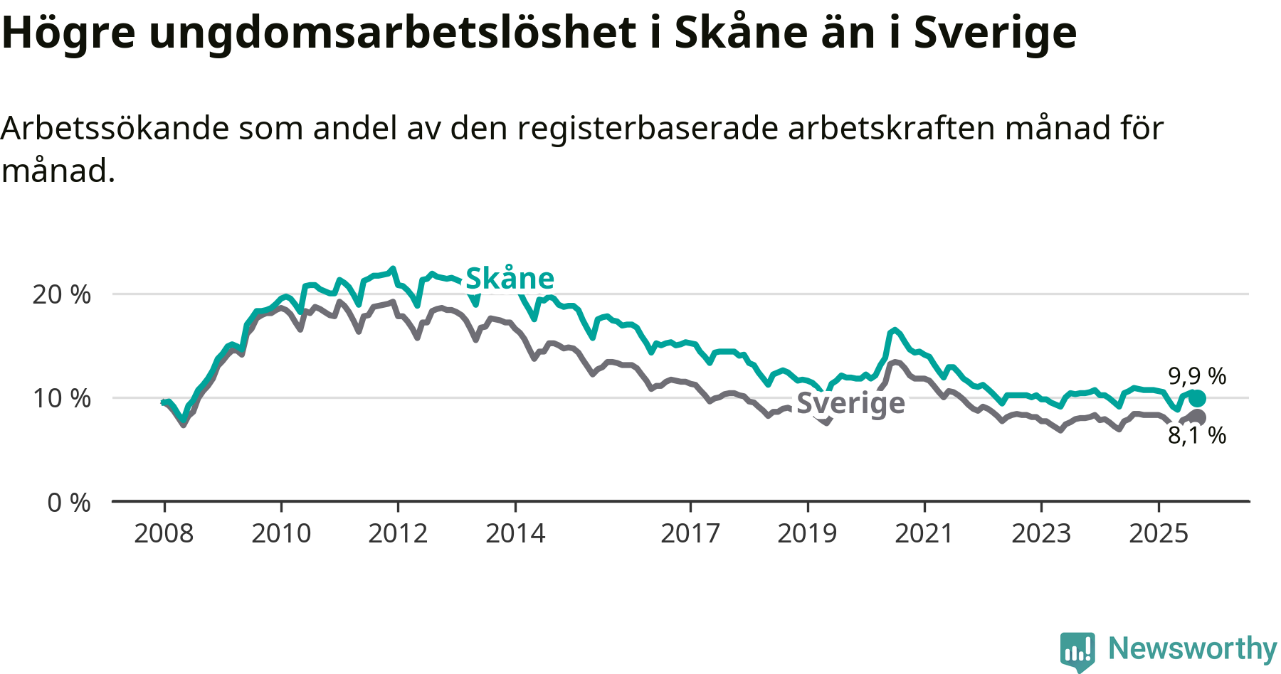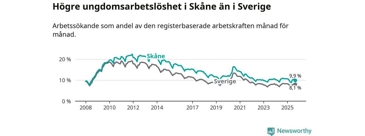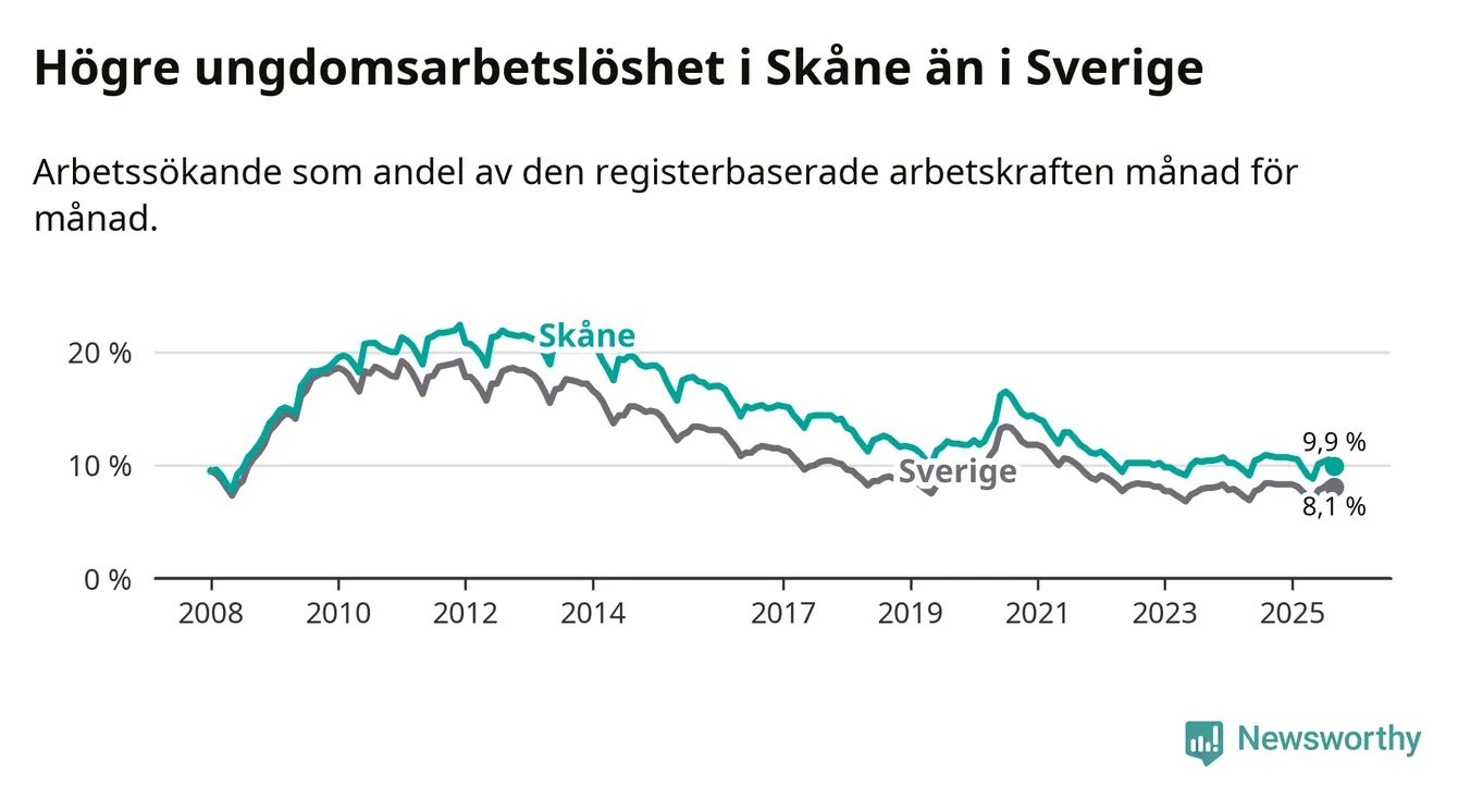 Precis som den totala arbetslösheten ligger ungdomsarbetslösheten i Skåne högre än i Sverige som helhet. Skillnaden mellan länet och riket är 1,8 procentenheter.