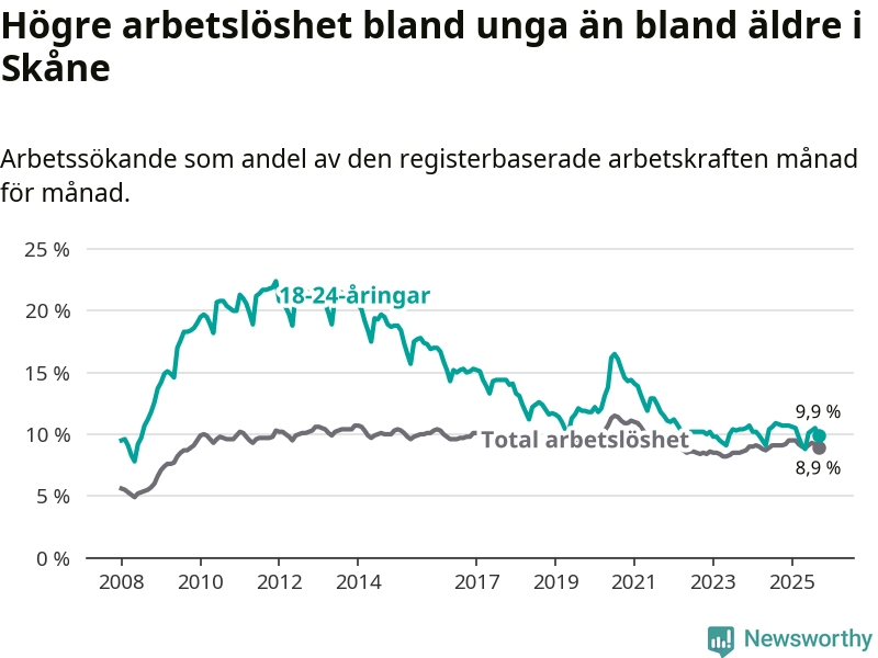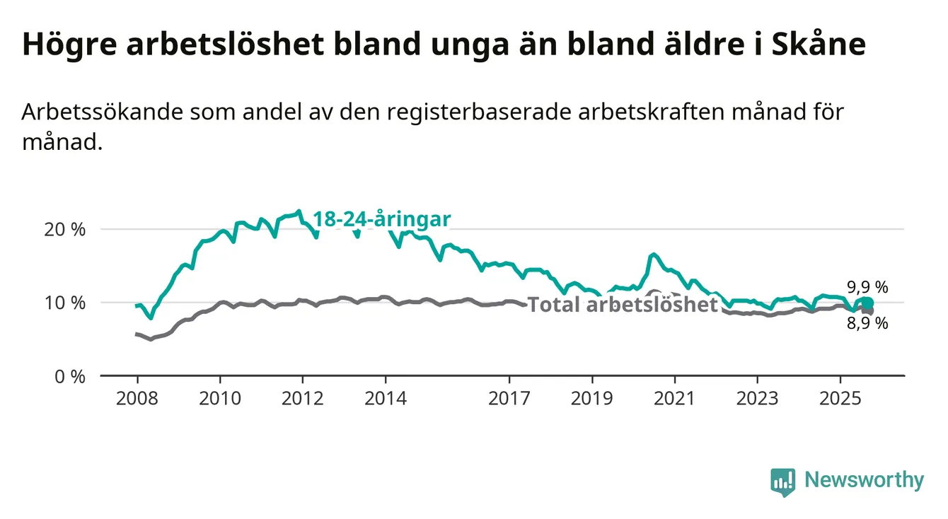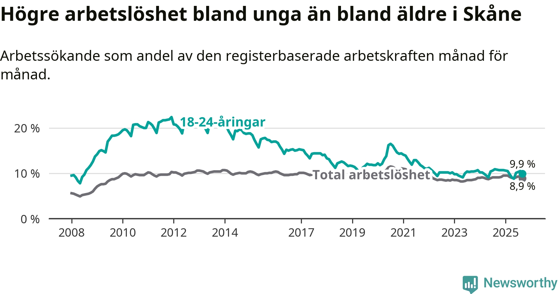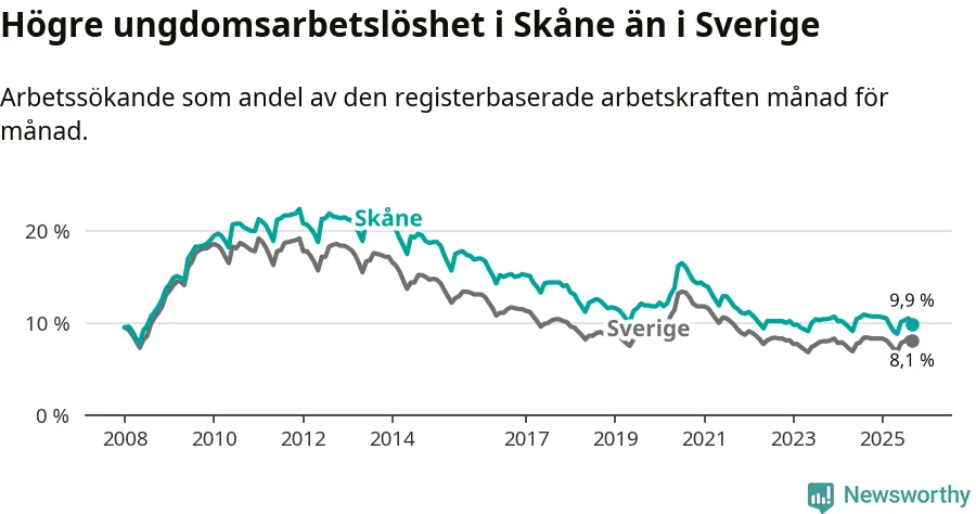 Precis som den totala arbetslösheten ligger ungdomsarbetslösheten i Skåne högre än i Sverige som helhet. Skillnaden mellan länet och riket är 1,8 procentenheter.