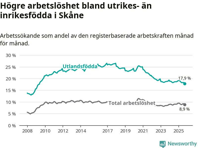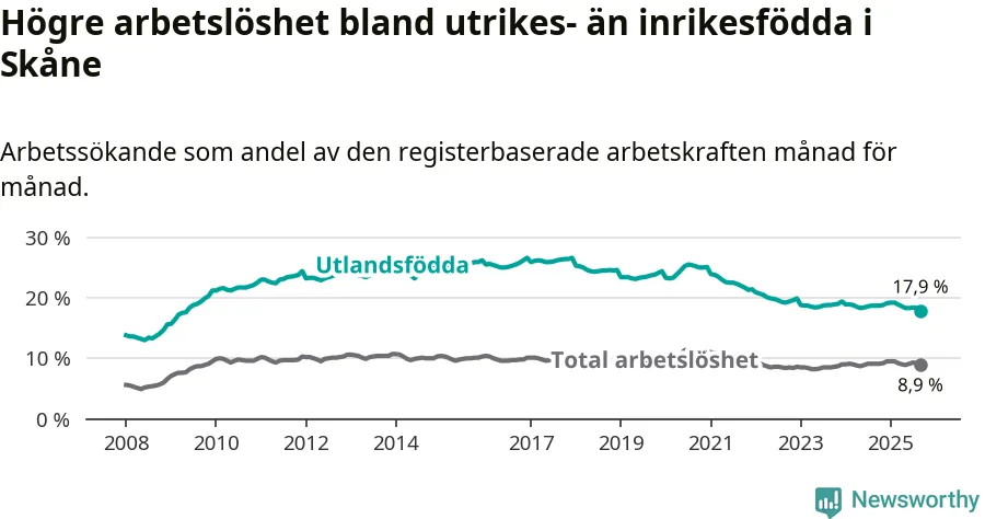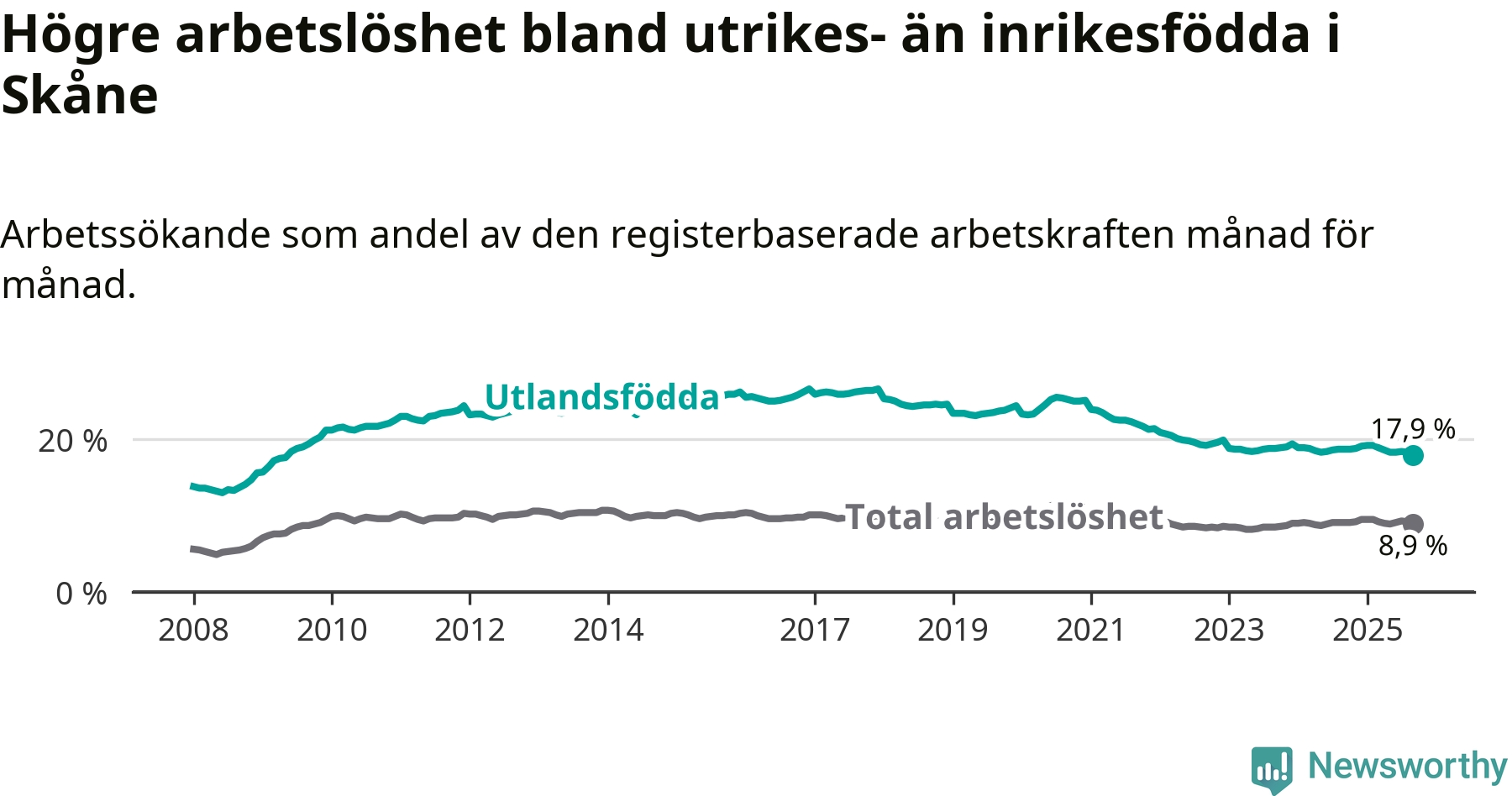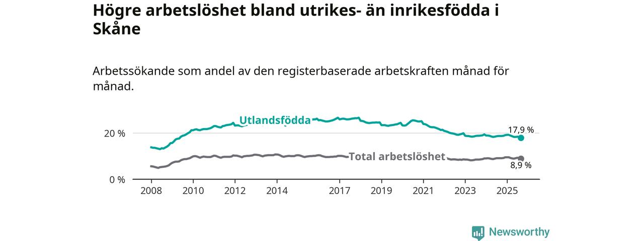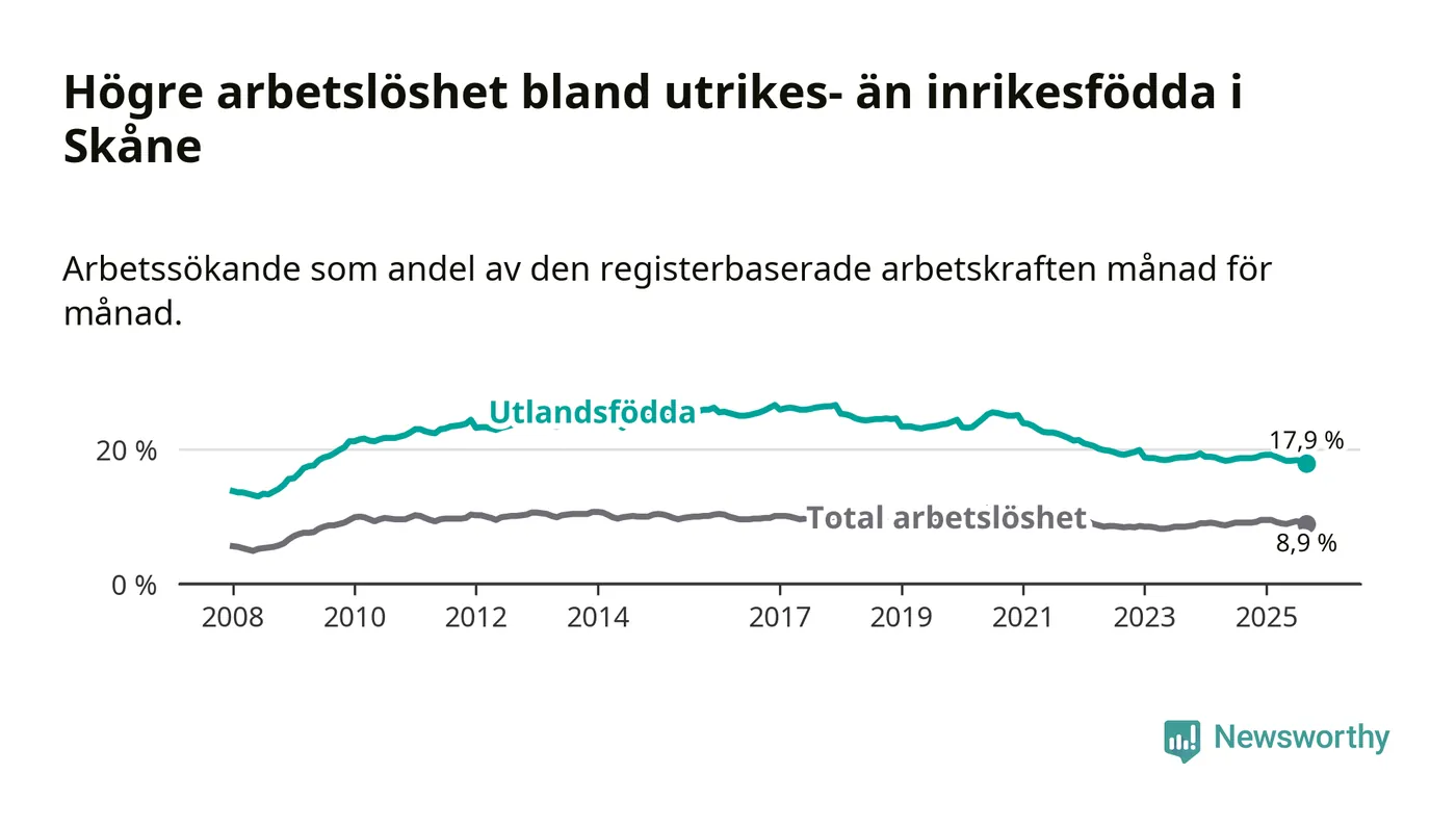 Arbetslösheten bland utlandsfödda var 17,9 procent i Skåne under september månad, motsvarande 35 705 av 199 469 personer. Det är 0,8 procentenheter färre än vid samma tidpunkt i fjol (−885 om man räknar personer). Den nuvarande arbetslöshetsnivån är den lägsta sedan maj 2009.