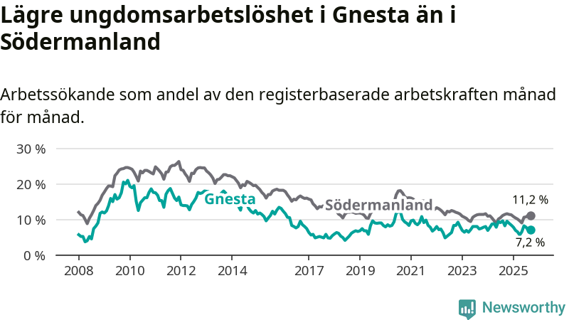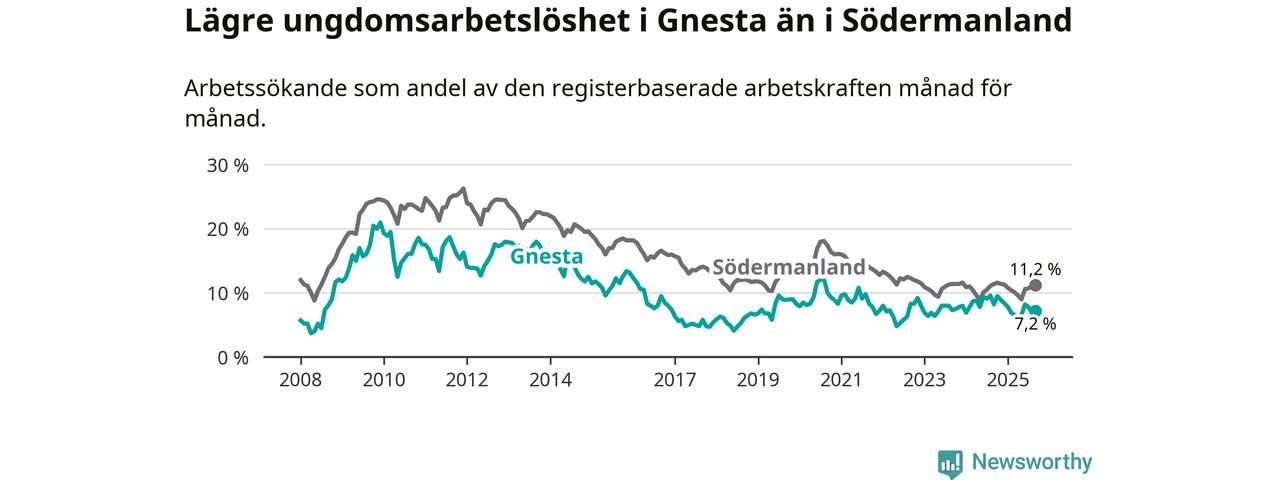 Precis som den totala arbetslösheten ligger ungdomsarbetslösheten i Gnesta lägre än i Södermanland som helhet. Skillnaden mellan kommunen och länet är 4,0 procentenheter.