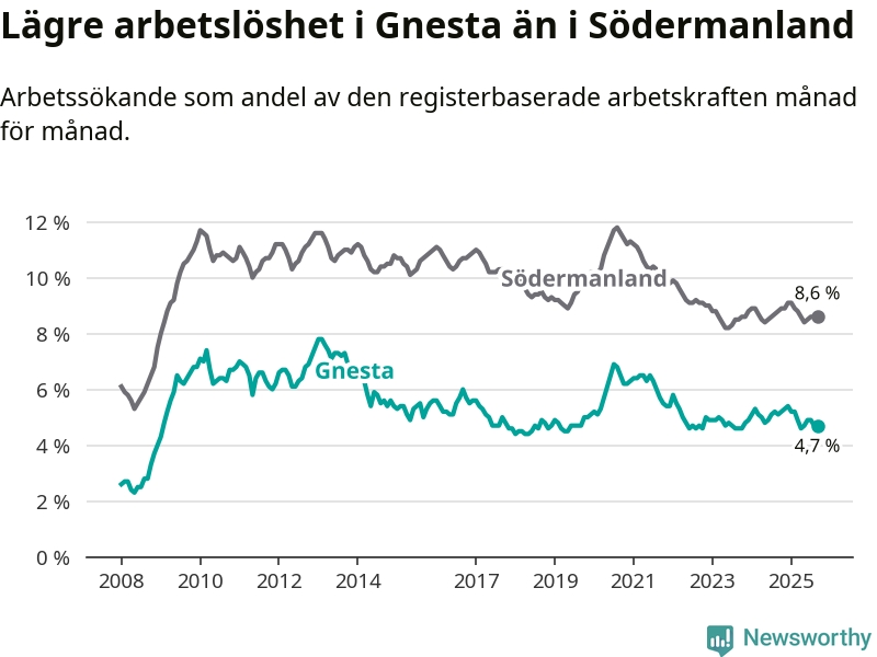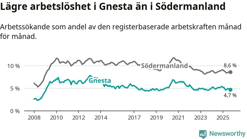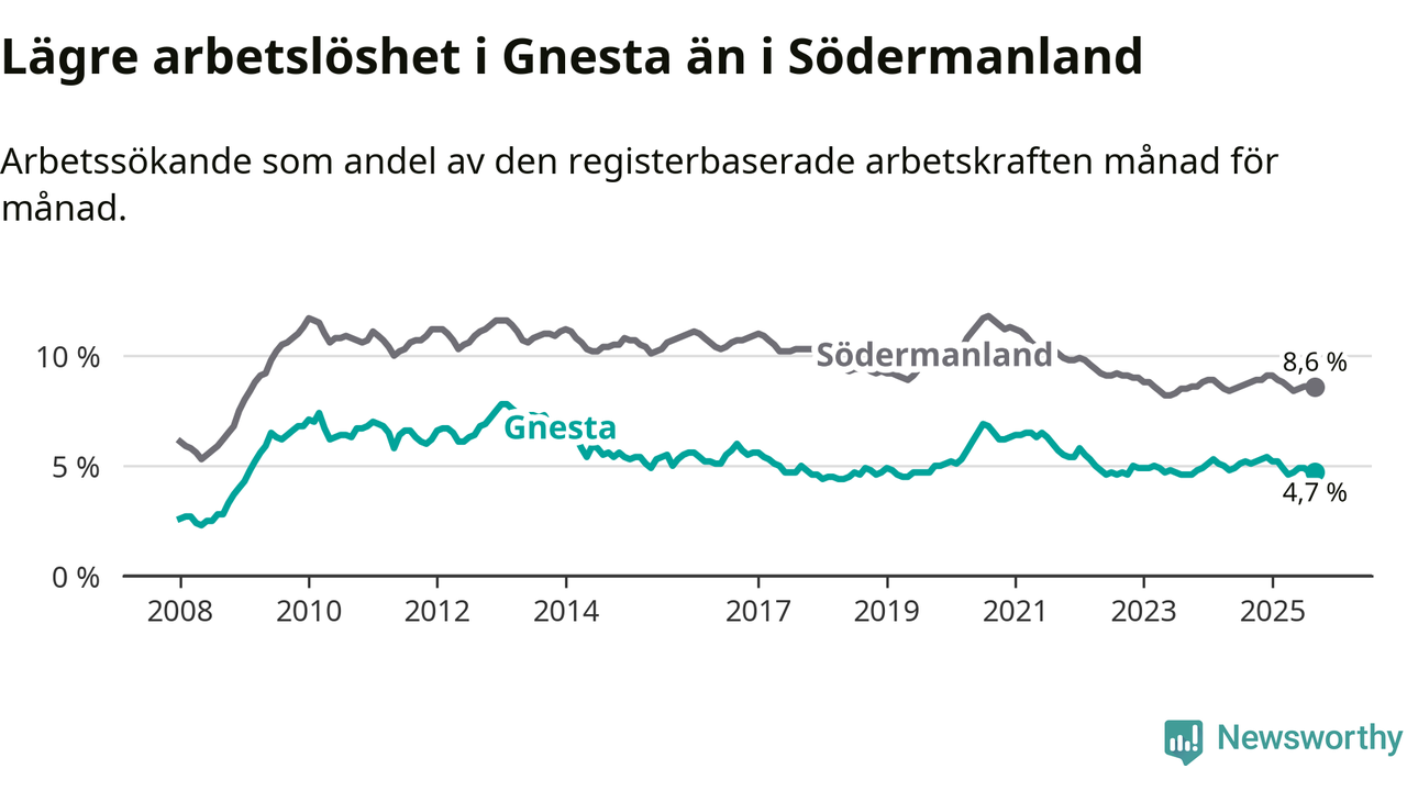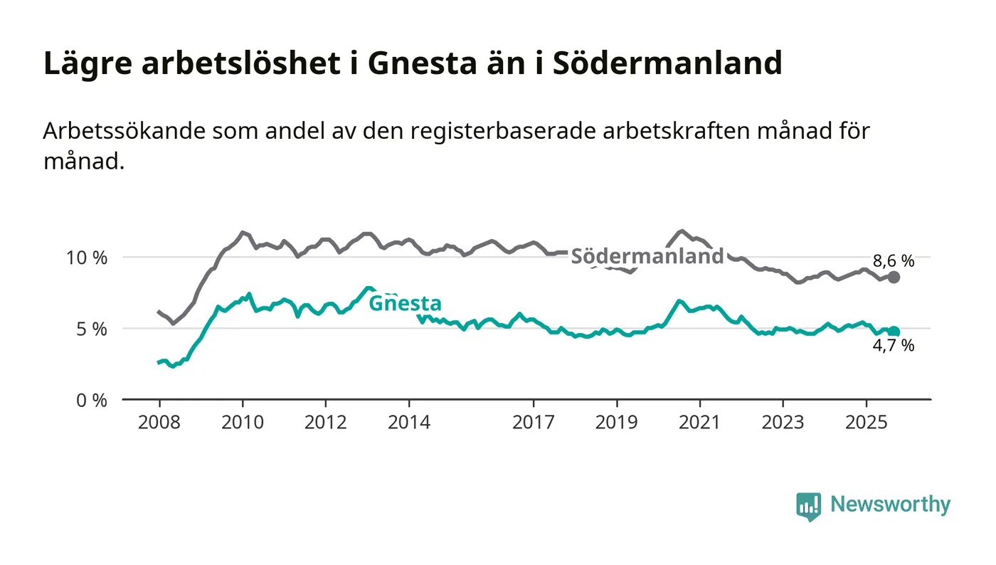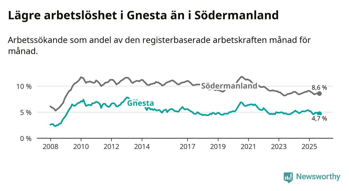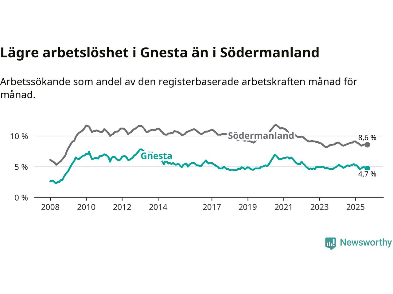 Under september månad rapporterade Gnesta kommun en total arbetslöshet på 4,7 procent. Det är en minskning jämfört med samma tidpunkt i fjol (−0,4 procentenheter). Även i Södermanlands län sjunker arbetslösheten .