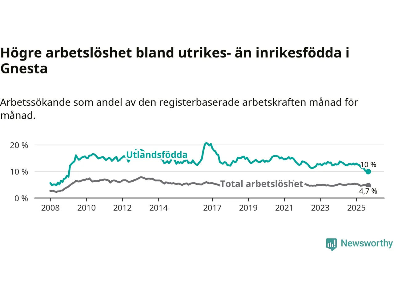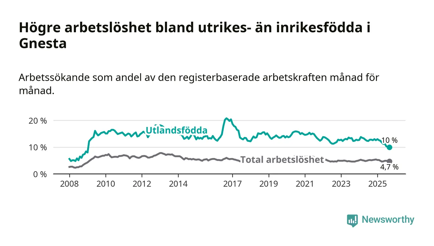 Den senaste månadsstatistiken från Arbetsförmedlingen visar på en nedgång i arbetslöshet bland utlandsfödda i Gnesta kommun med 2,8 procentenheter. Arbetslösheten bland invånare födda i ett annat land låg i september på 10,0 procent.