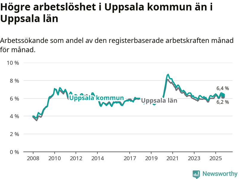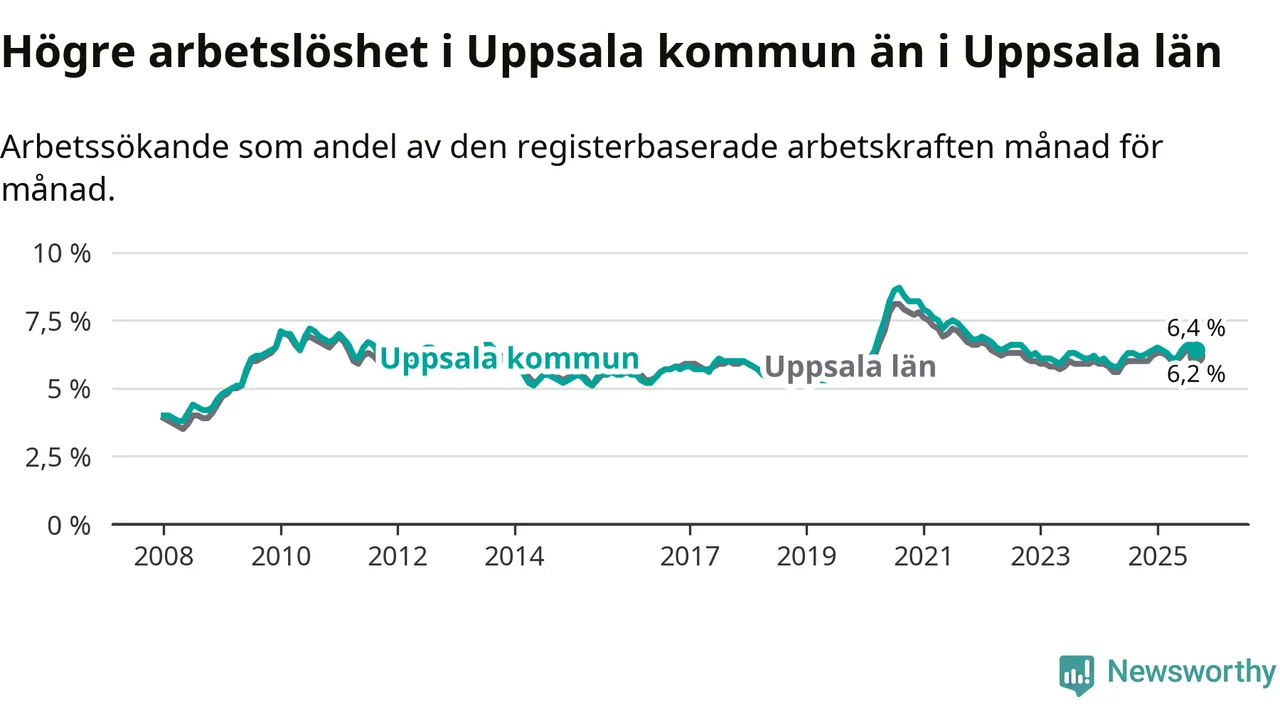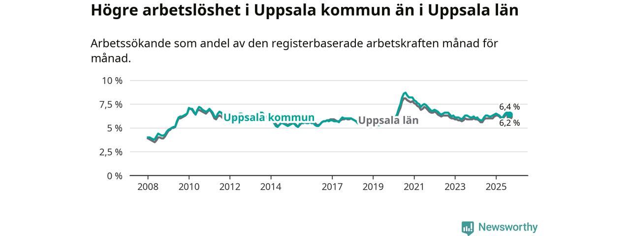 Under september månad rapporterade Uppsala kommun en total arbetslöshet på 6,4 procent. Det är en ökning jämfört med samma tidpunkt i fjol (+0,2 procentenheter). Även i Uppsala län stiger arbetslösheten .