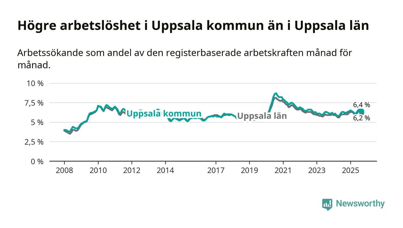 Uppsala hade redan tidigare högre arbetslöshet än snittet i hela Uppsala län och nu växer klyftan (6,4 procent i kommunen, jämfört med 6,2 procent i hela länet). Östhammar har den lägsta arbetslösheten i länet (3,7 procent), medan Älvkarleby har den högsta (7,9 procent). För att Uppsala skulle komma ner i samma arbetslöshetsnivå som Östhammar skulle 3 388 personer behöva sysselsättas.