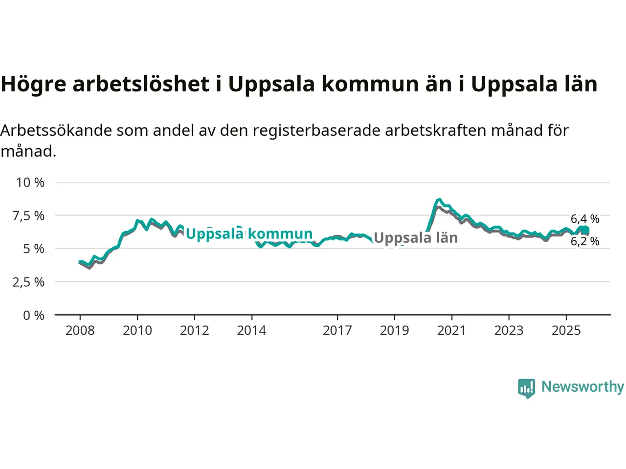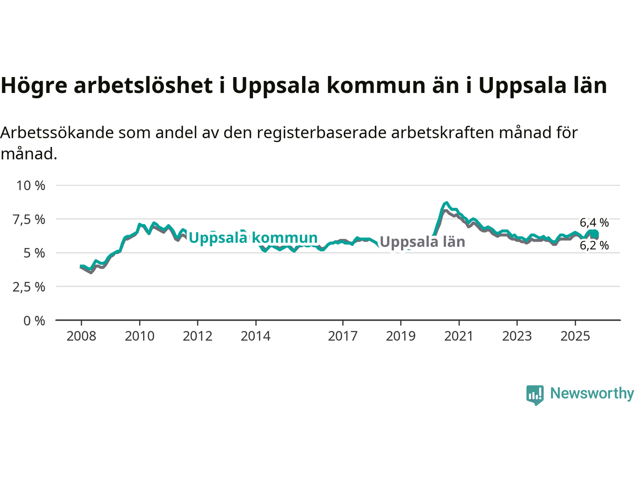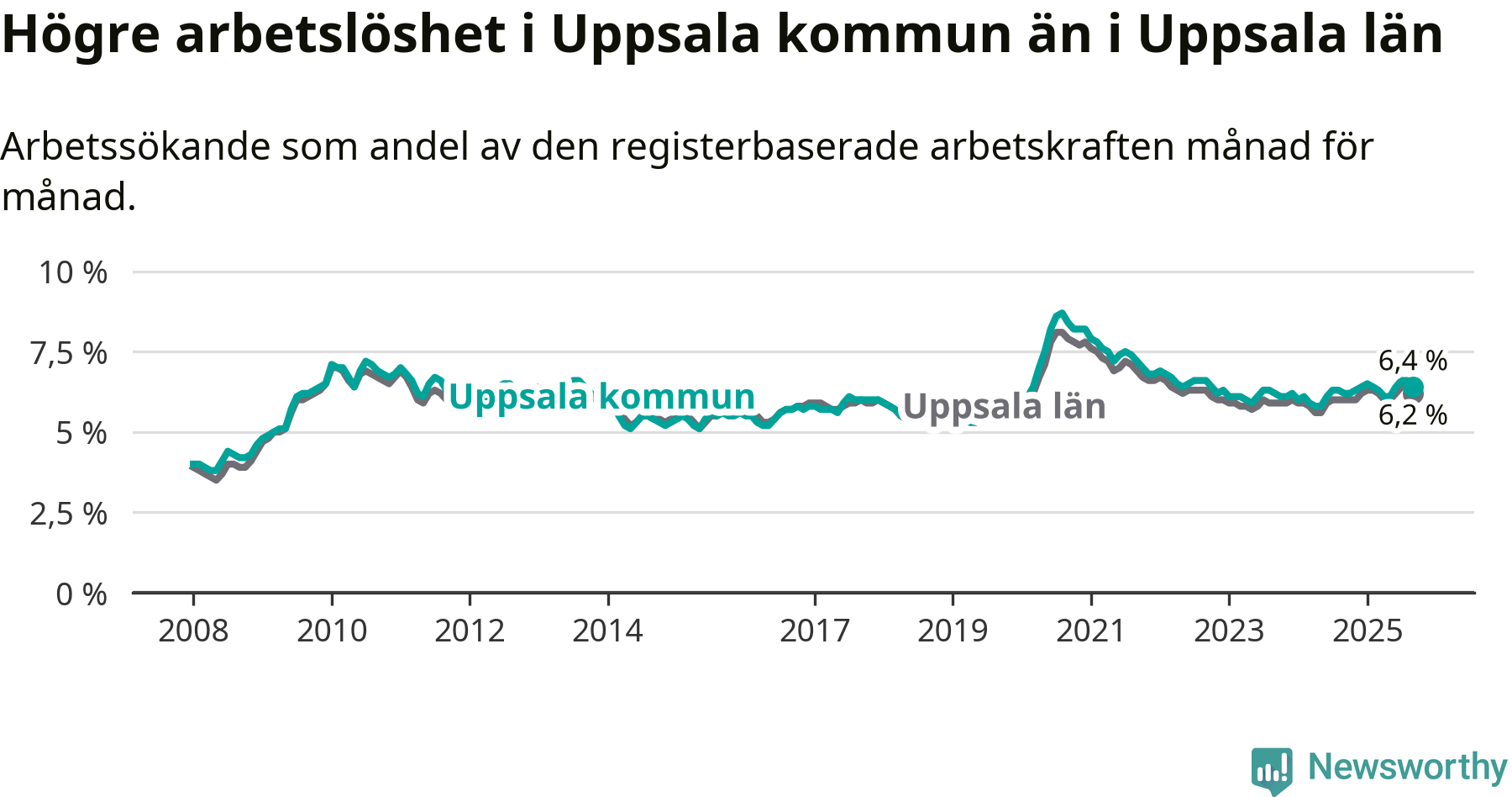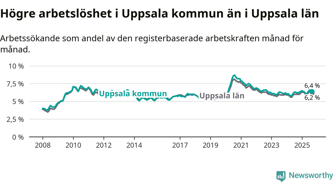 Graf: Arbetslöshet i Uppsala kommun och Uppsala län