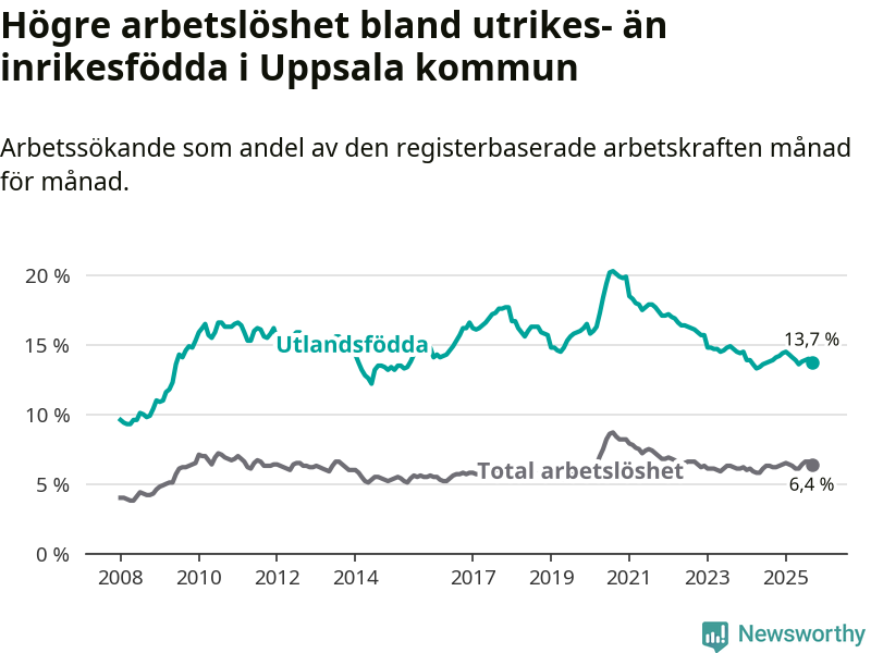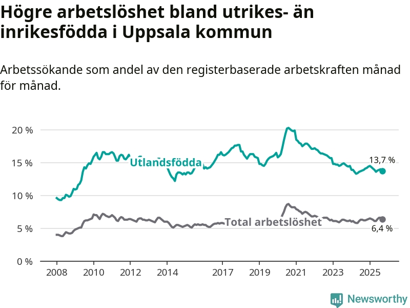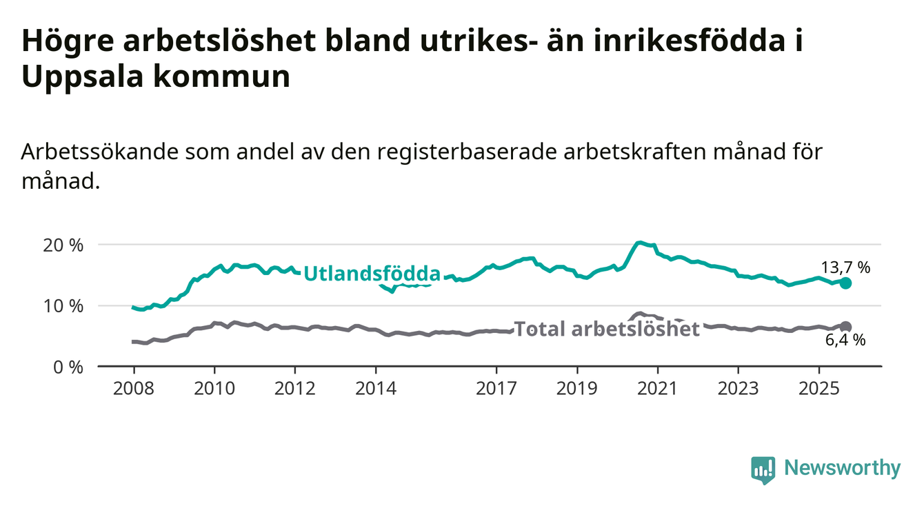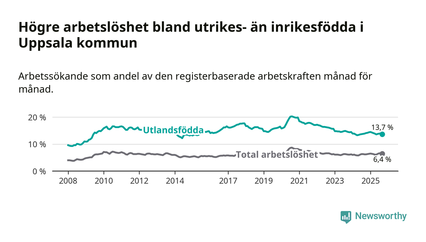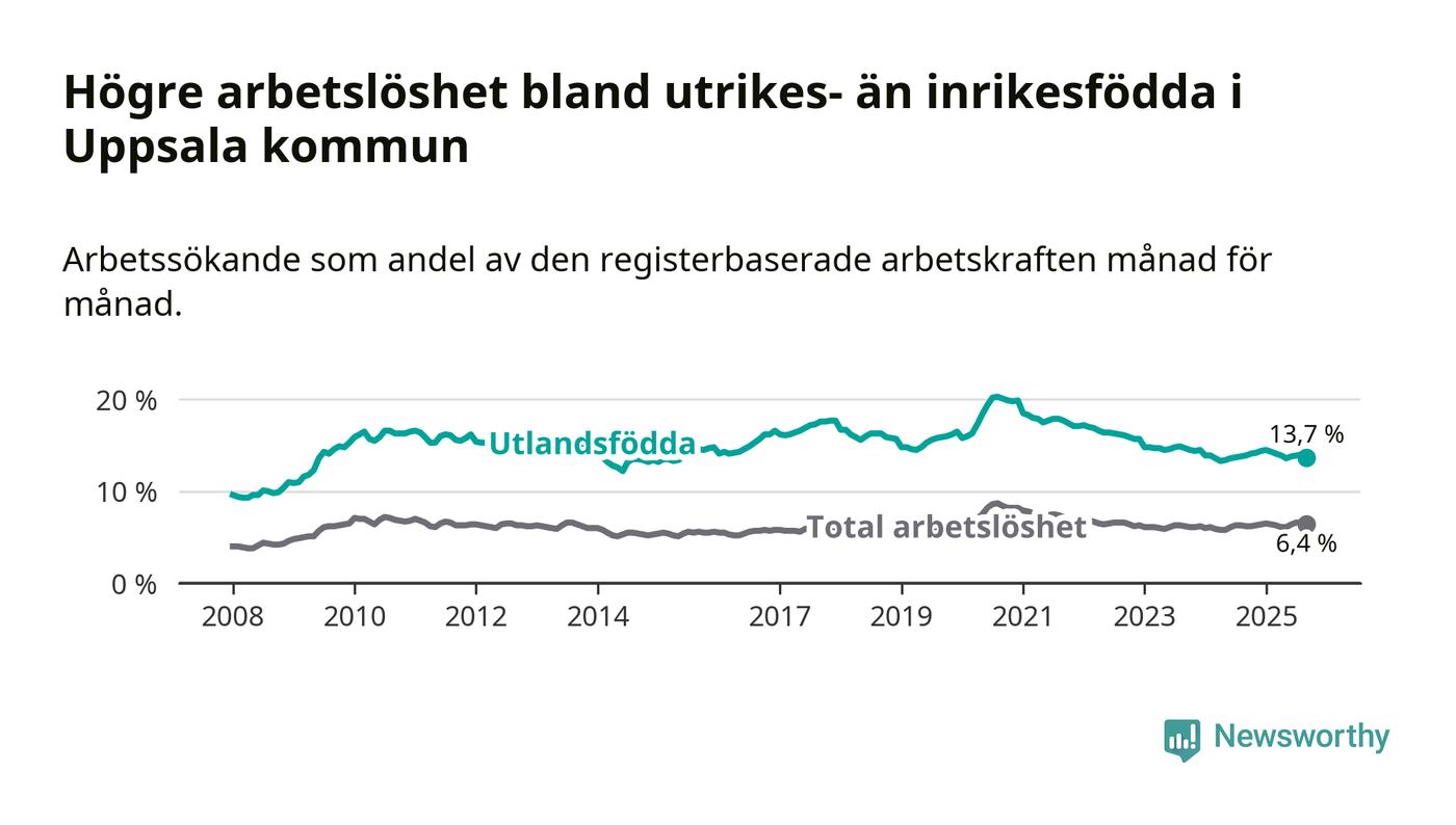 Arbetslösheten bland utlandsfödda var 13,7 procent i Uppsala under september månad, motsvarande 4 694 av 34 263 personer. Det är 0,2 procentenheter färre än vid samma tidpunkt i fjol (+22 om man räknar personer). Den senaste månadens nedgång innebär ett trendbrott. Under de åtta föregående månaderna hade arbetslösheten bland utlandsfödda varit högre än motsvarande tidpunkt året innan.