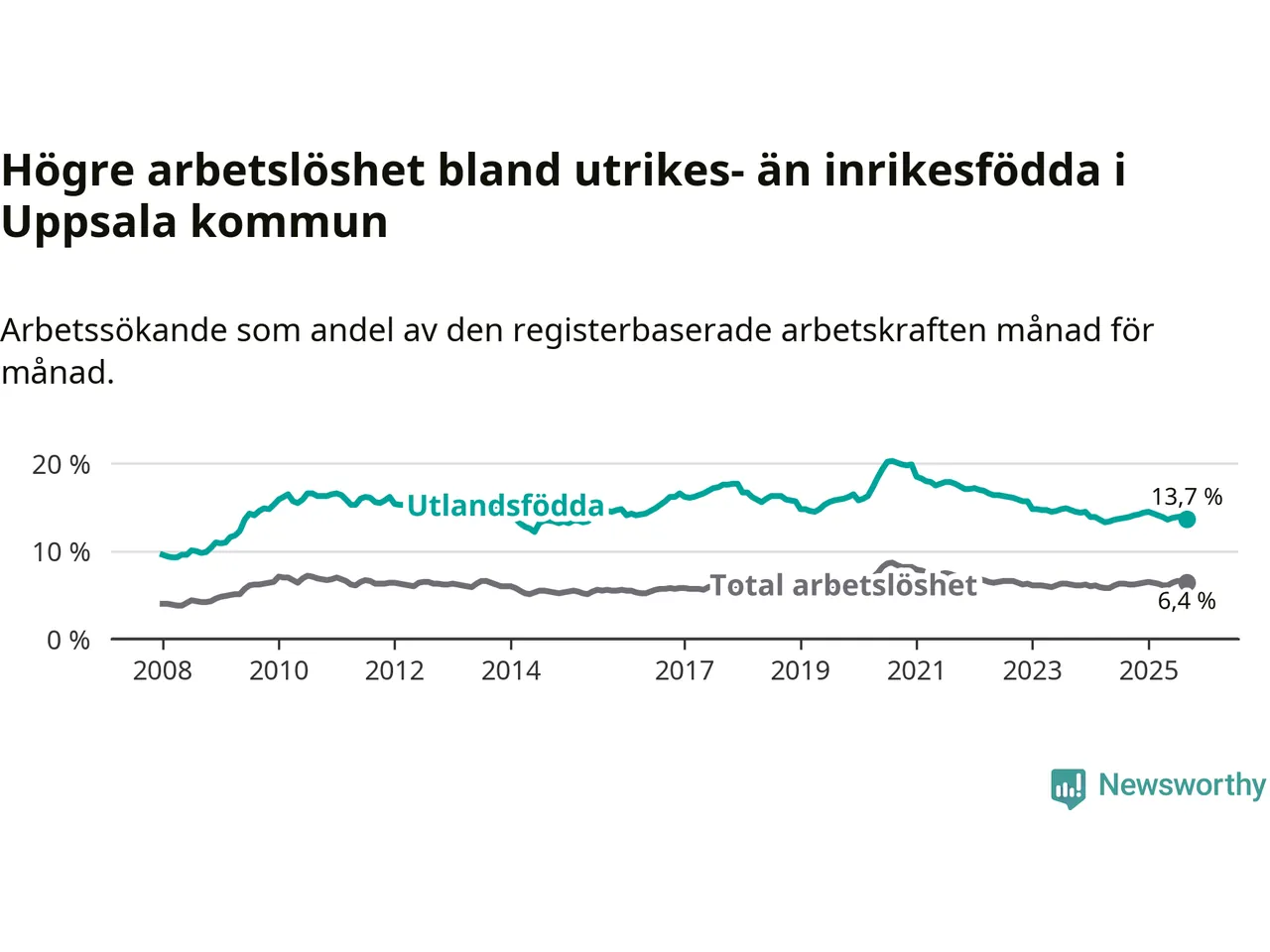 Graf: Skillnad i arbetslöshet mellan utrikesfödda och hela befolkningen i Uppsala kommun