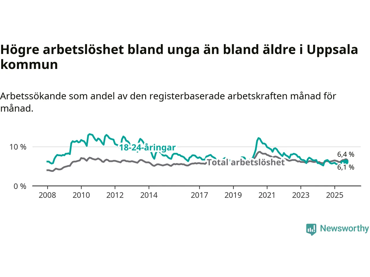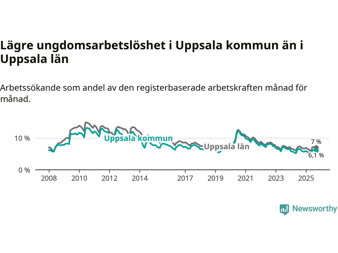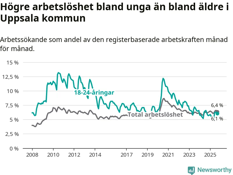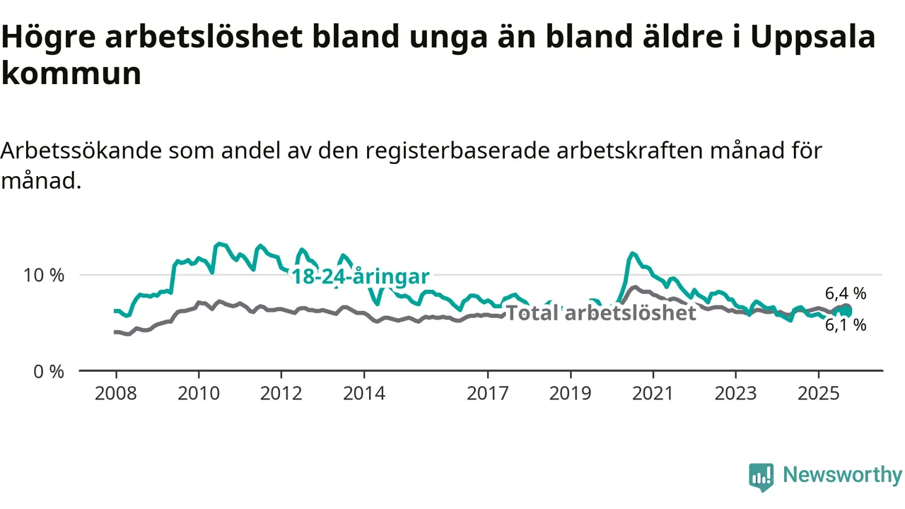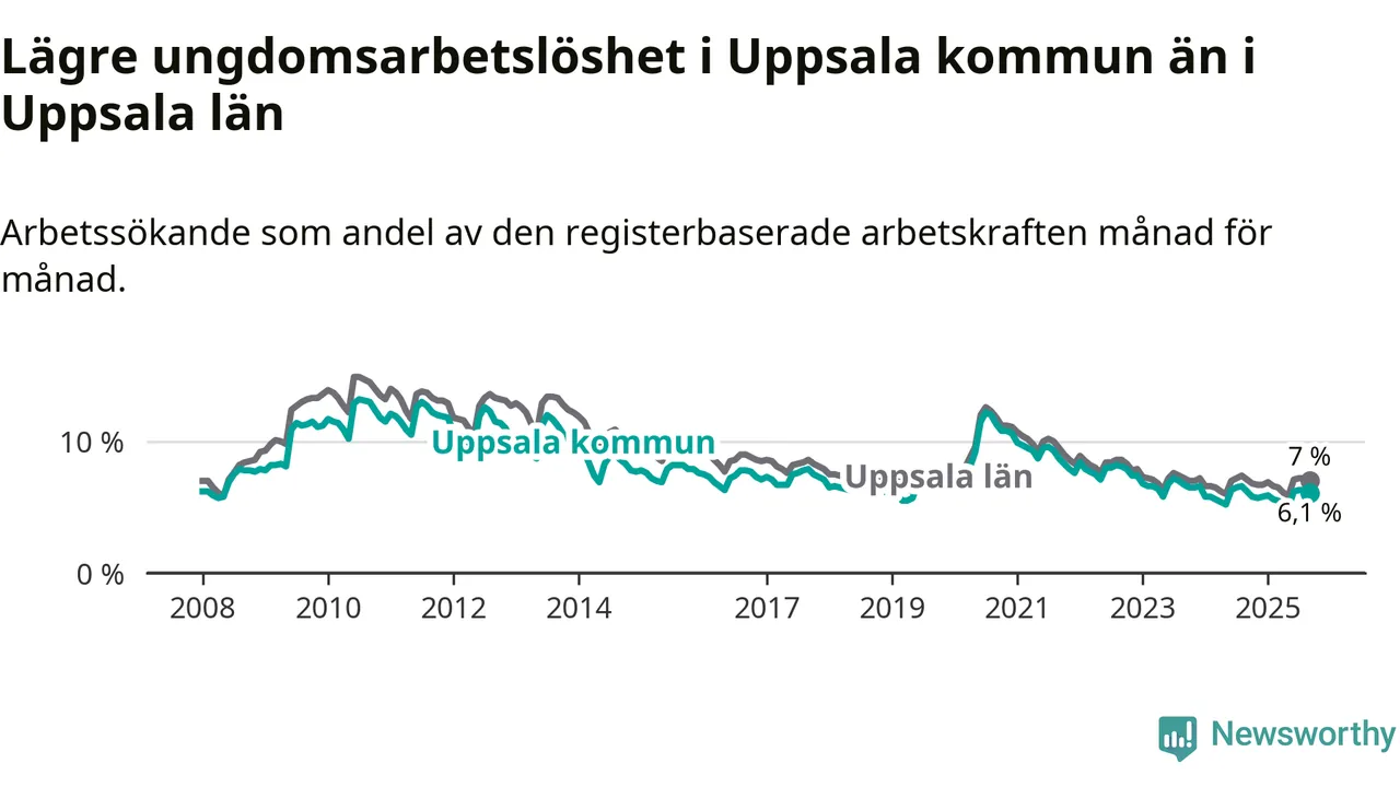 Graf: Arbetslöshet bland unga i Uppsala kommun och Uppsala län