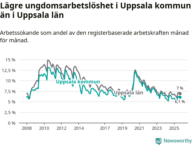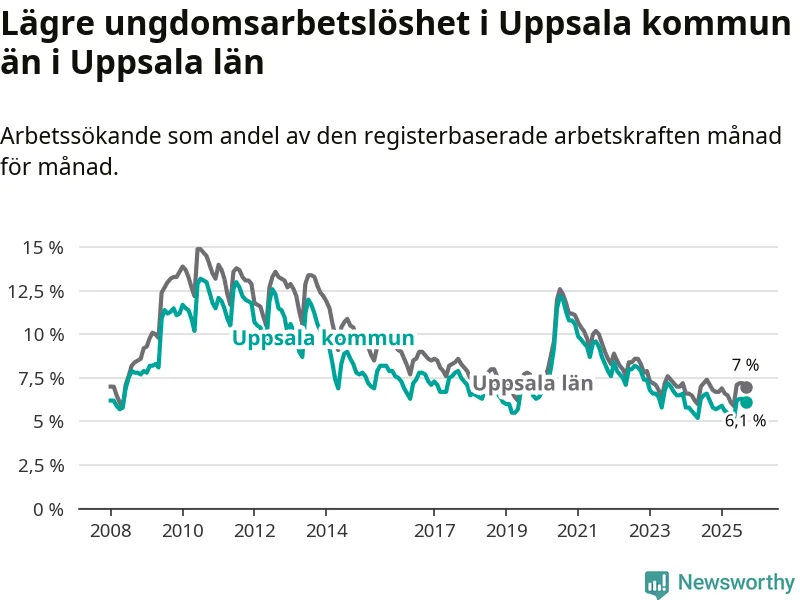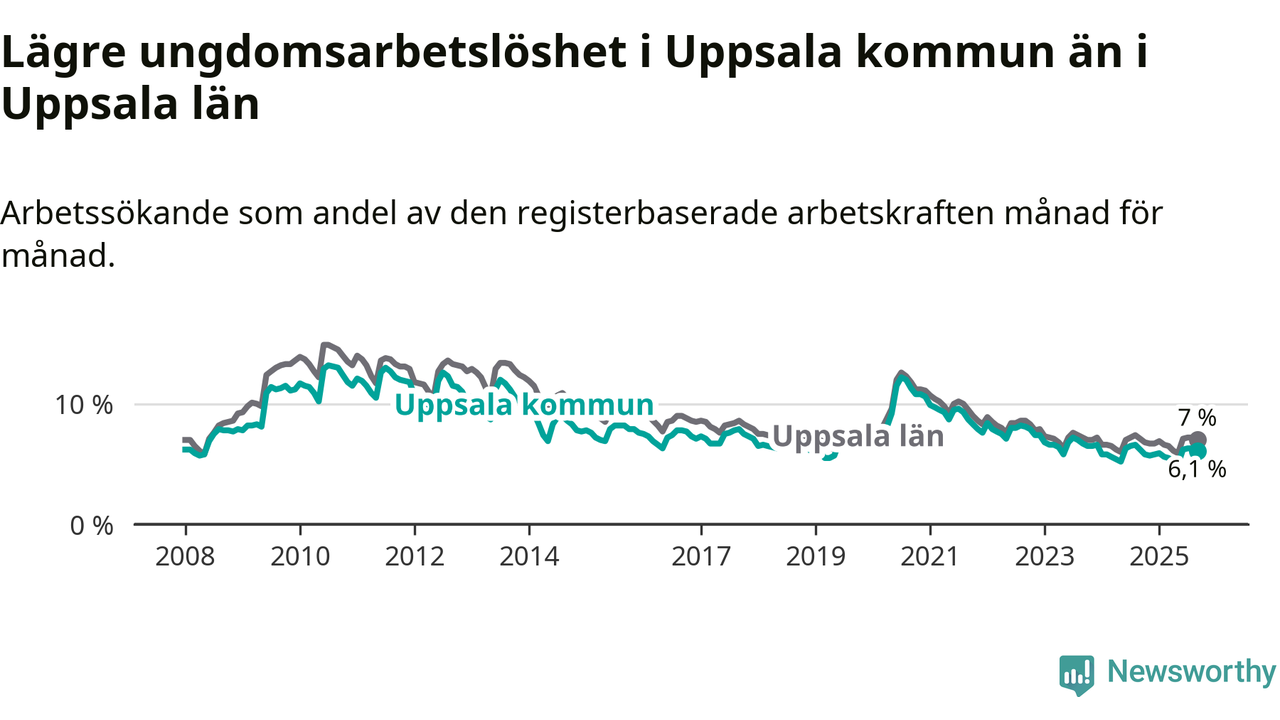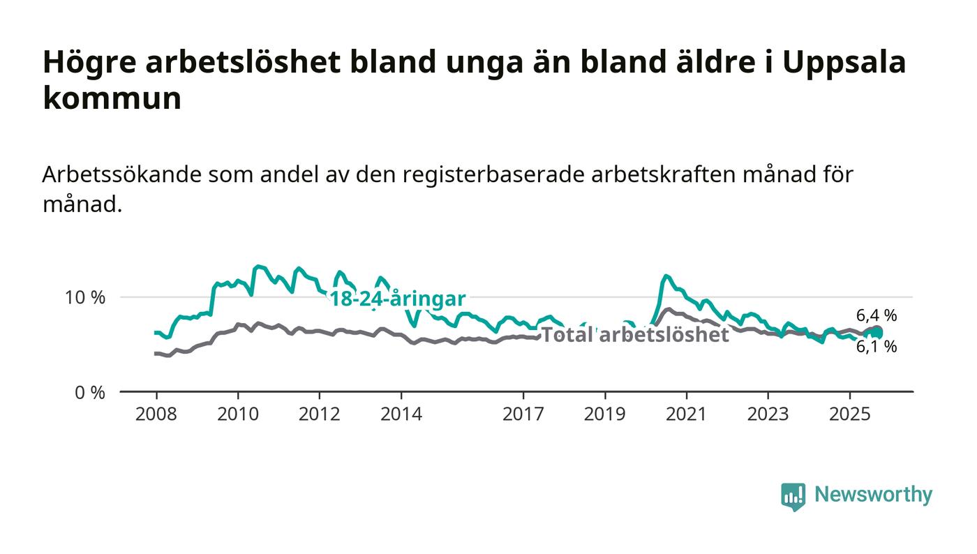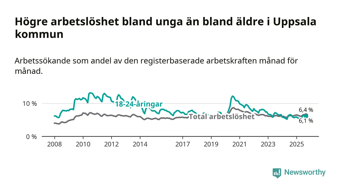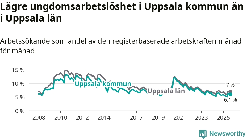 Medan Uppsala har högre total arbetslöshet än Uppsala, ligger ungdomsarbetslösheten 0,9 procentenheter lägre i Uppsala.
