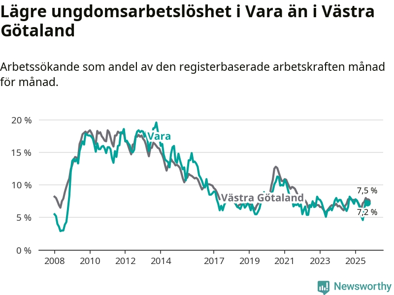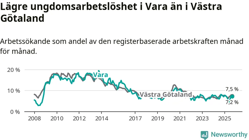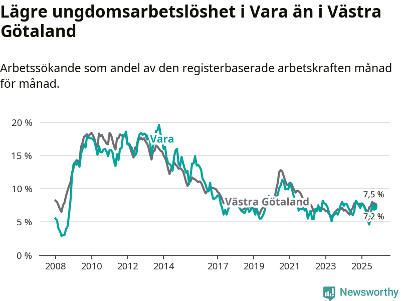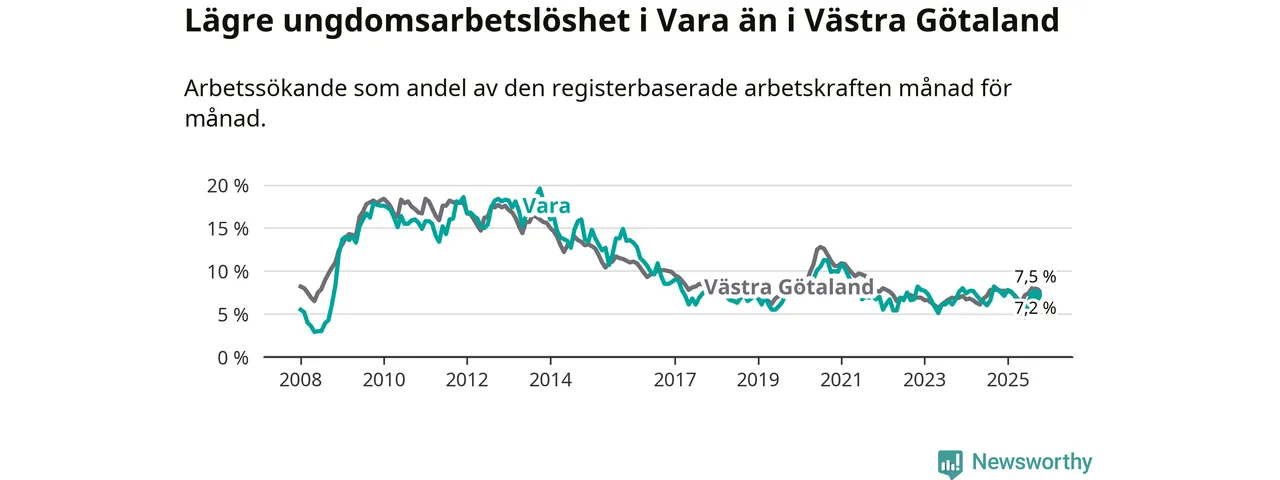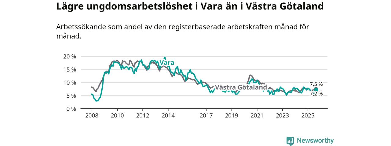 Precis som den totala arbetslösheten ligger ungdomsarbetslösheten i Vara lägre än i Västra Götaland som helhet. Skillnaden mellan kommunen och länet är 0,3 procentenheter.