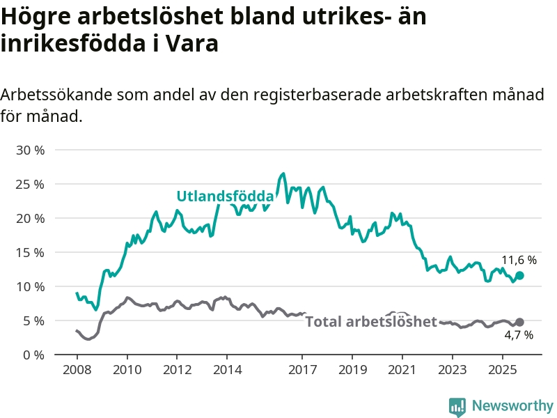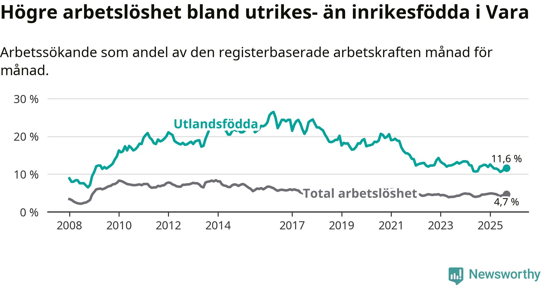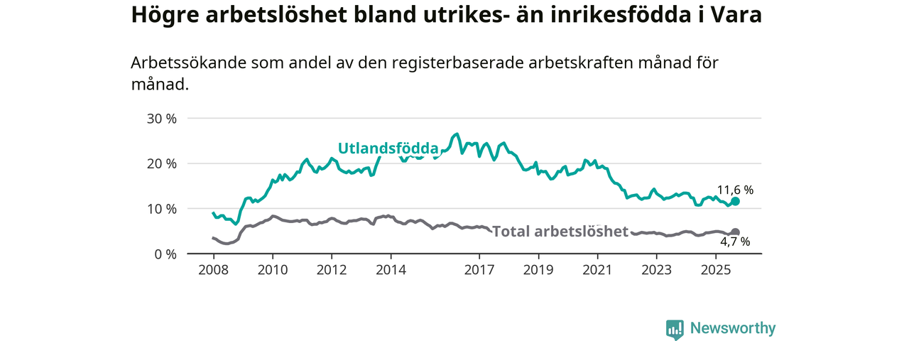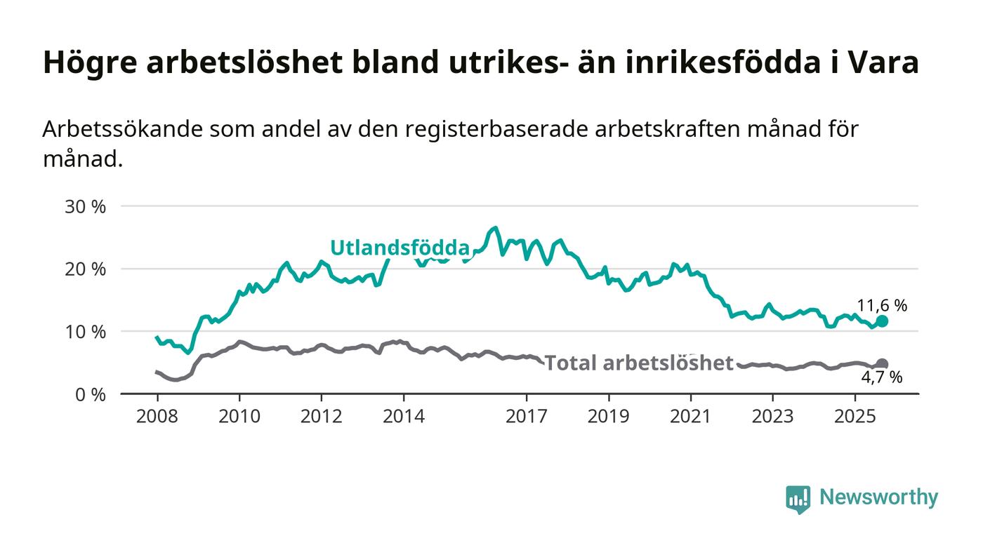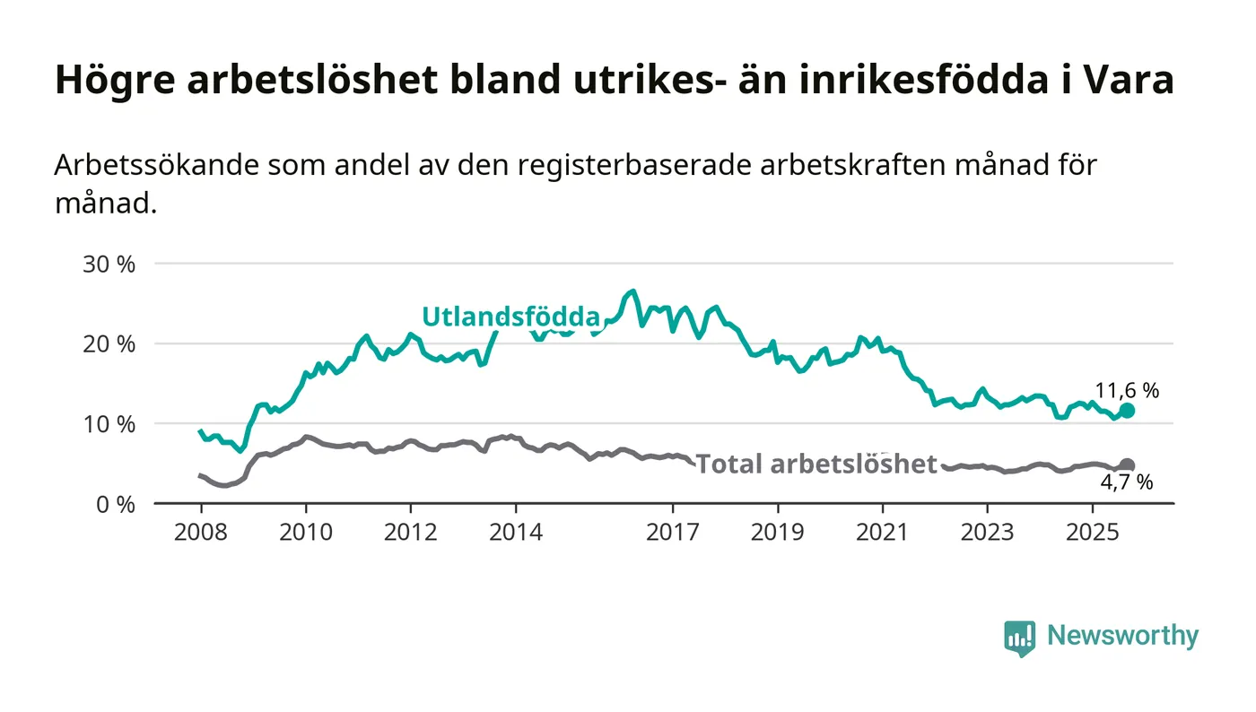 Skillnaden i arbetslöshet mellan utrikesfödda och hela befolkningen är 6,9 procentenheter i Vara. Det är en mindre skillnad än för ett år sedan (−0,7 procentenheter).
