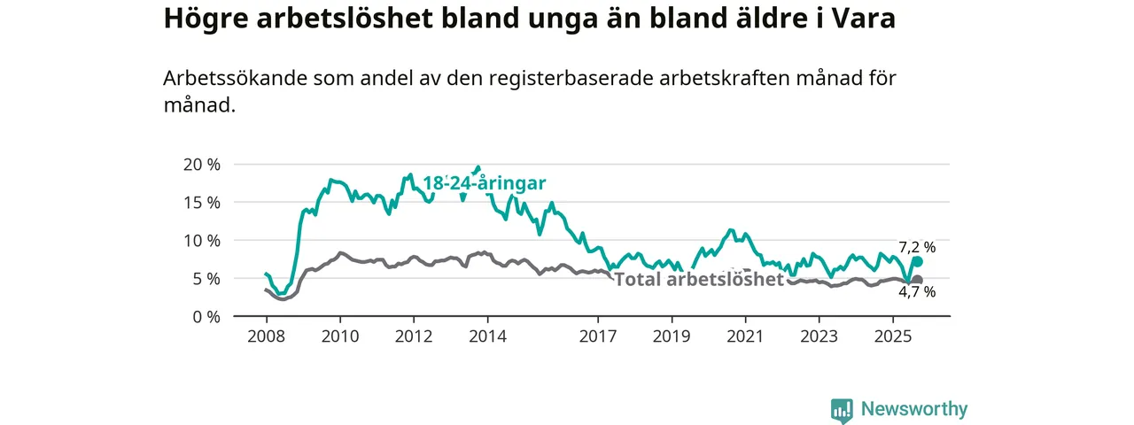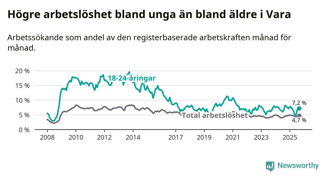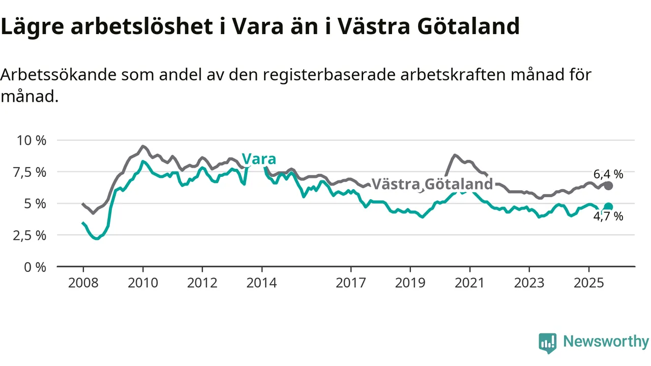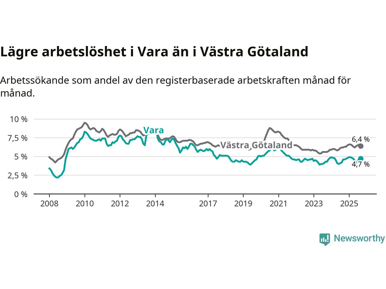 Under september månad rapporterade Vara kommun en total arbetslöshet på 4,7 procent. Det är en ökning jämfört med samma tidpunkt i fjol (+0,1 procentenheter). Även i Västra Götalands län stiger arbetslösheten .