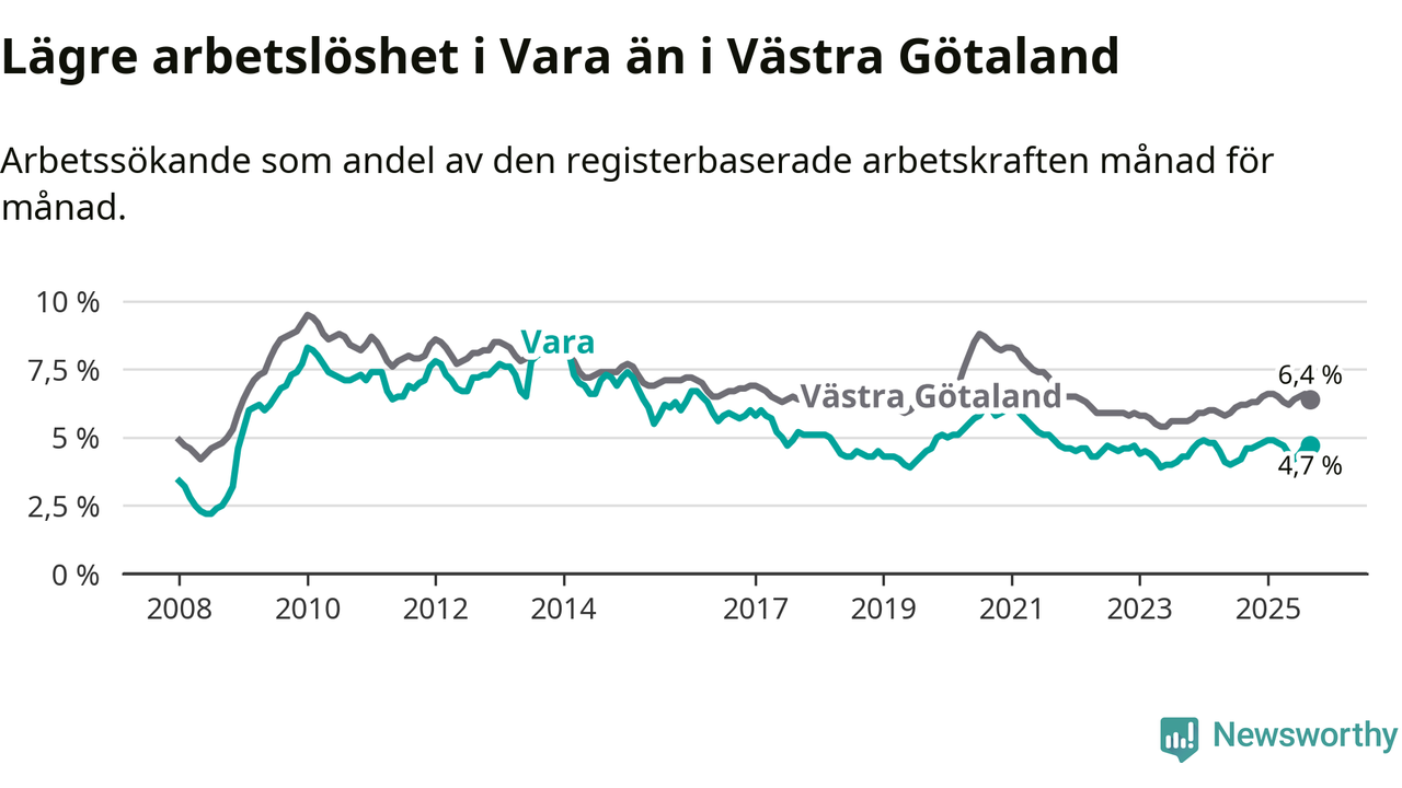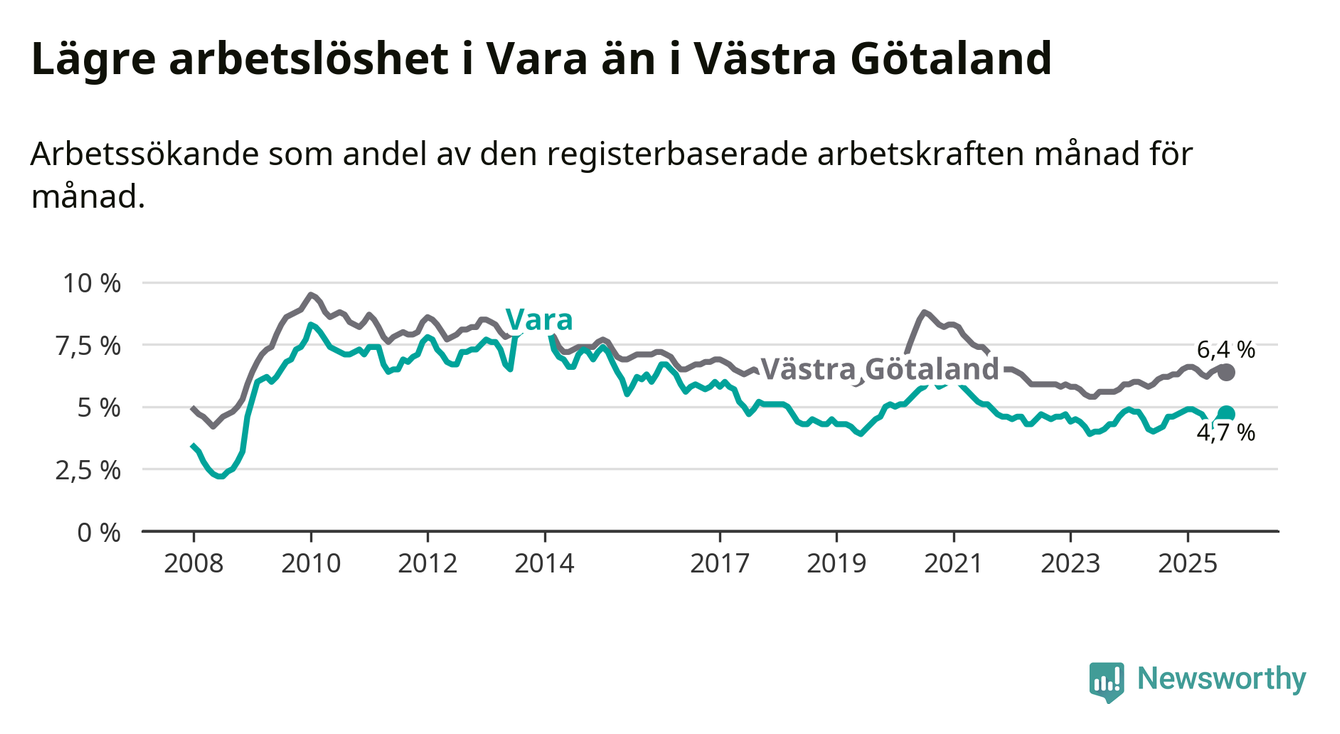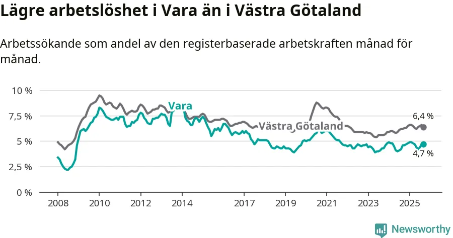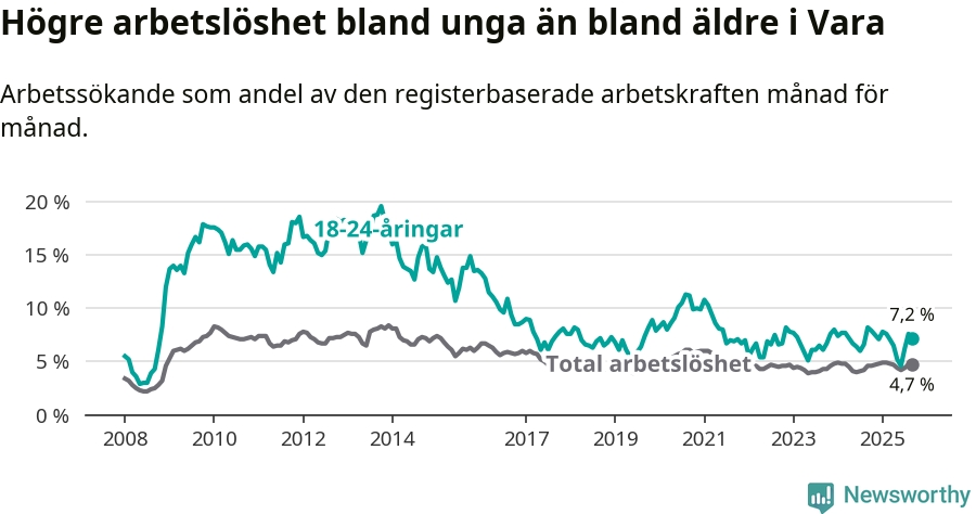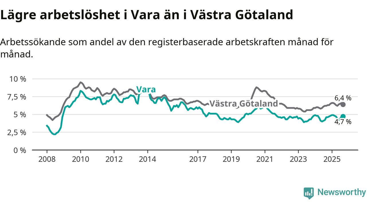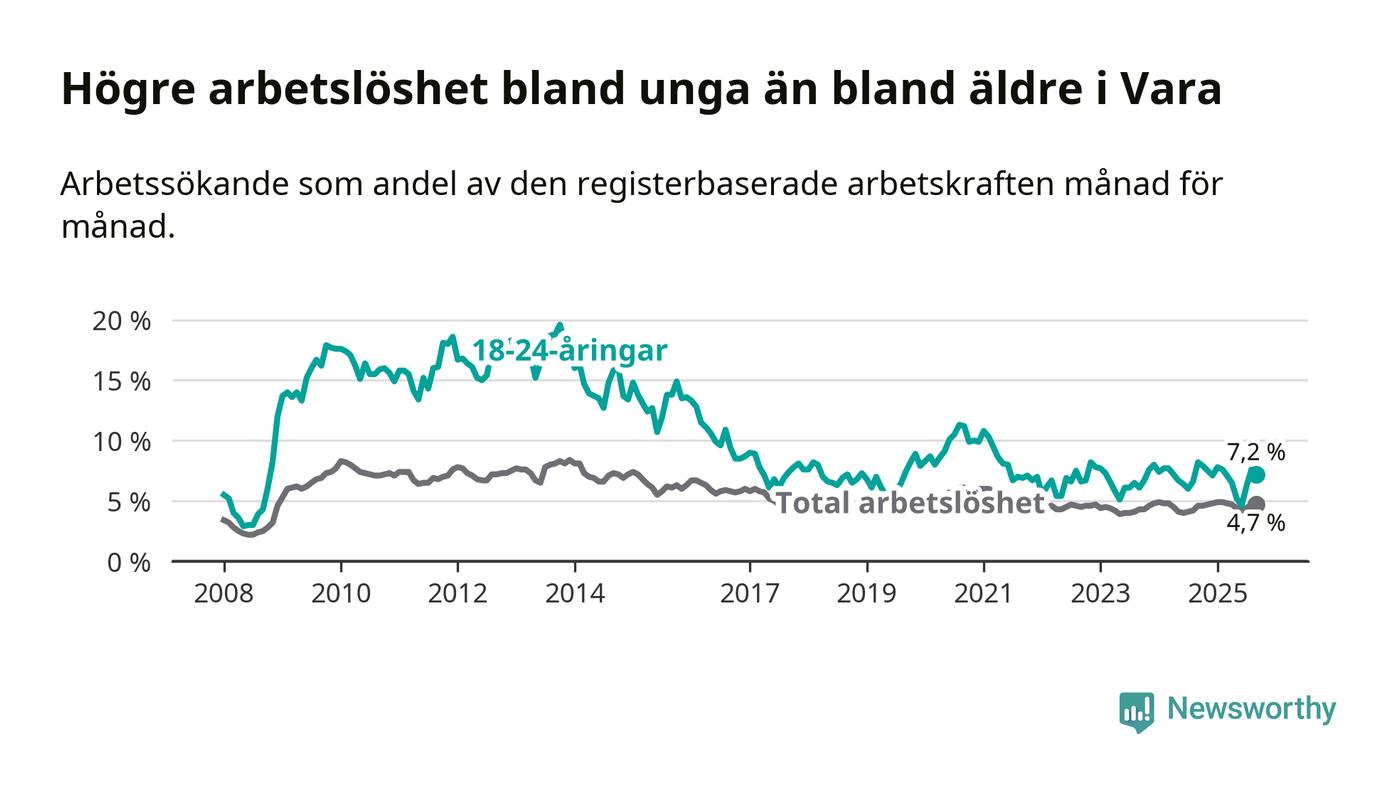 Under september månad rapporterade Vara kommun en total arbetslöshet på 4,7 procent. Det är en ökning jämfört med samma tidpunkt i fjol (+0,1 procentenheter). Även i Västra Götalands län stiger arbetslösheten .