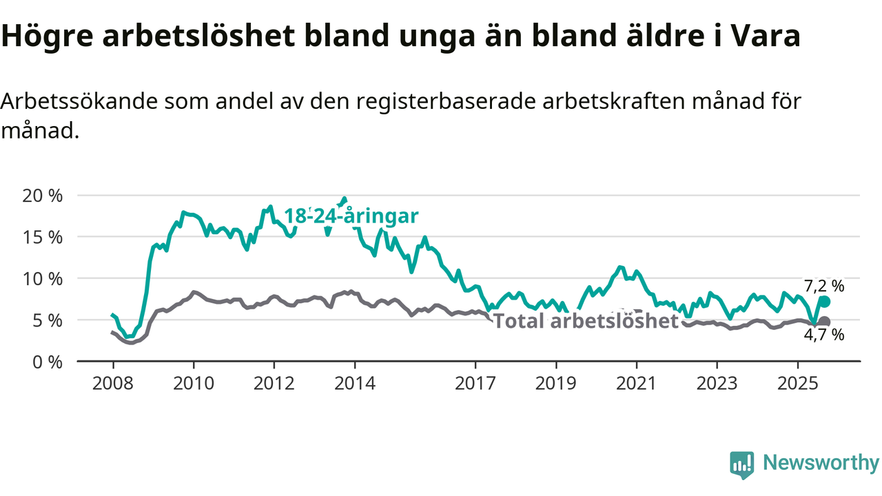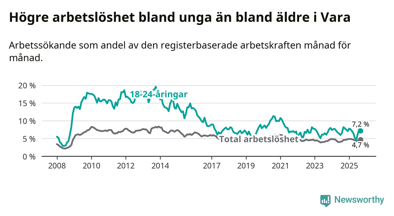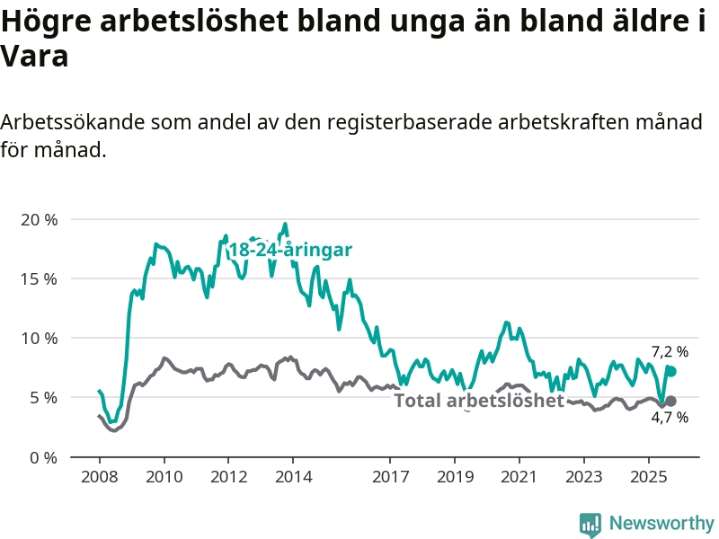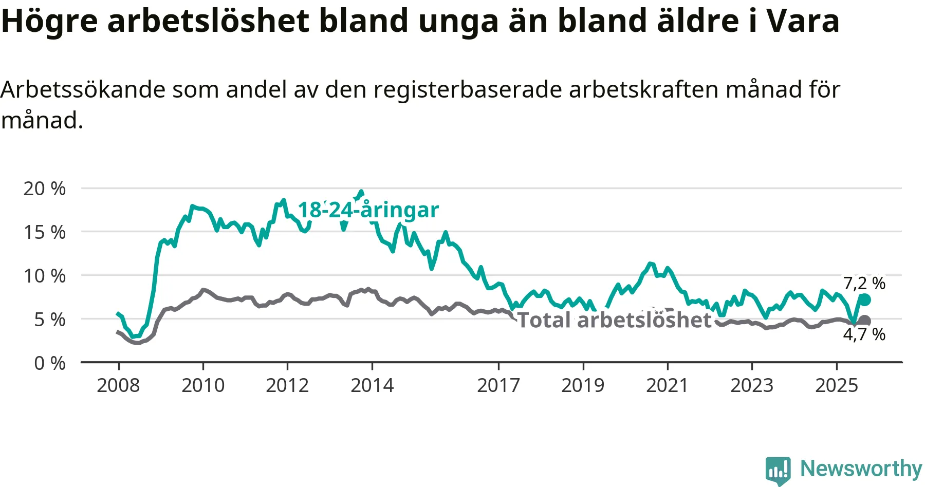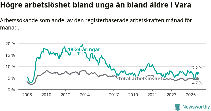Under september månad rapporterade Vara kommun en total arbetslöshet på 4,7 procent. Det är en ökning jämfört med samma tidpunkt i fjol (+0,1 procentenheter). Även i Västra Götalands län stiger arbetslösheten .