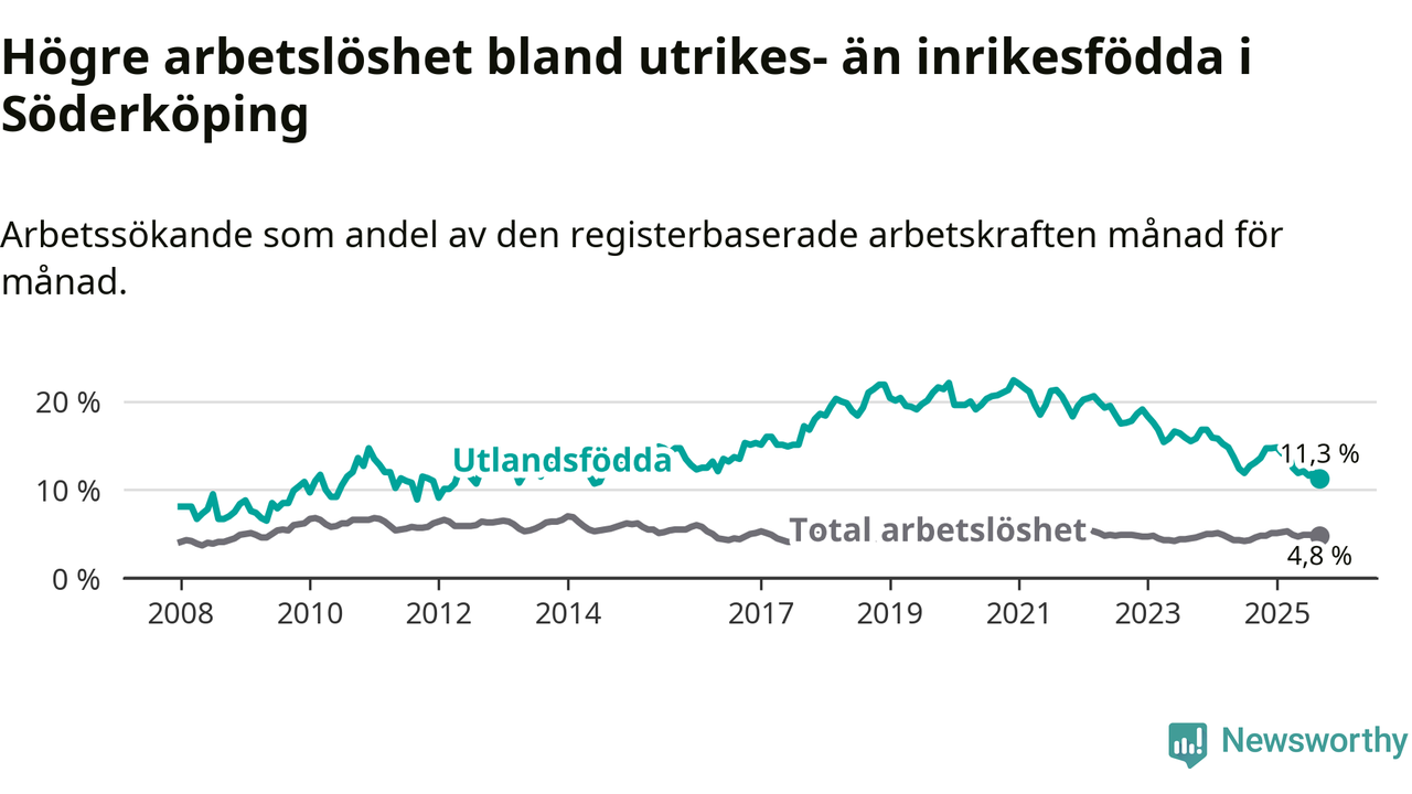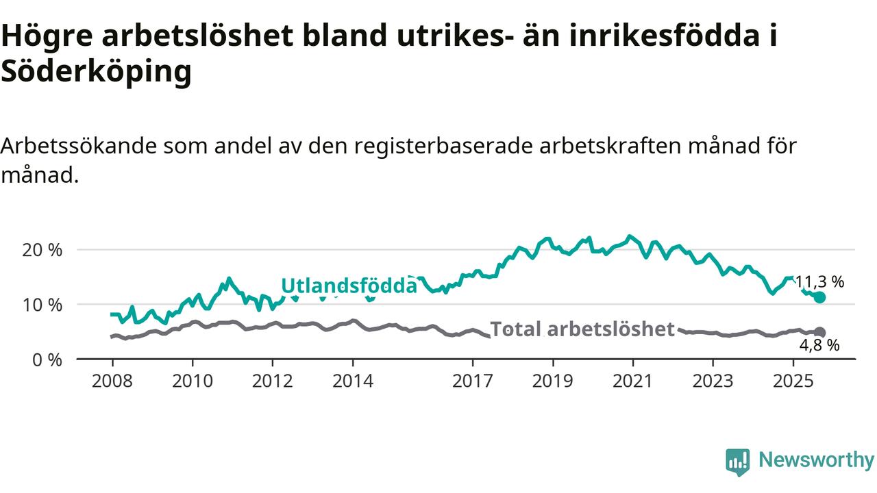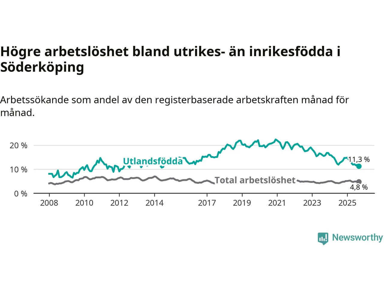 Skillnaden i arbetslöshet mellan utrikesfödda och hela befolkningen är 6,5 procentenheter i Söderköping. Det är en betydligt mindre skillnad än för ett år sedan (−2,0 procentenheter).
