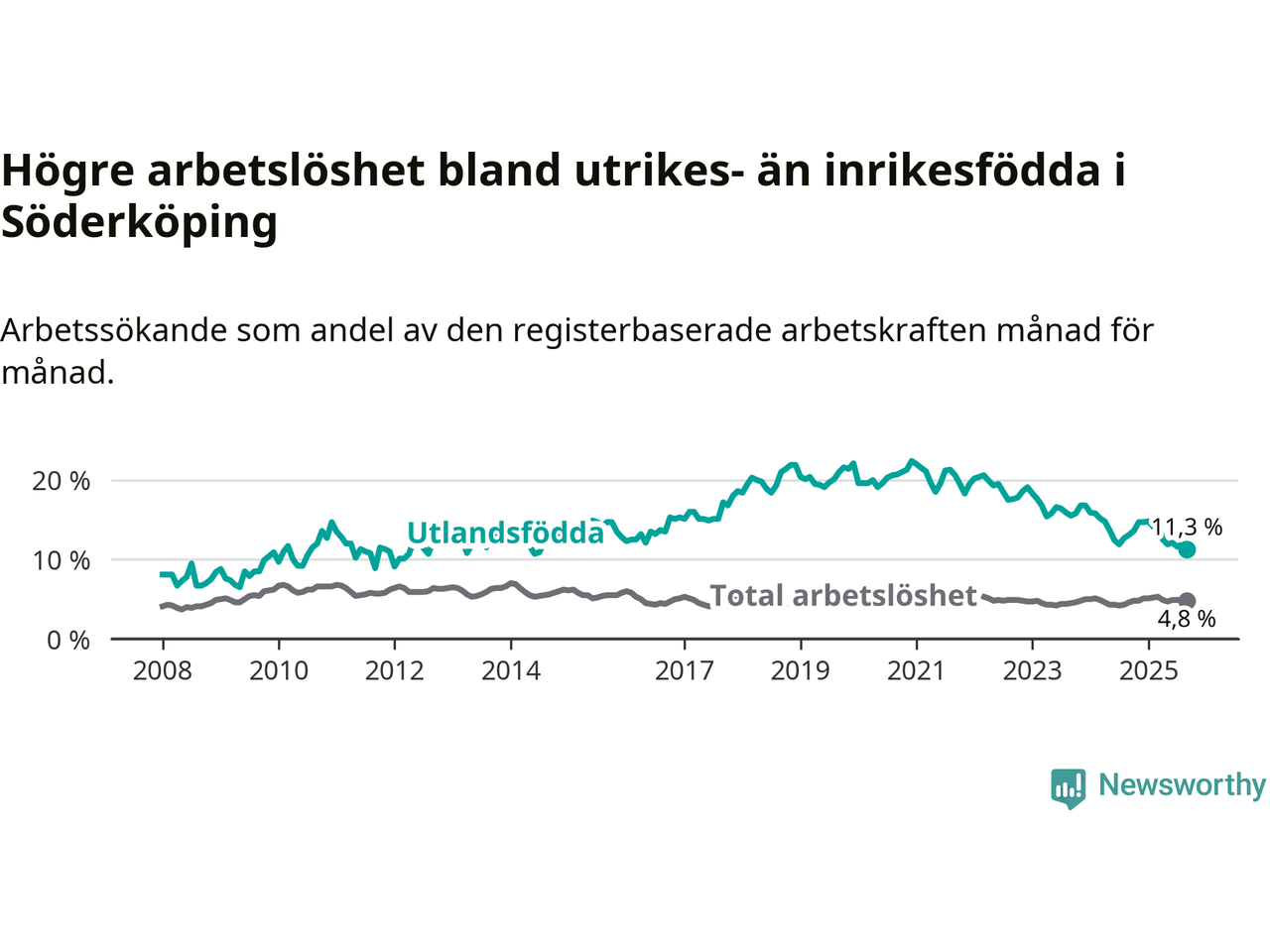Arbetslösheten bland utlandsfödda var 11,3 procent i Söderköping under september månad, motsvarande 65 av 575 personer. Det är 1,8 procentenheter färre än vid samma tidpunkt i fjol (−13 om man räknar personer). Därmed har de utlandsföddas arbetslöshet varit lägre än vid samma tidpunkt i fjol i över två år i sträck. Sedan november 2022 har arbetslösheten bland utlandsfödda minskat från 18,6 till 11,3 procent. Den nuvarande arbetslöshetsnivån är den lägsta sedan juli 2014.