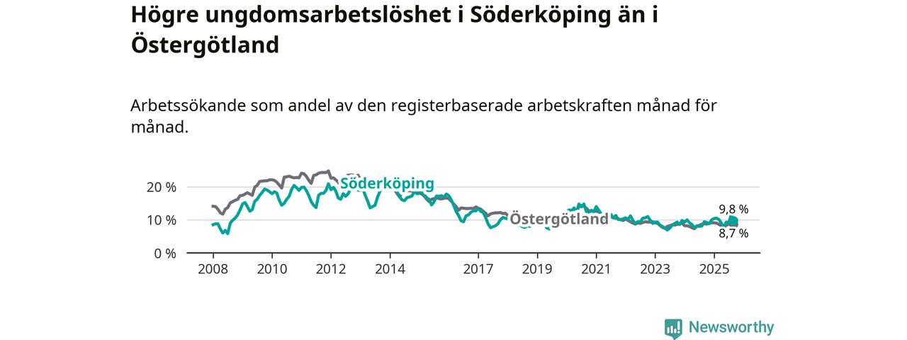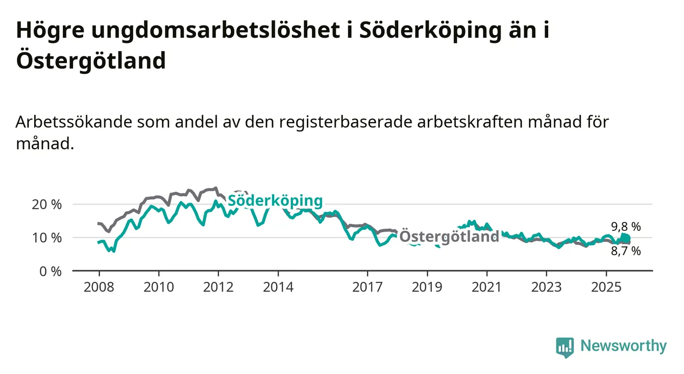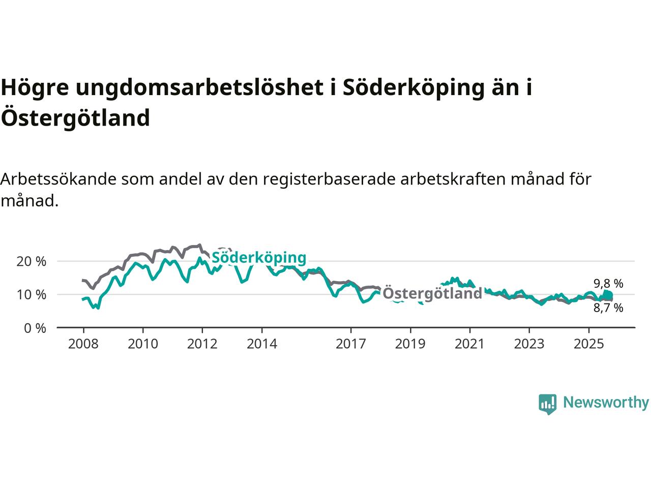 Medan Söderköping har lägre total arbetslöshet än Östergötland, ligger ungdomsarbetslösheten 1,1 procentenheter högre i Söderköping.