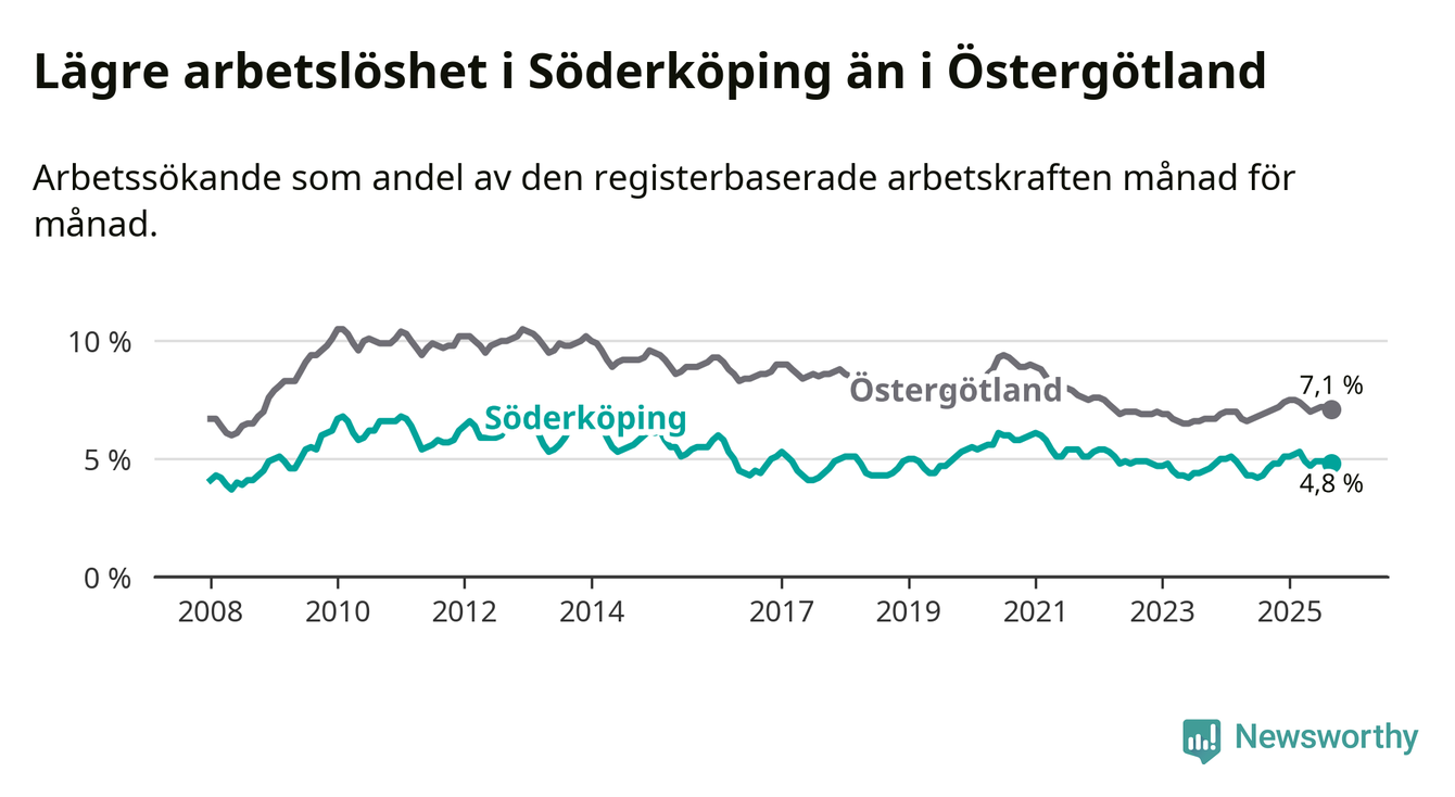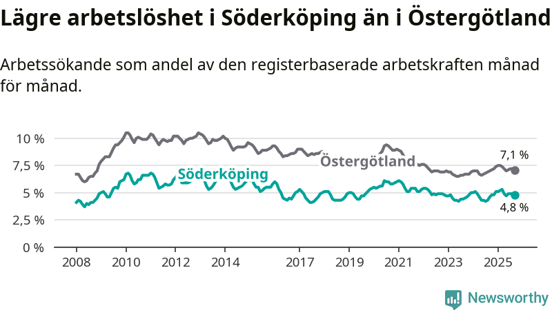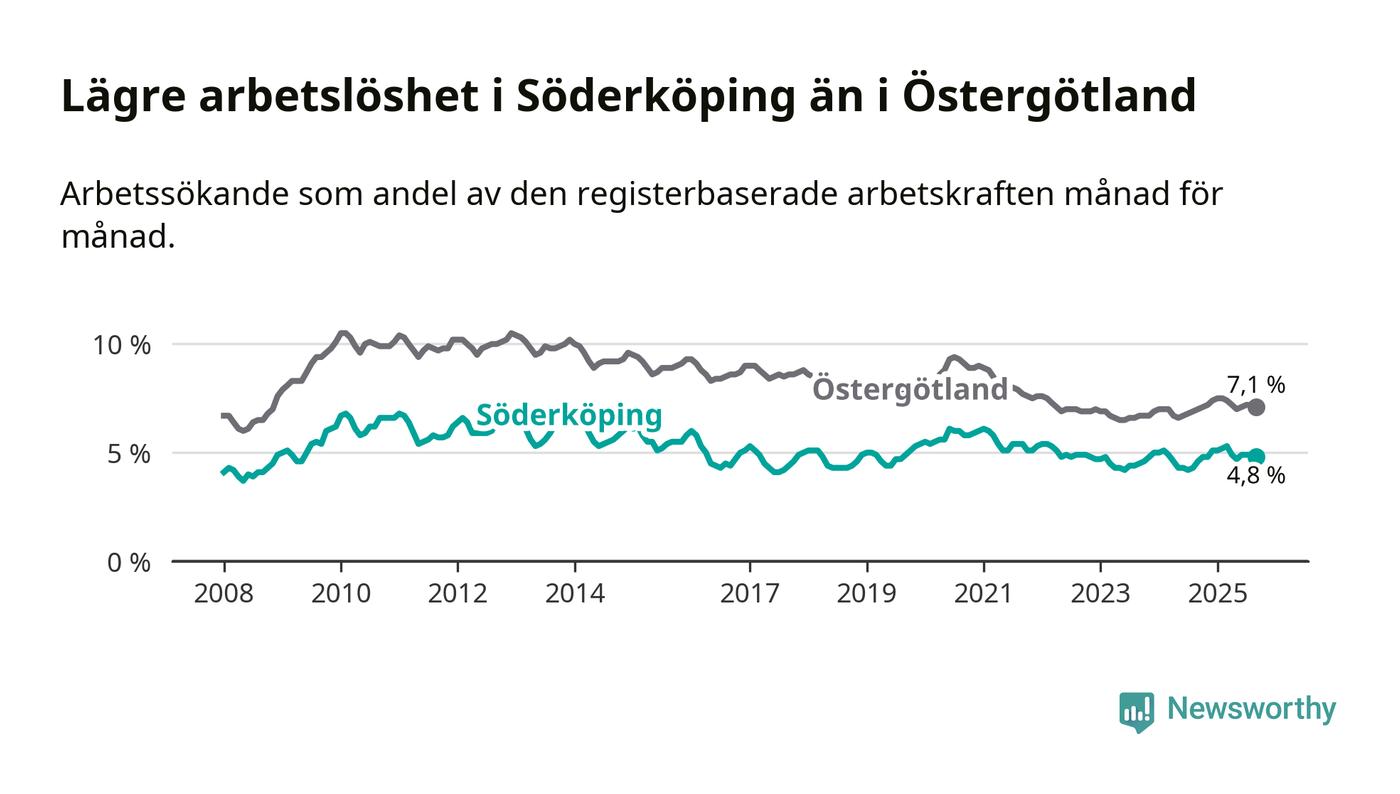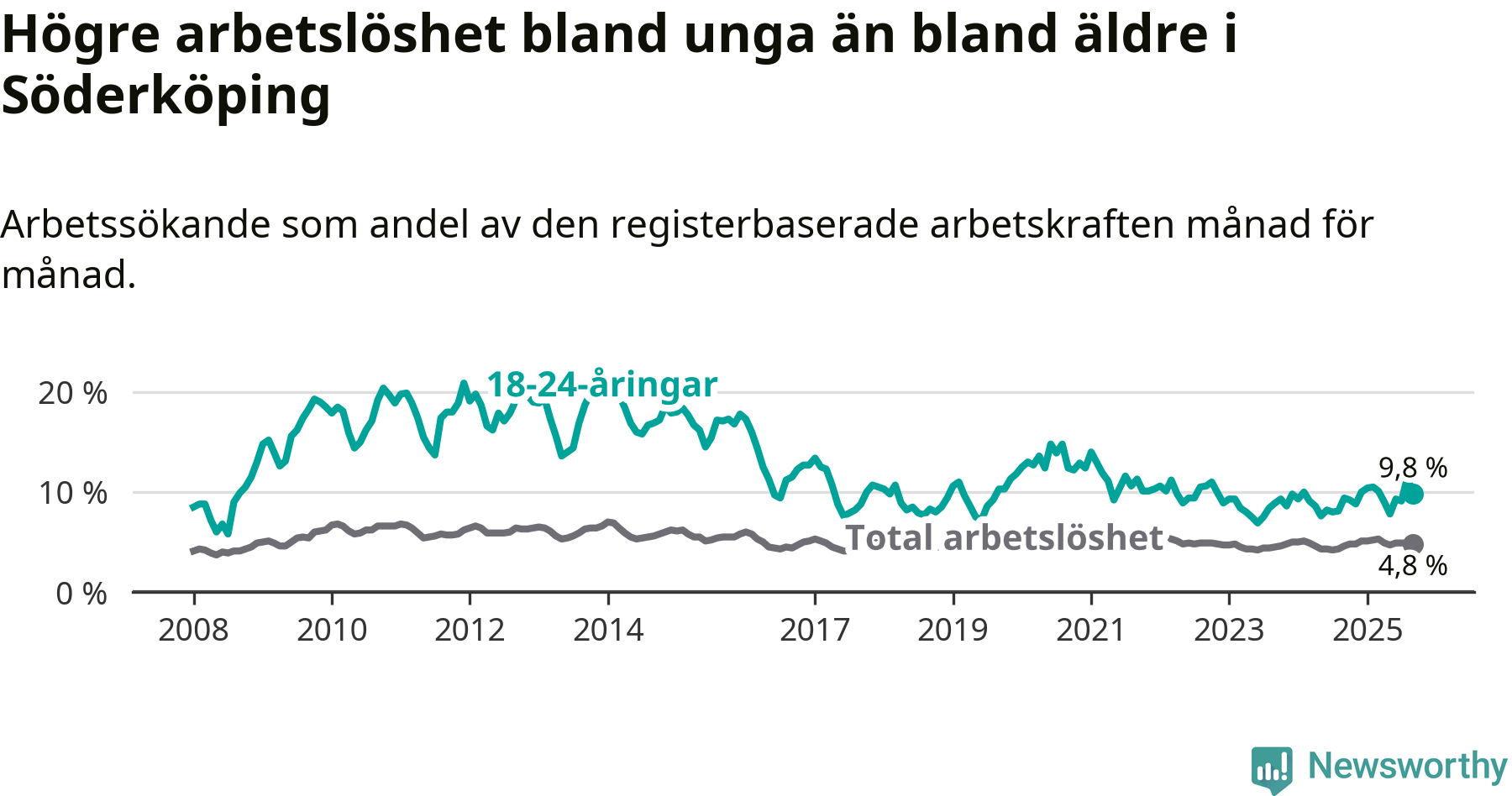 Medan Söderköping har lägre total arbetslöshet än Östergötland, ligger ungdomsarbetslösheten 1,1 procentenheter högre i Söderköping.