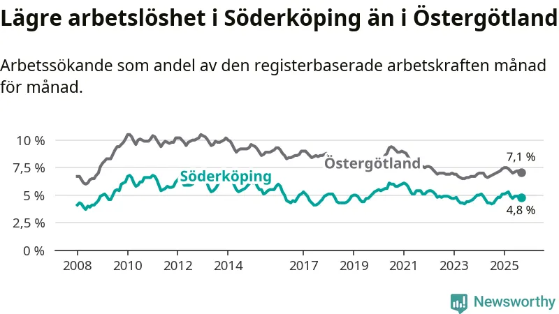 Under september månad rapporterade Söderköpings kommun en total arbetslöshet på 4,8 procent. Det är en ökning jämfört med samma tidpunkt i fjol (+0,2 procentenheter). Även i Östergötlands län stiger arbetslösheten något.