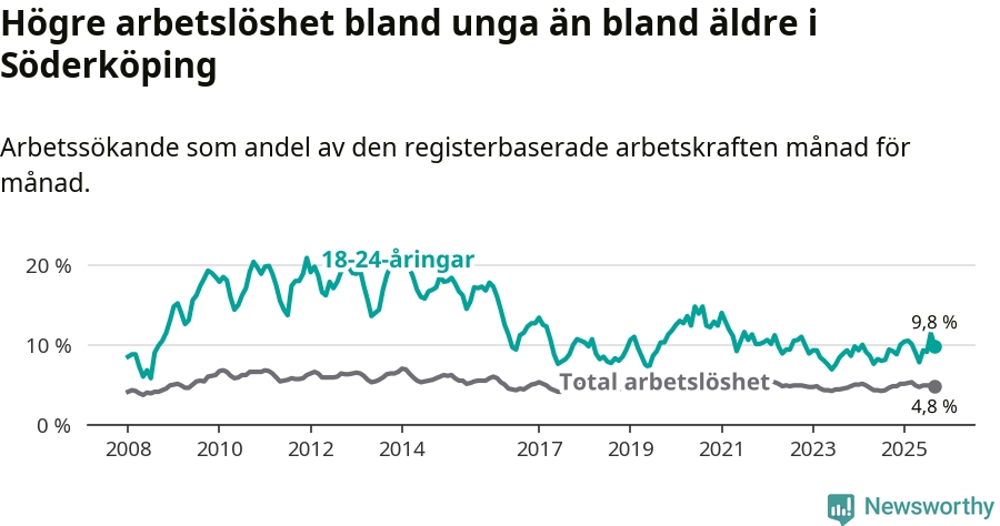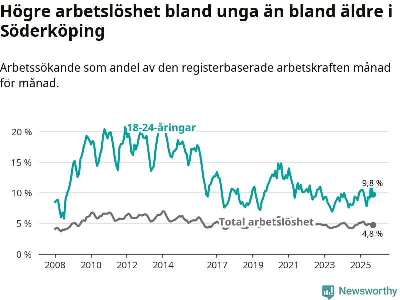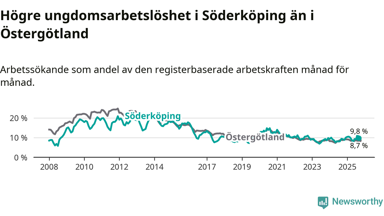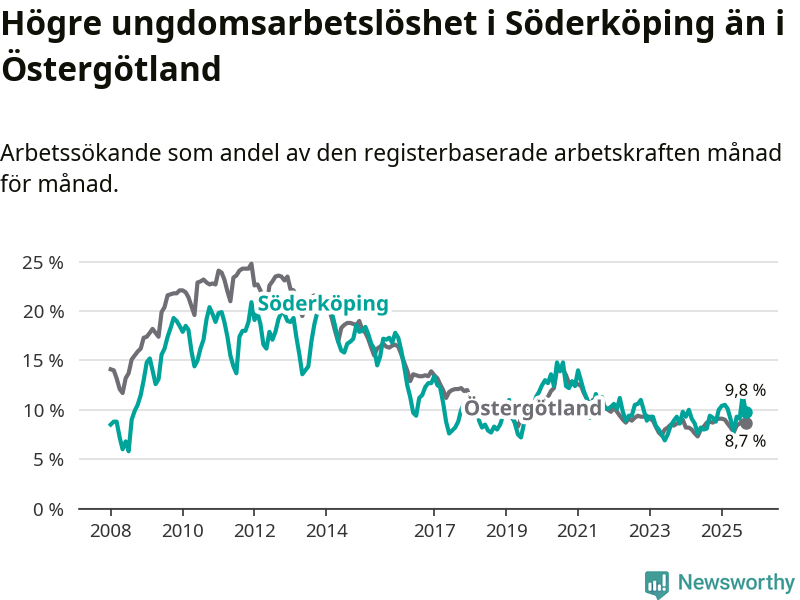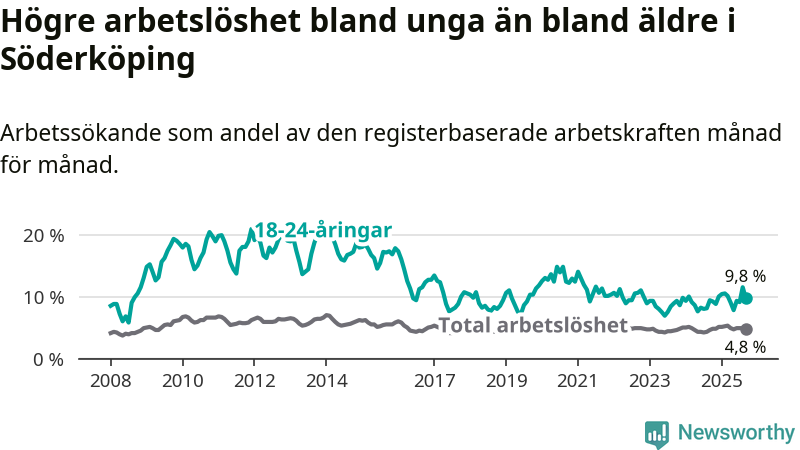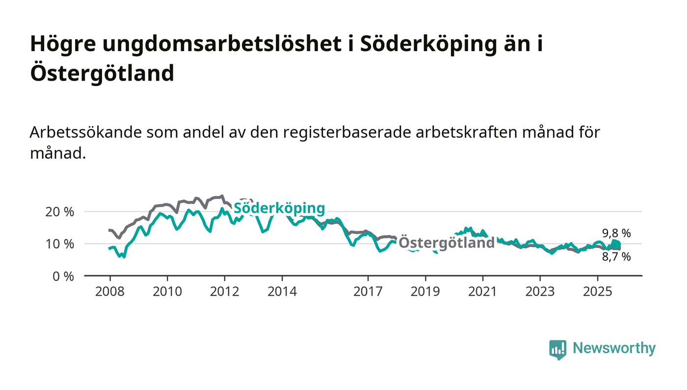 I och med den senaste månadens uppgång har de ungas arbetslöshet i Söderköping stigit elva månader i följd (upp från 9,2 procent i oktober 2024 till 9,8 procent nu).