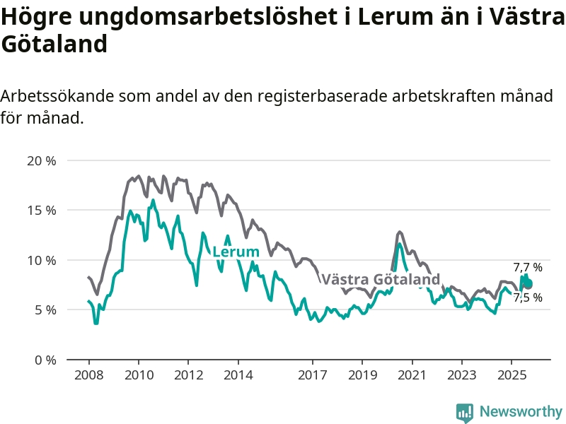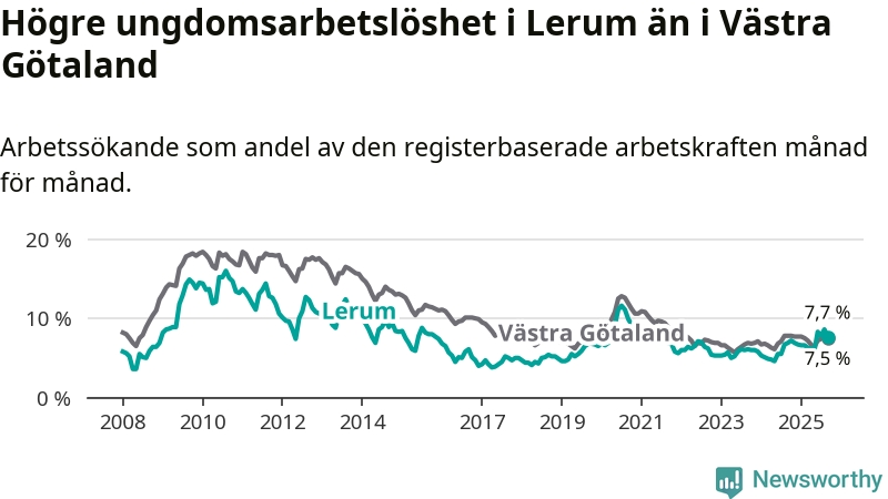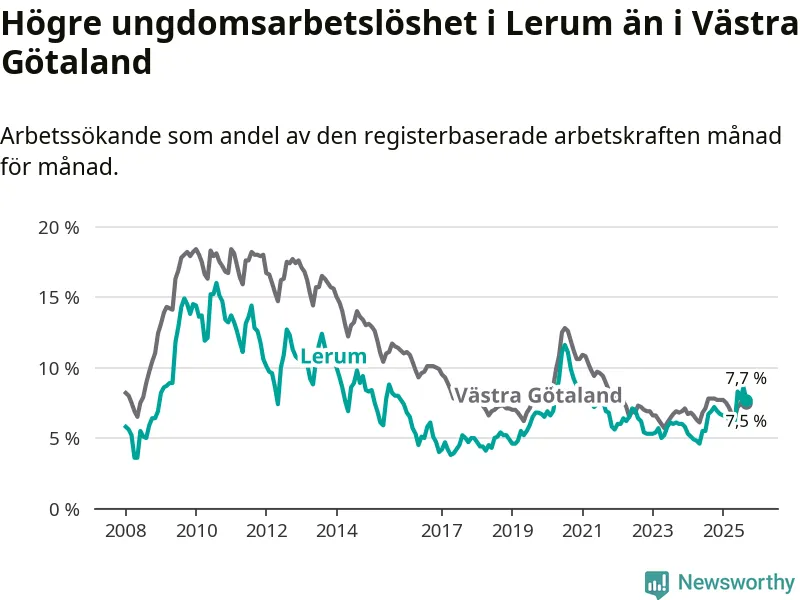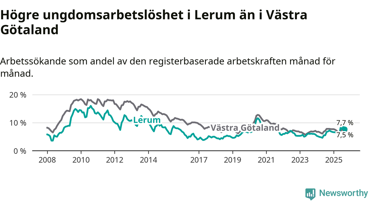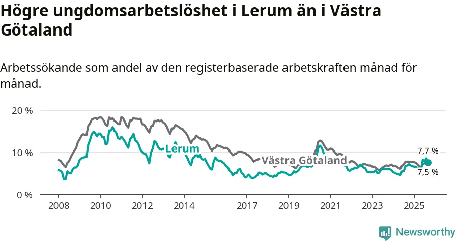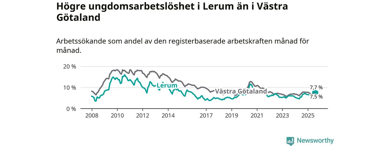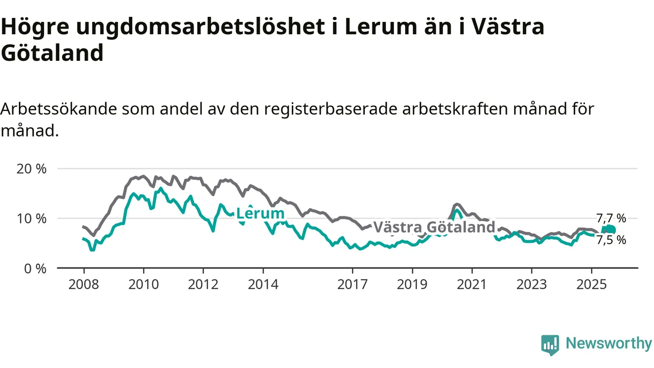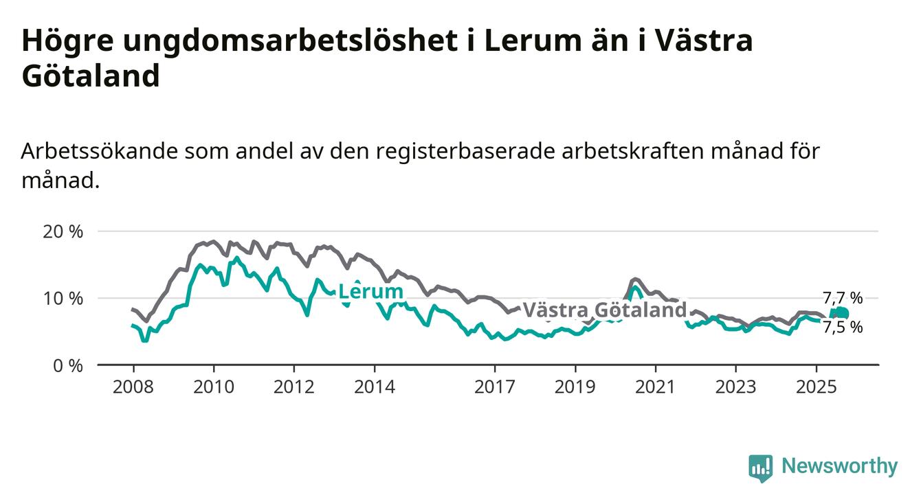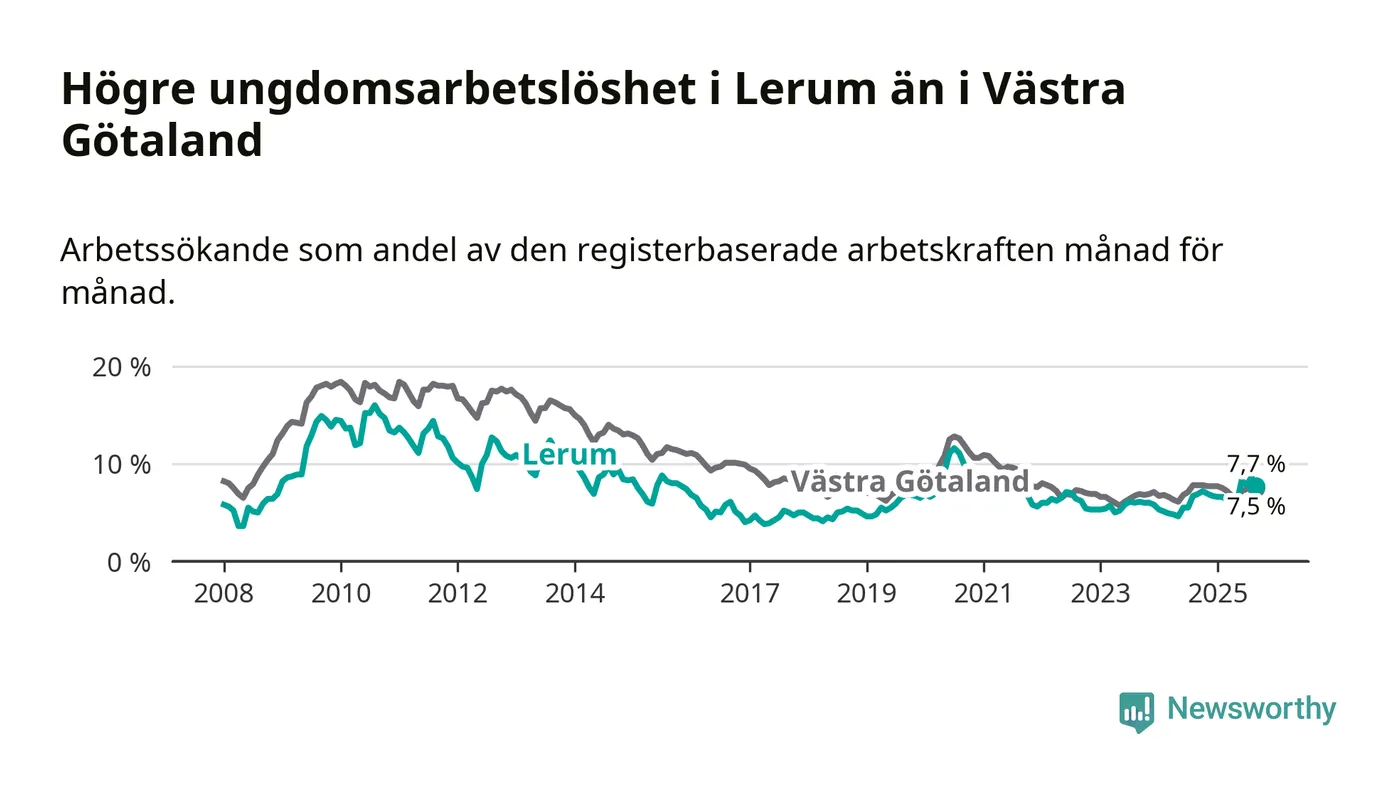 Medan Lerum har lägre total arbetslöshet än Västra Götaland, ligger ungdomsarbetslösheten 0,2 procentenheter högre i Lerum.