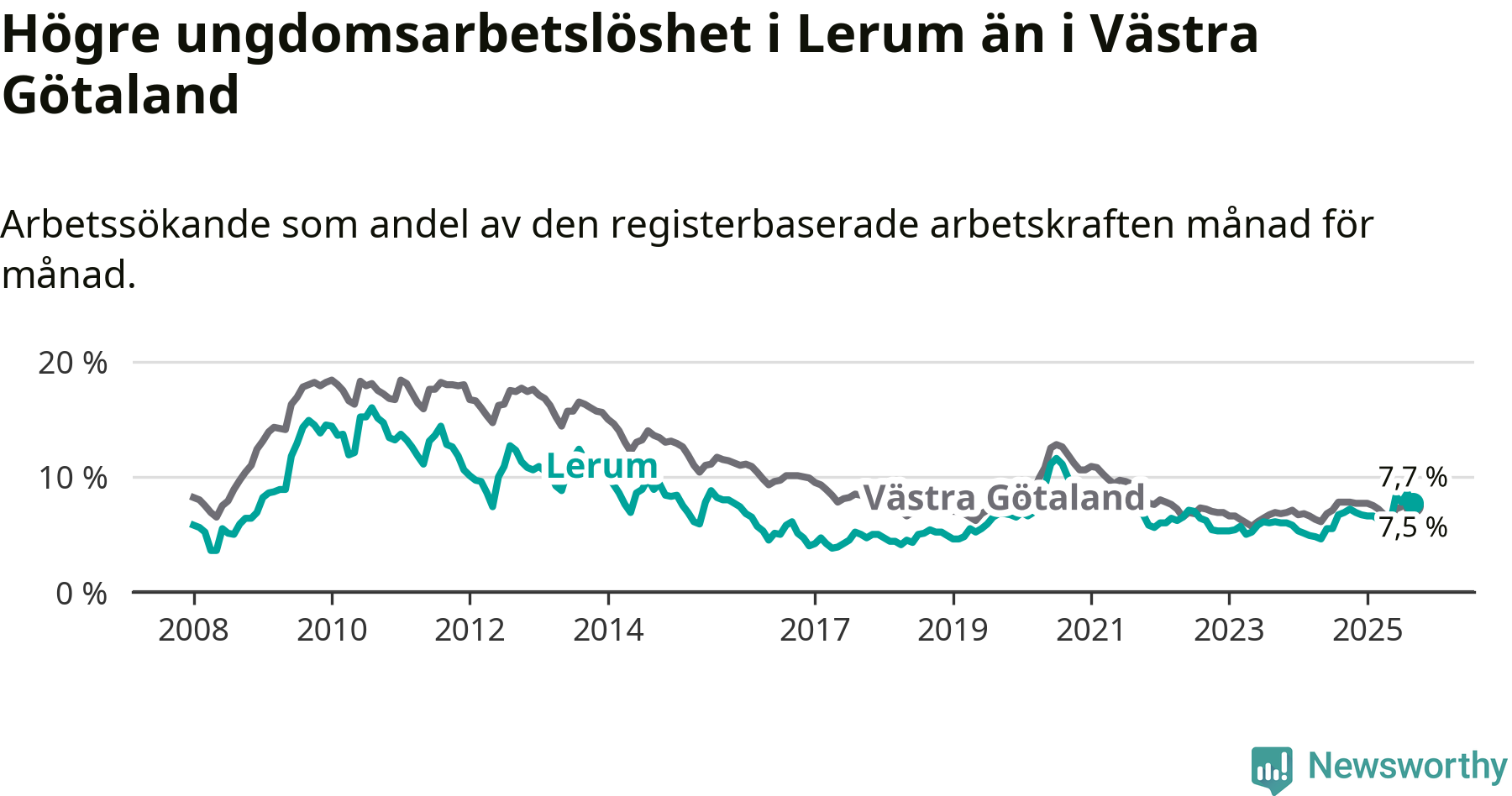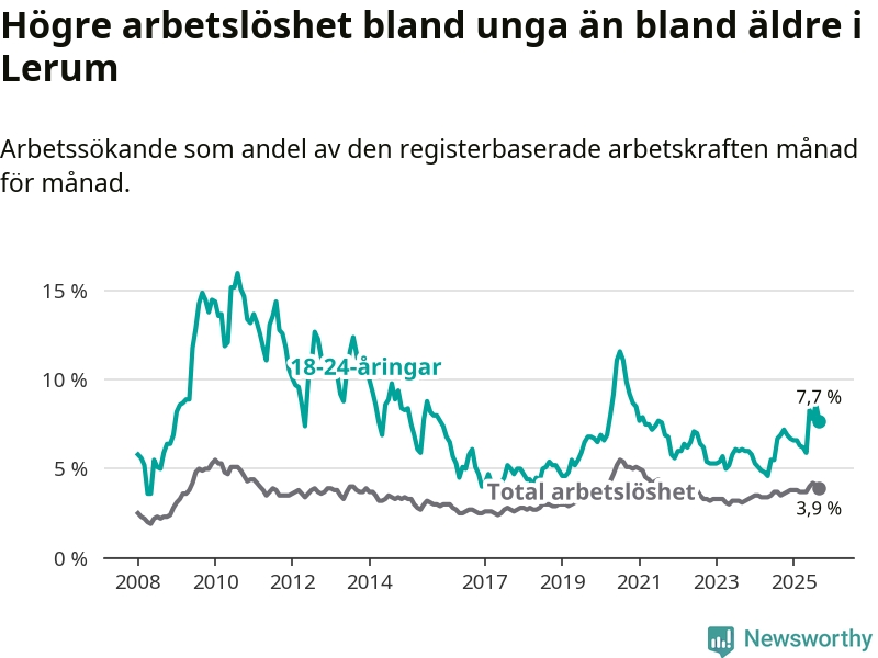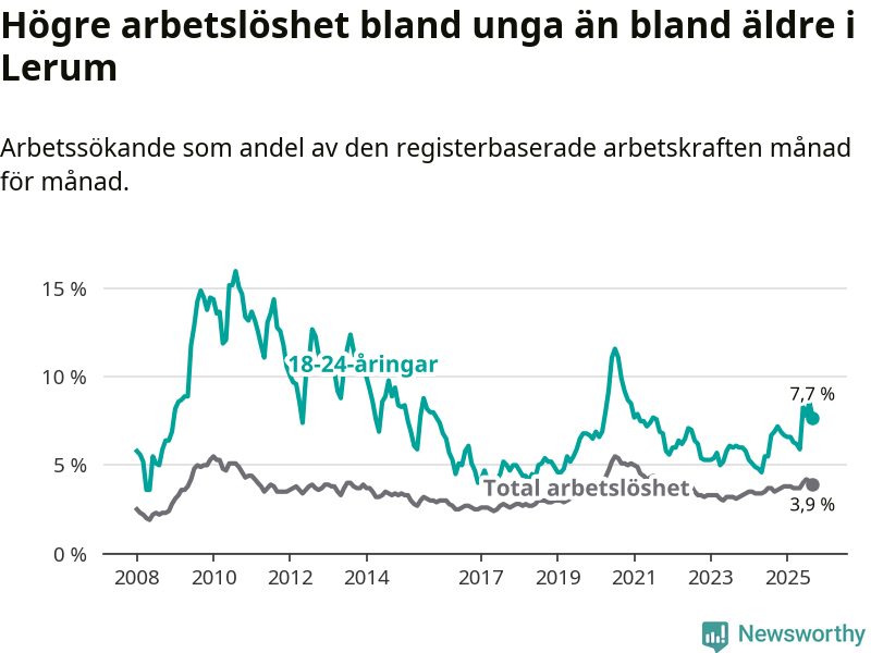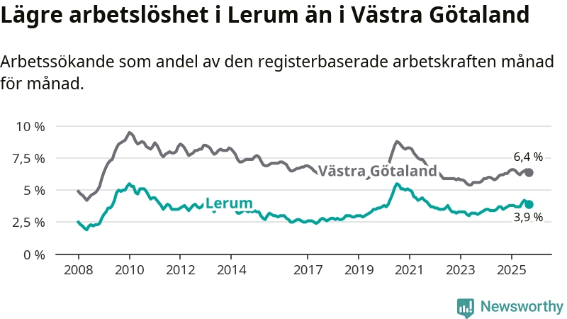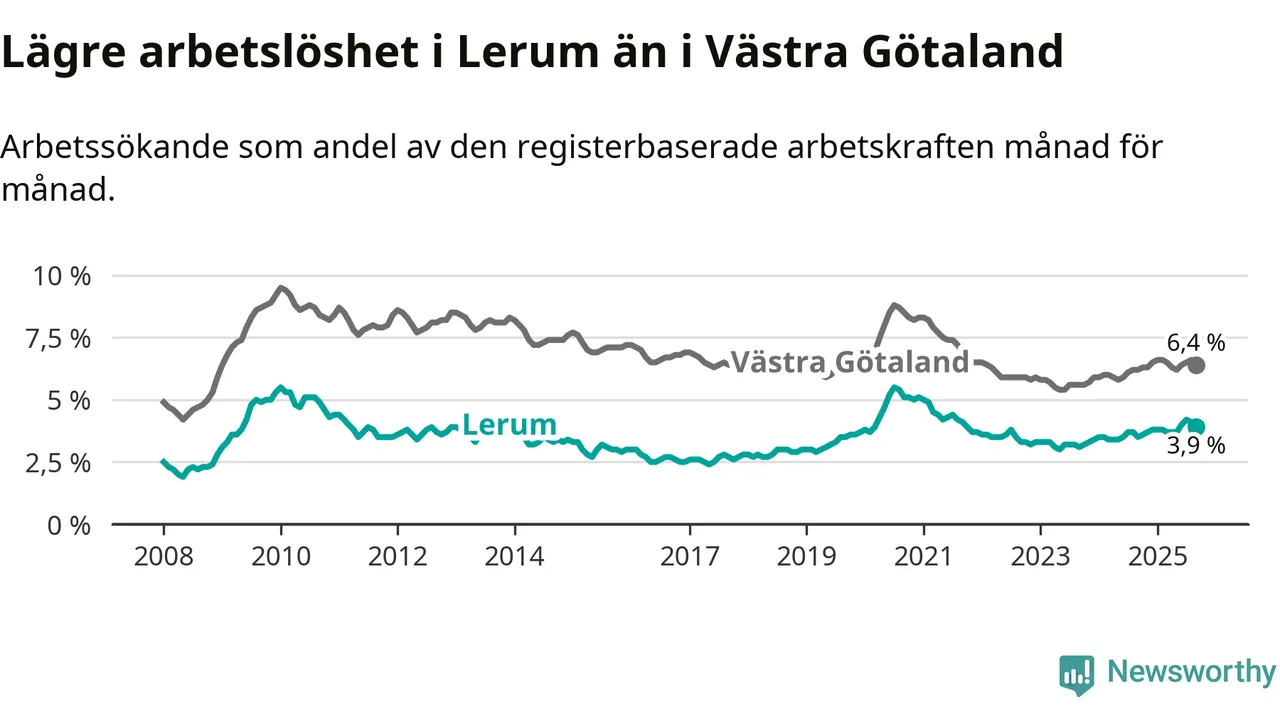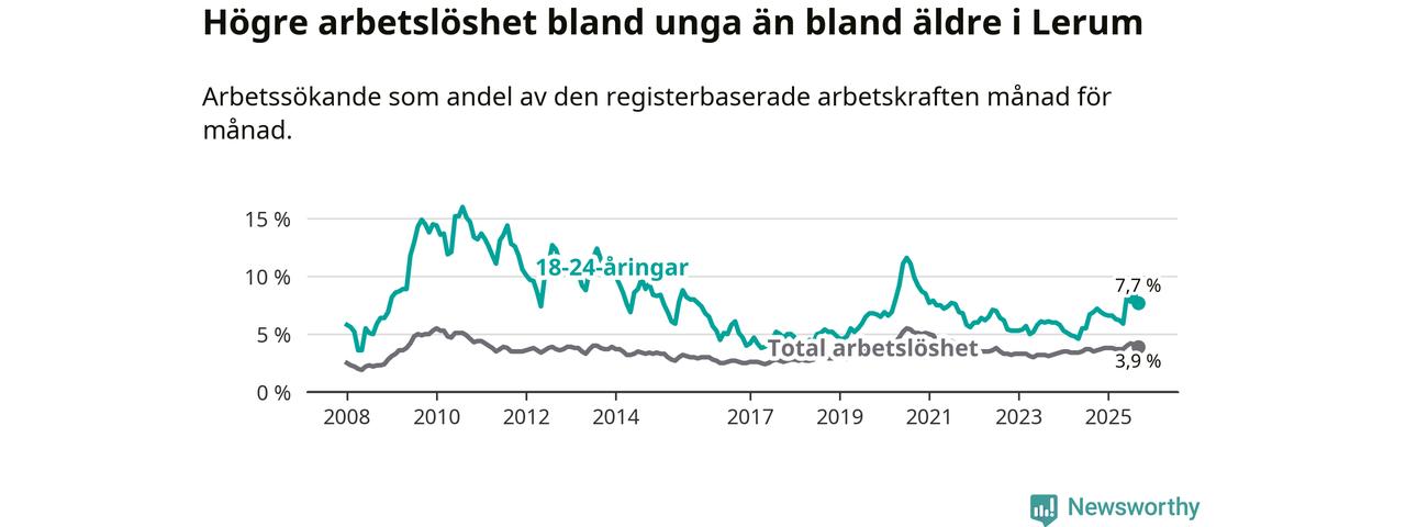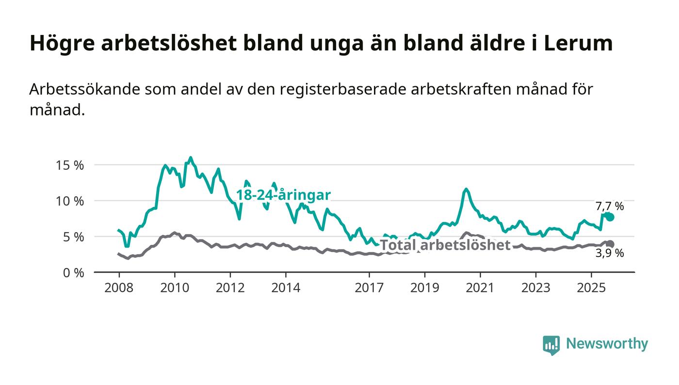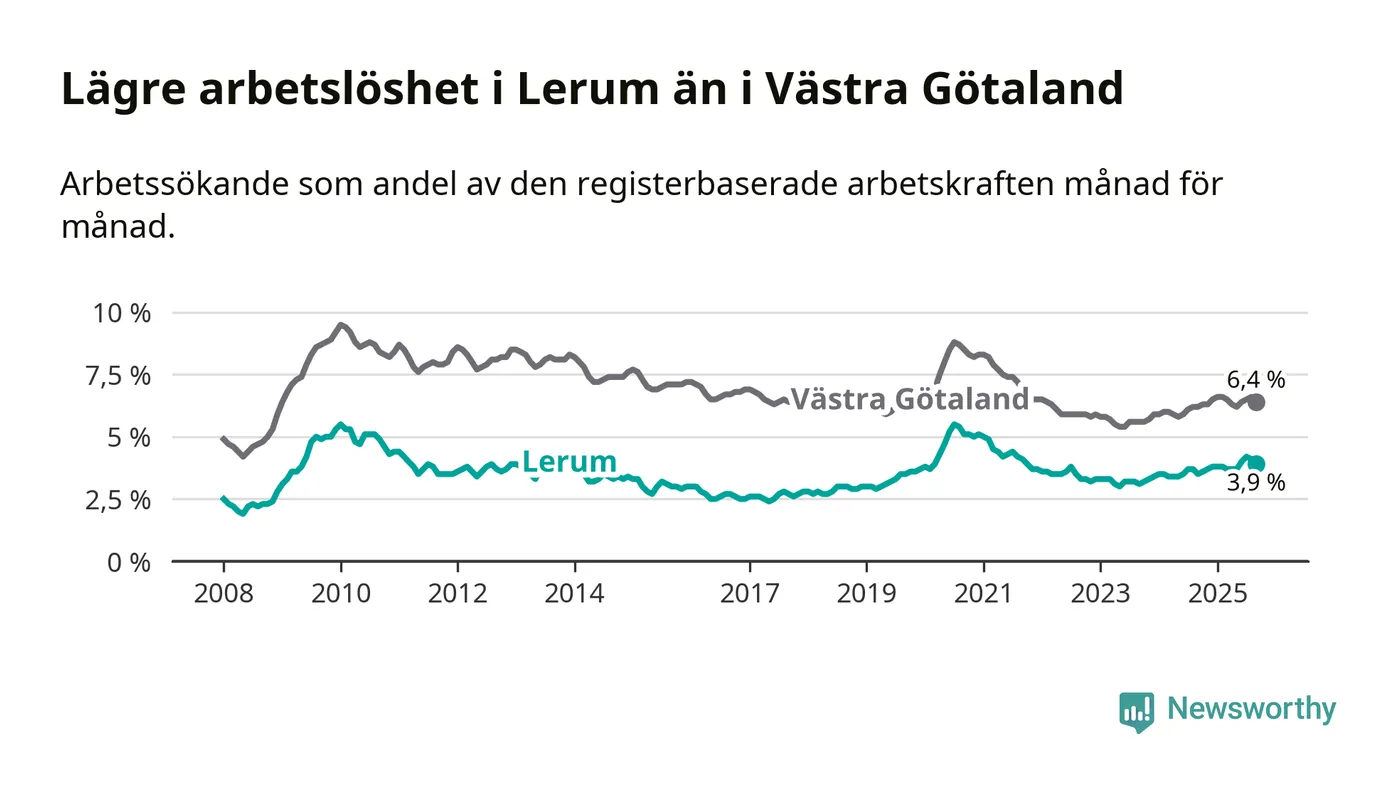 Medan Lerum har lägre total arbetslöshet än Västra Götaland, ligger ungdomsarbetslösheten 0,2 procentenheter högre i Lerum.