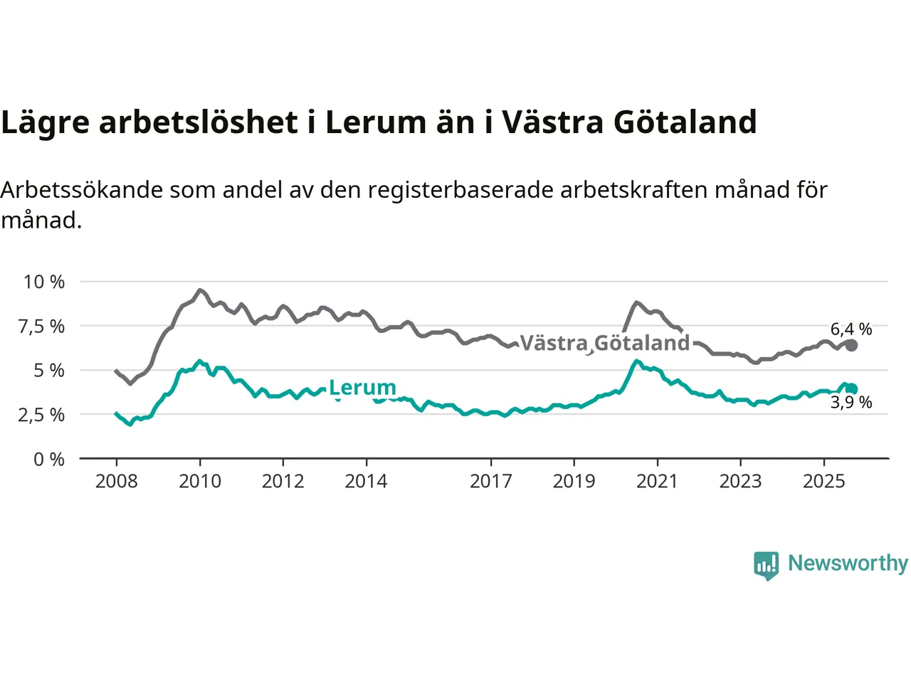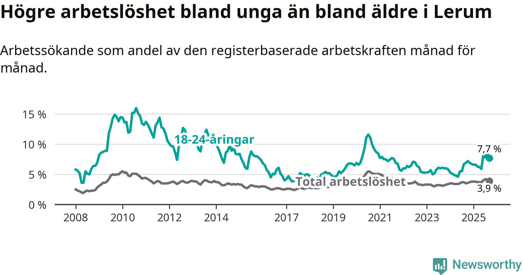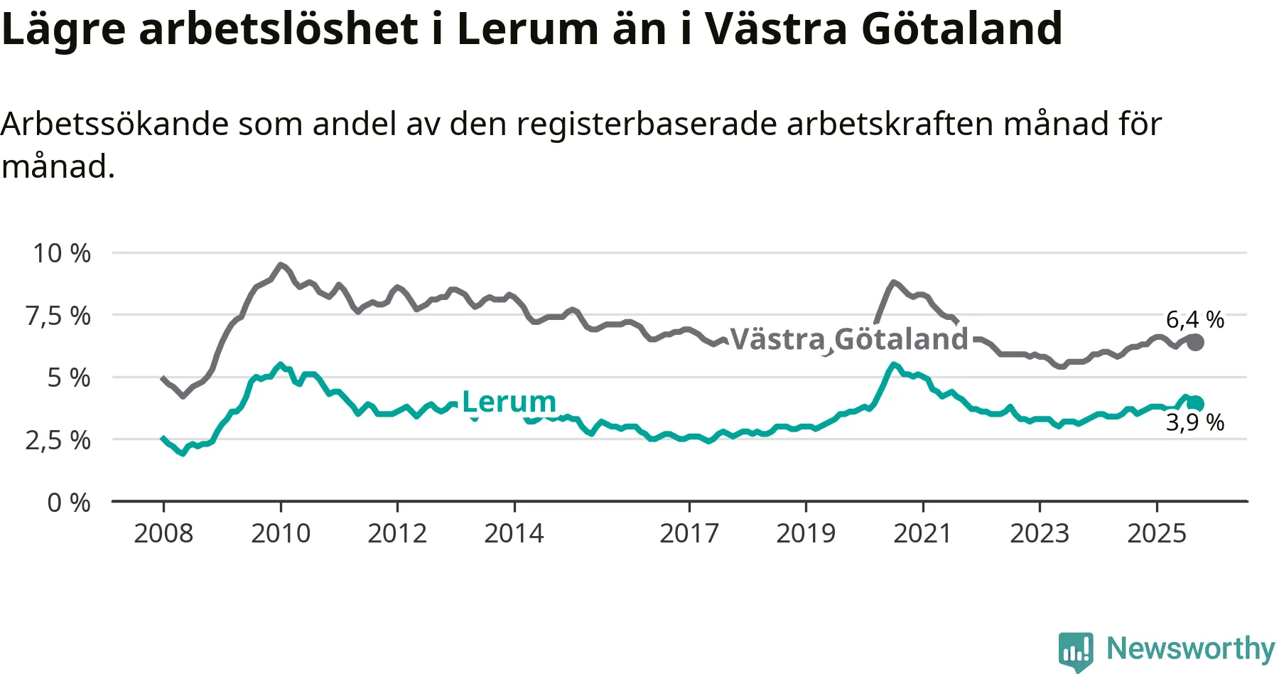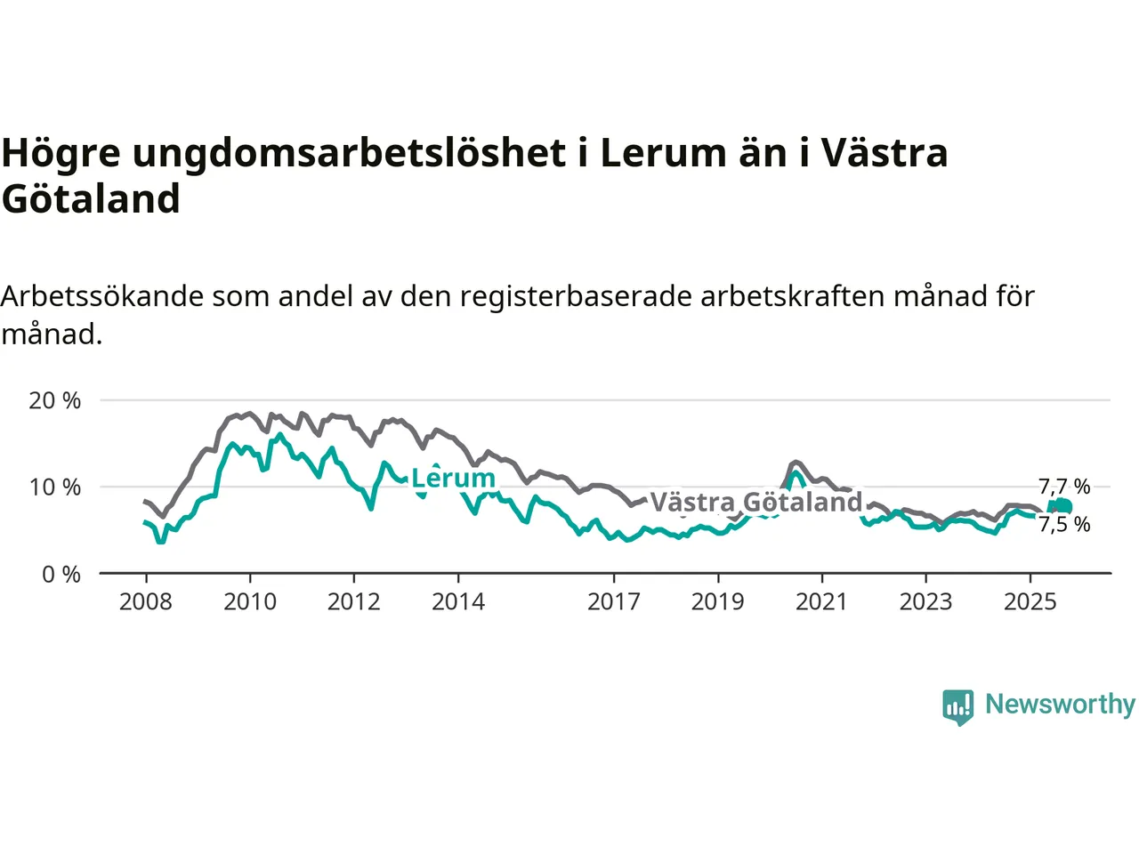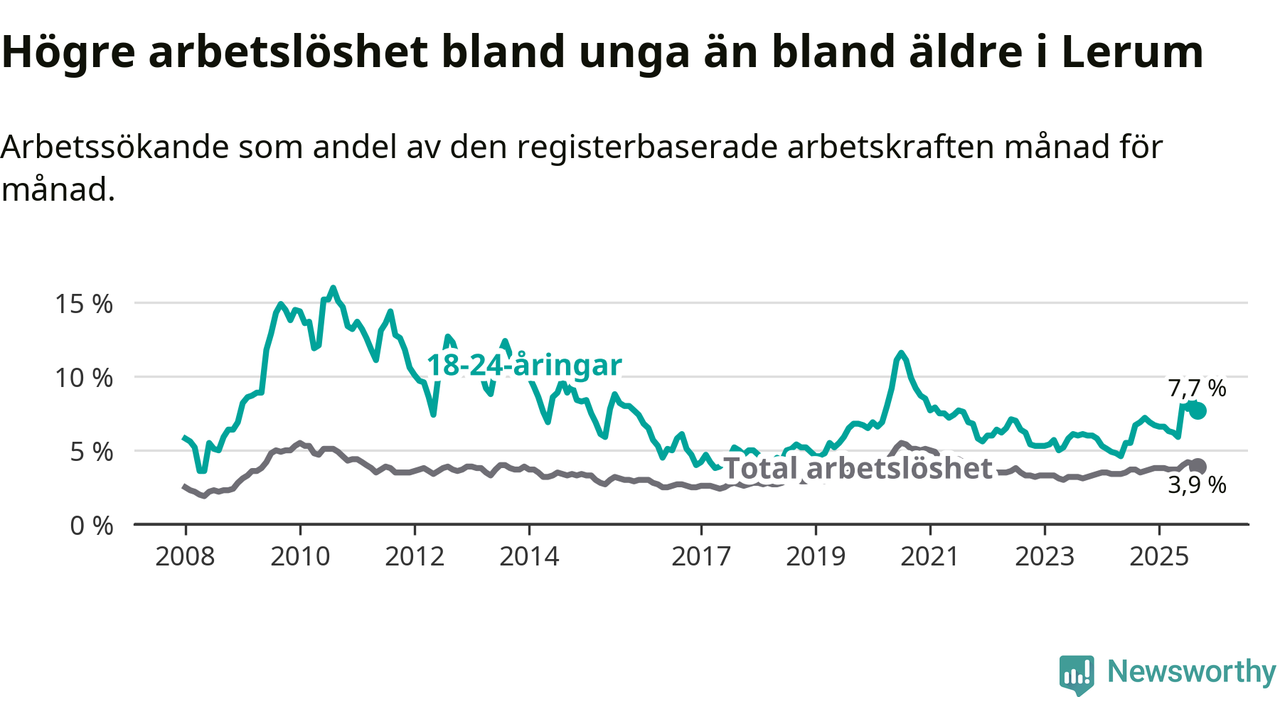 Medan Lerum har lägre total arbetslöshet än Västra Götaland, ligger ungdomsarbetslösheten 0,2 procentenheter högre i Lerum.