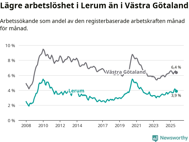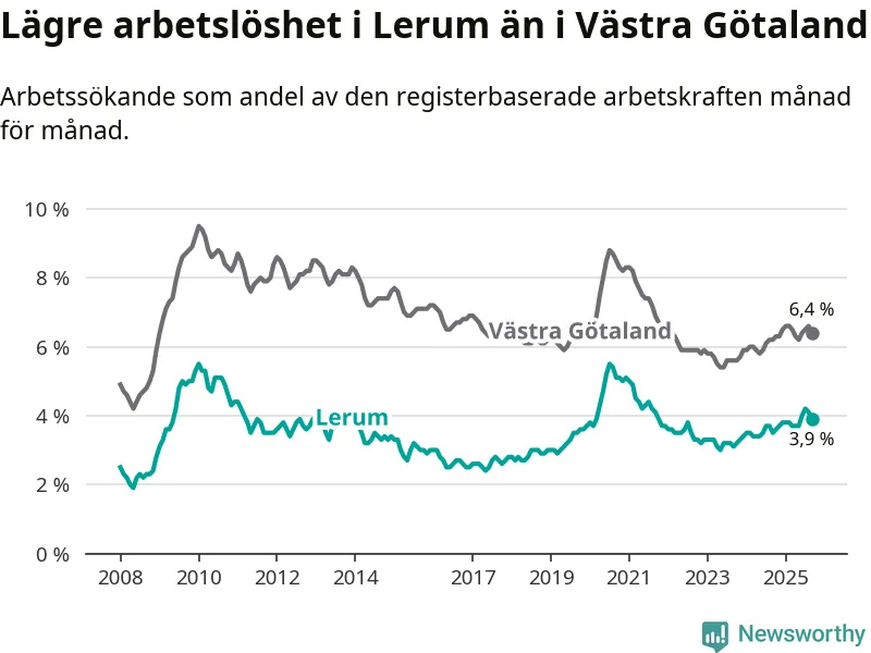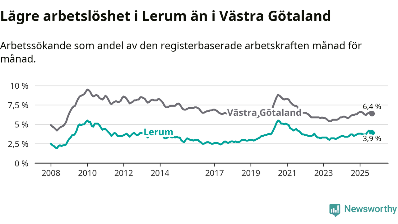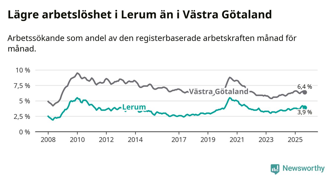 Under september månad rapporterade Lerums kommun en total arbetslöshet på 3,9 procent. Det är en ökning jämfört med samma tidpunkt i fjol (+0,4 procentenheter). Även i Västra Götalands län stiger arbetslösheten .